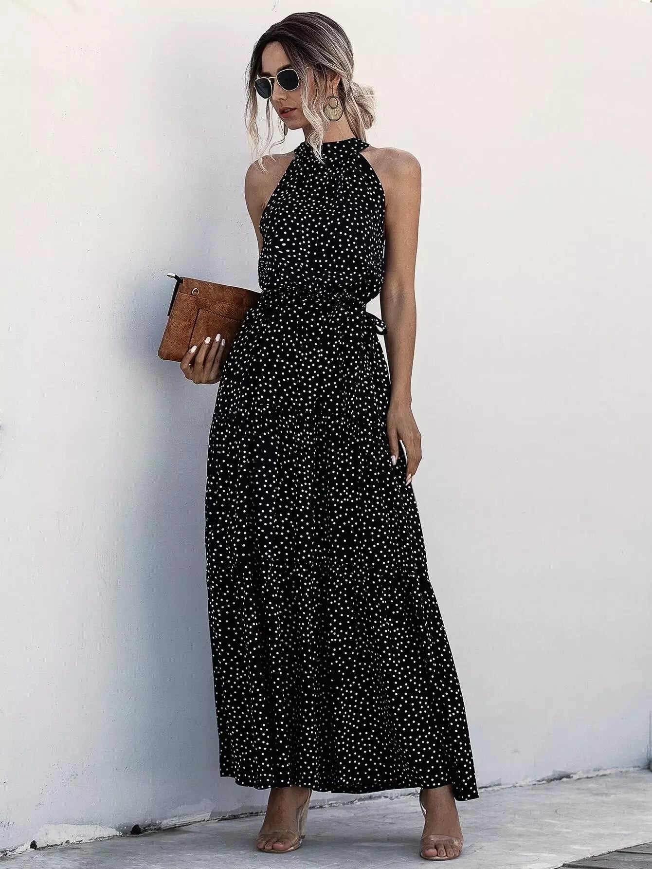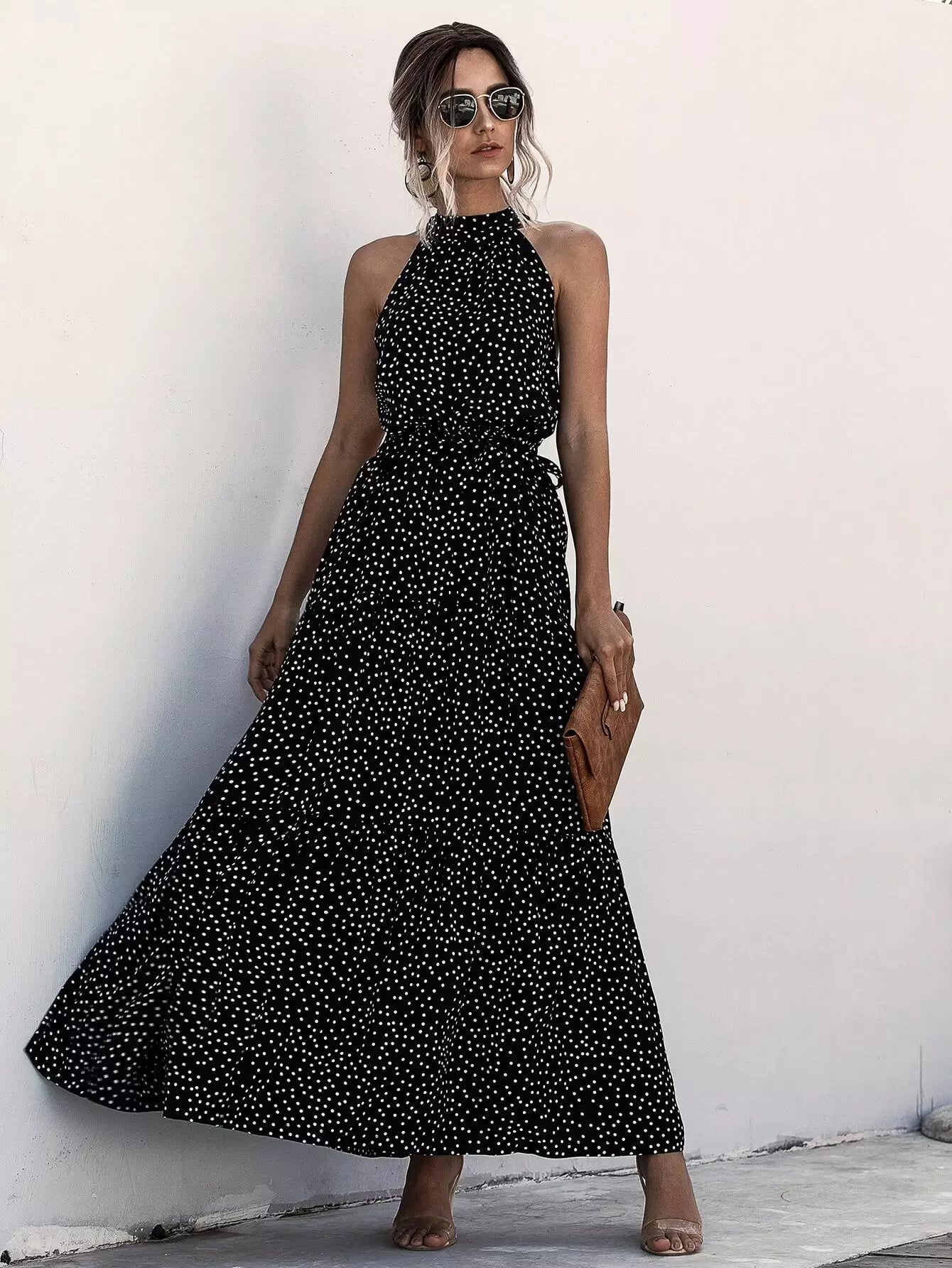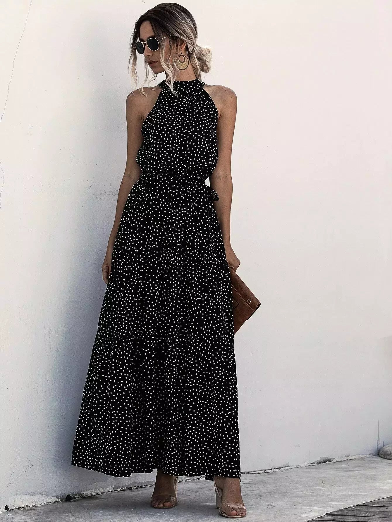 فستان ماكسي منقّط بربطة عنق ذات ربطة عنق ذات رسن طويل