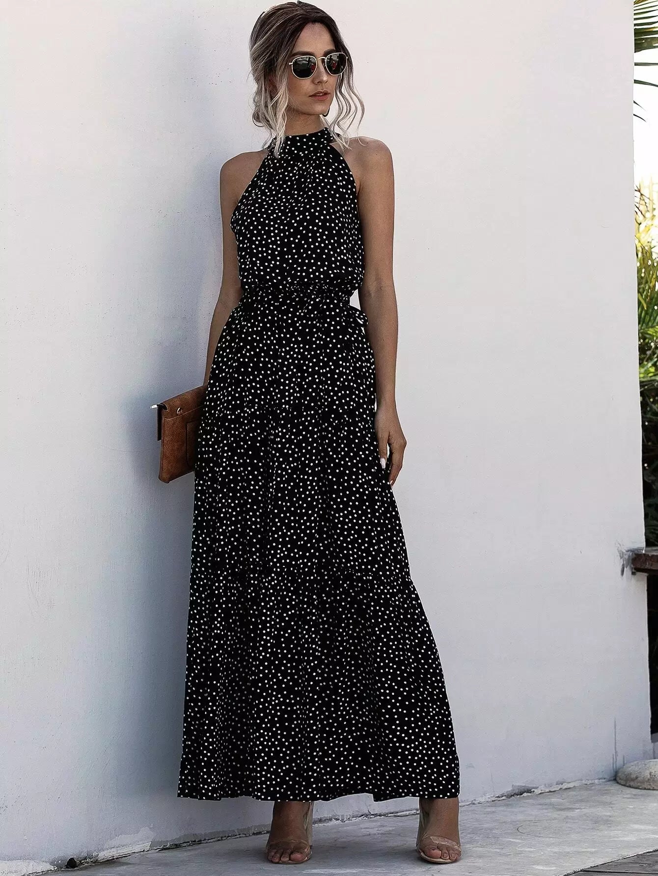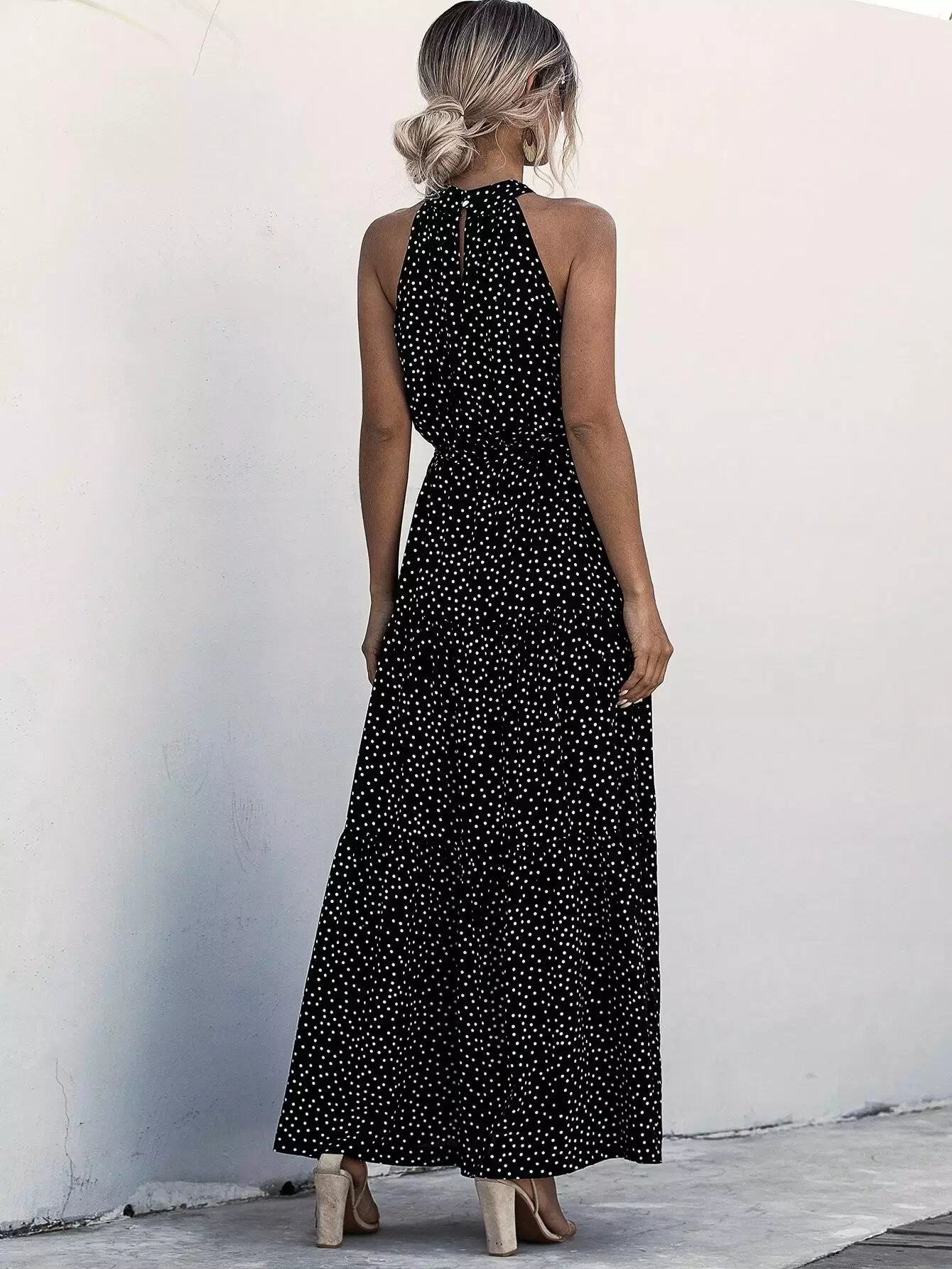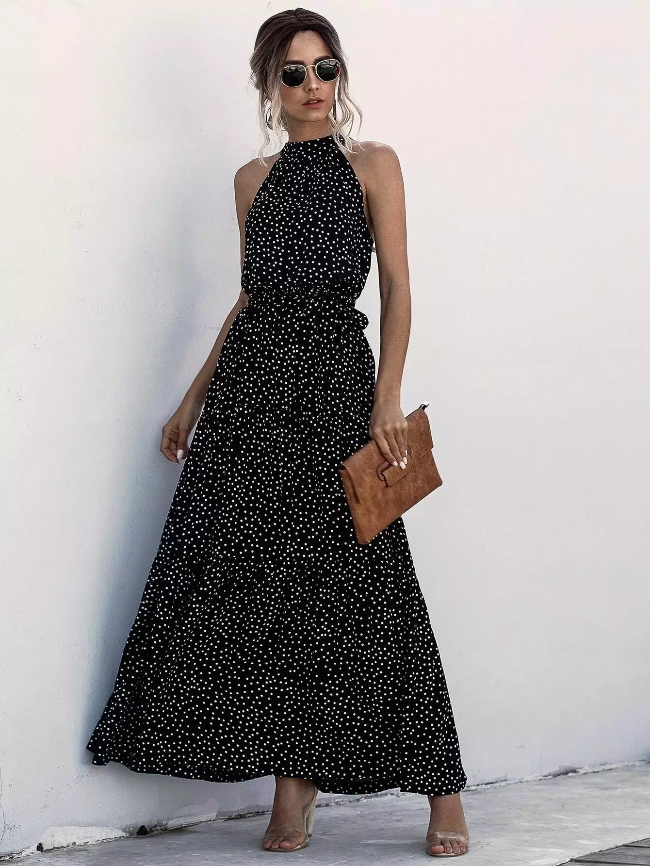 فستان ماكسي منقّط بربطة عنق ذات ربطة عنق ذات رسن طويل