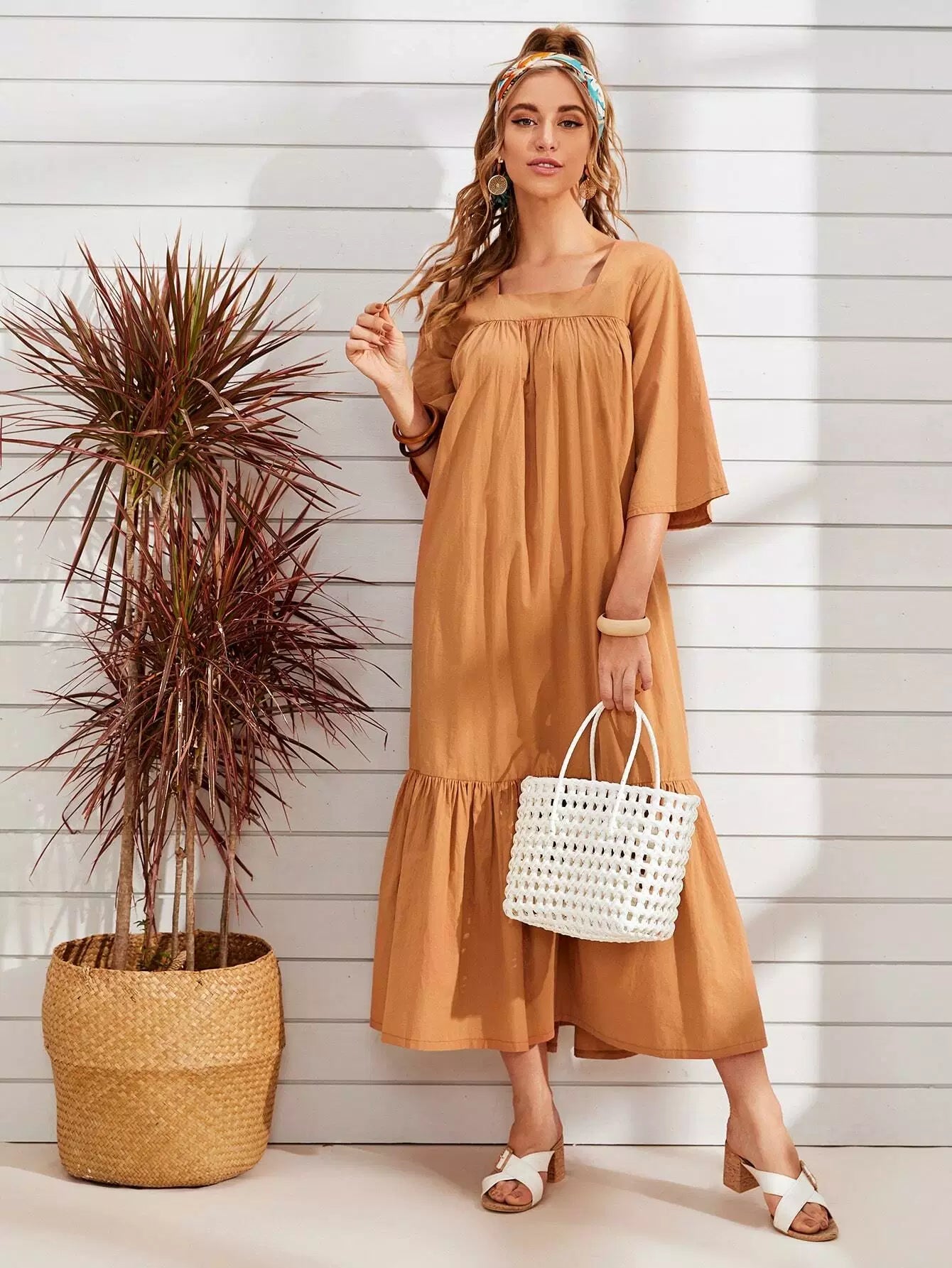 فستان طويل برقبة مربعة برقبة مربعة بحافة منفوشة