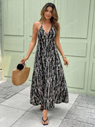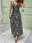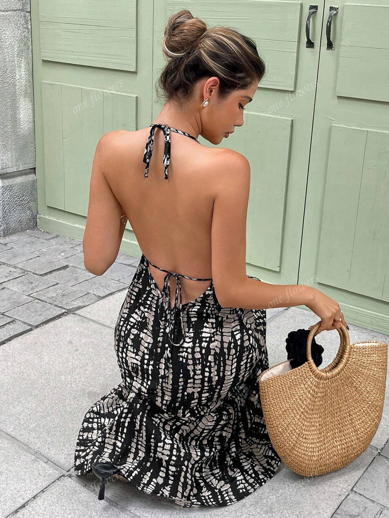 فستان صيفي عصري بطبعة مموجة وحزام رباط بدون ظهر