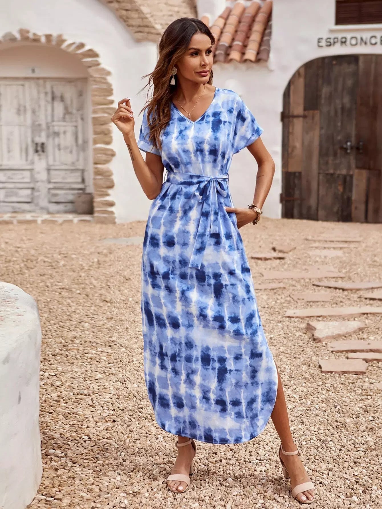فستان تونيك بجيوب جانبية مائلة ومصبوغ بصبغة التعادل بدون حزام