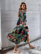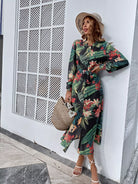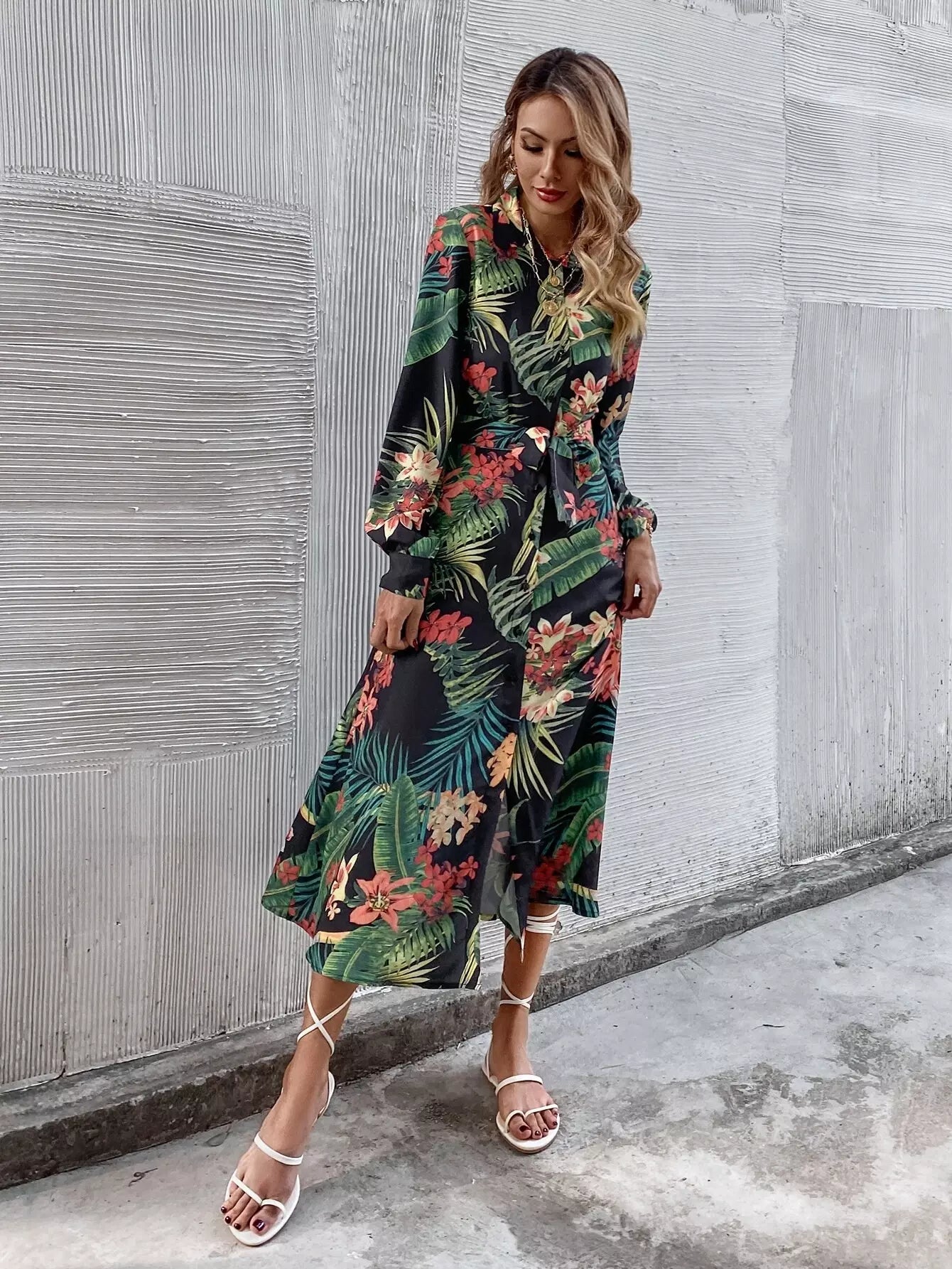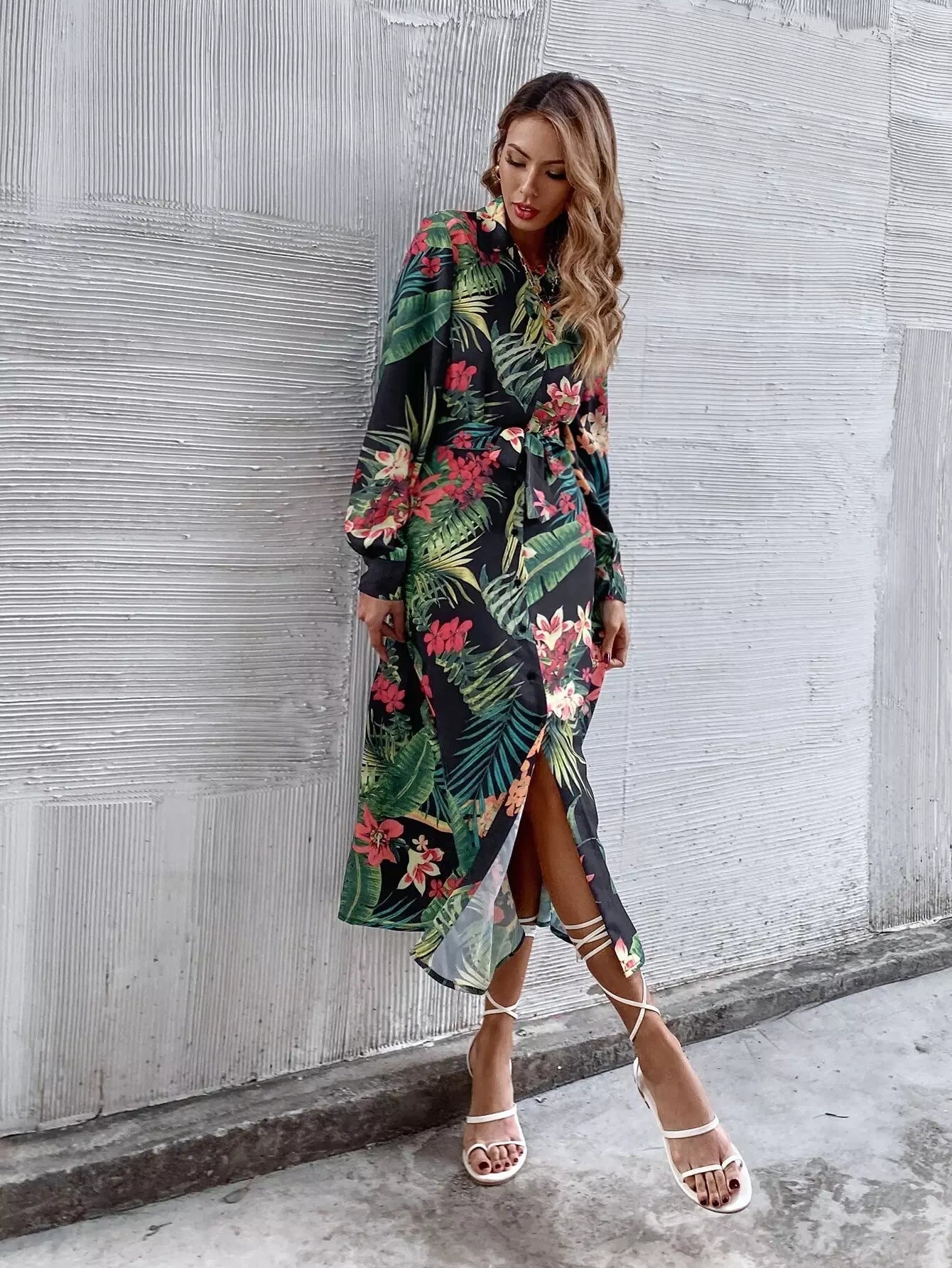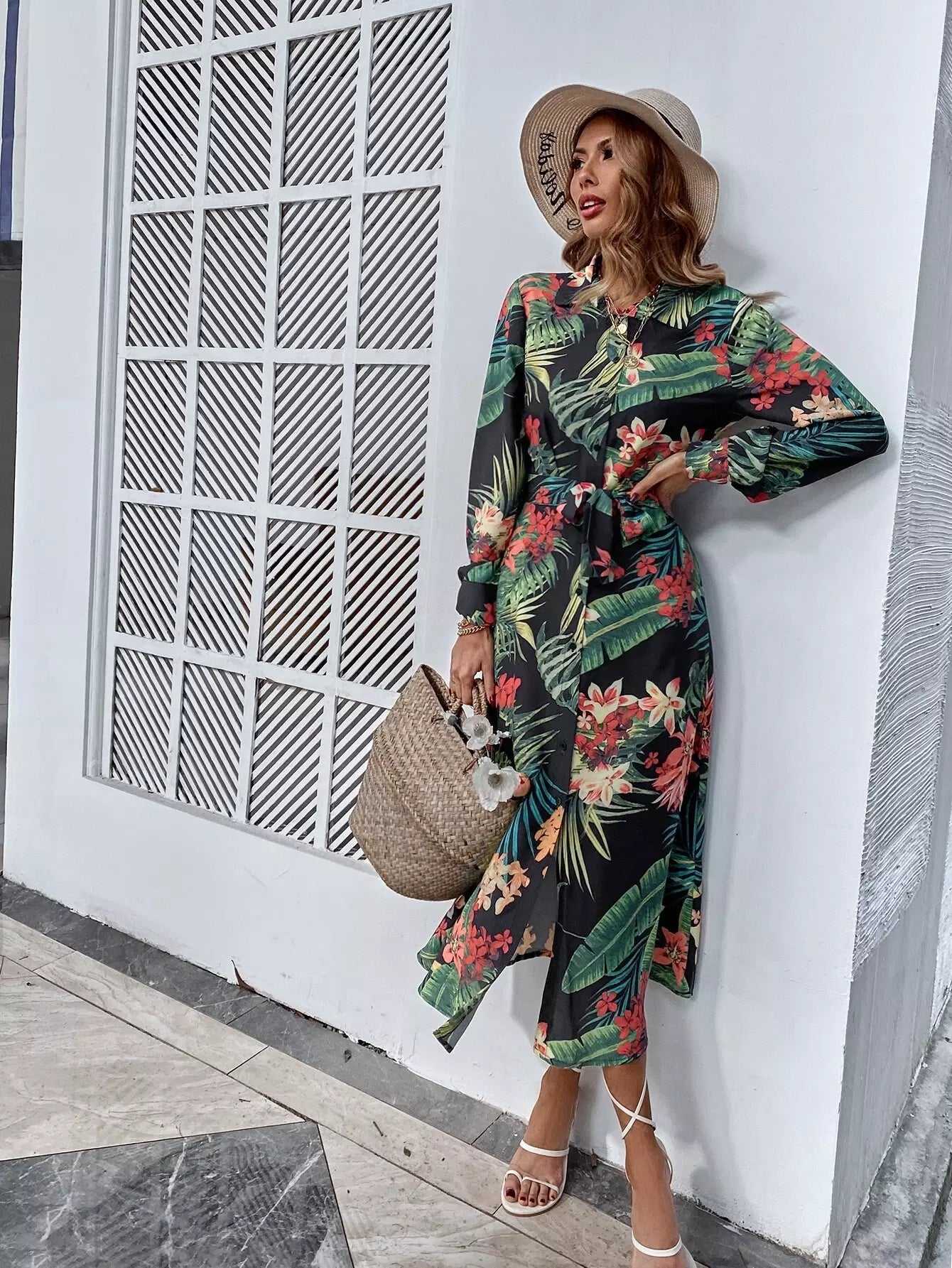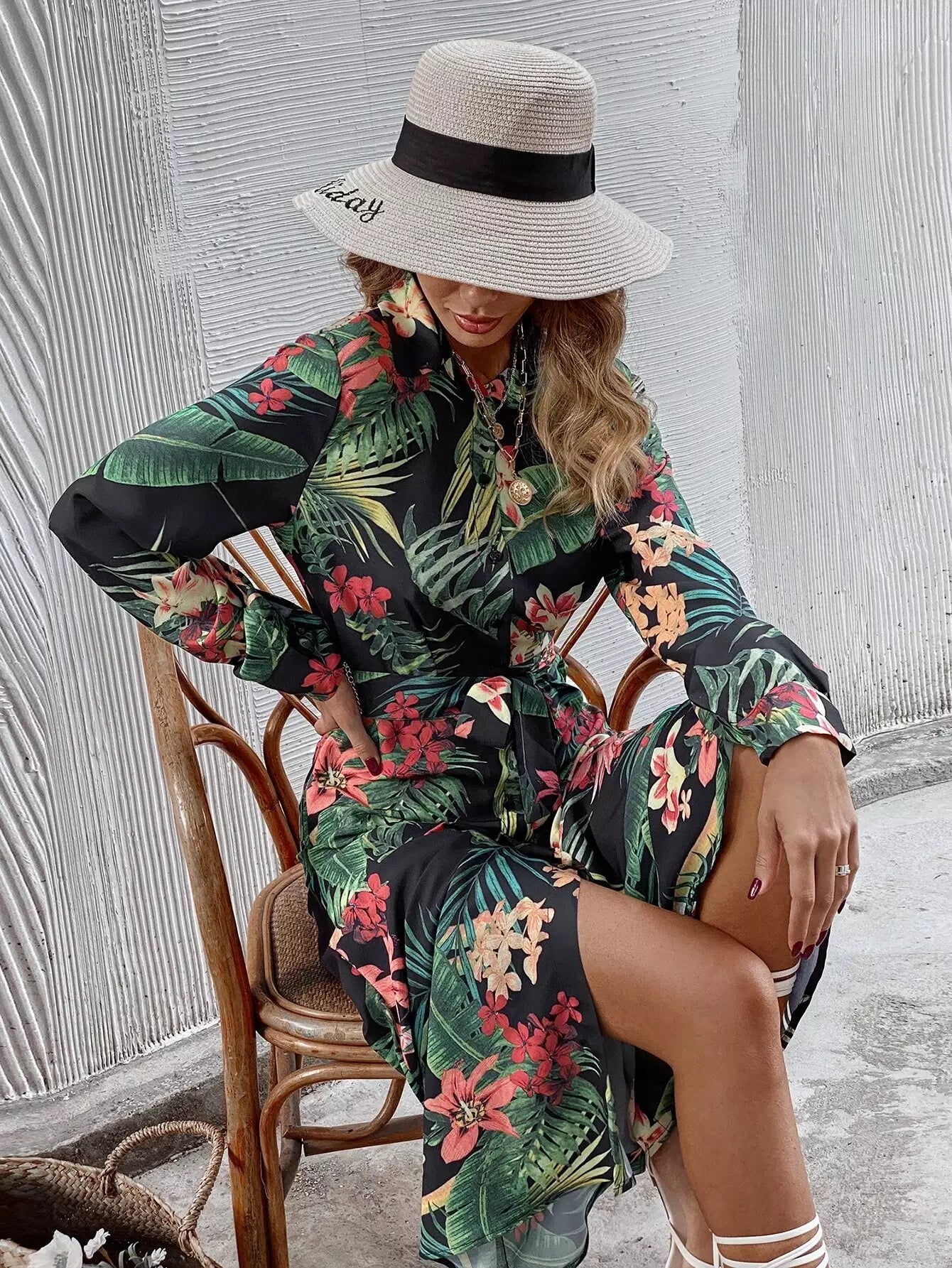 فستان بطبعة استوائية بربطة عنق على شكل ربطة عنق