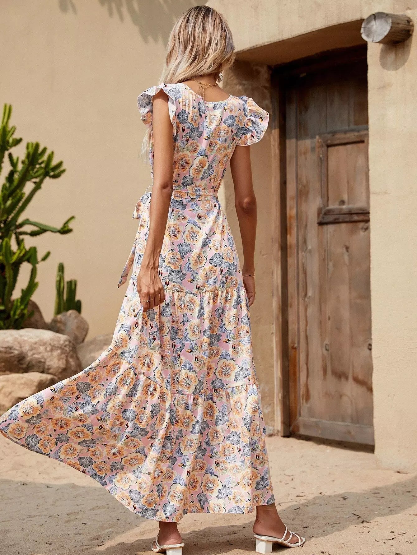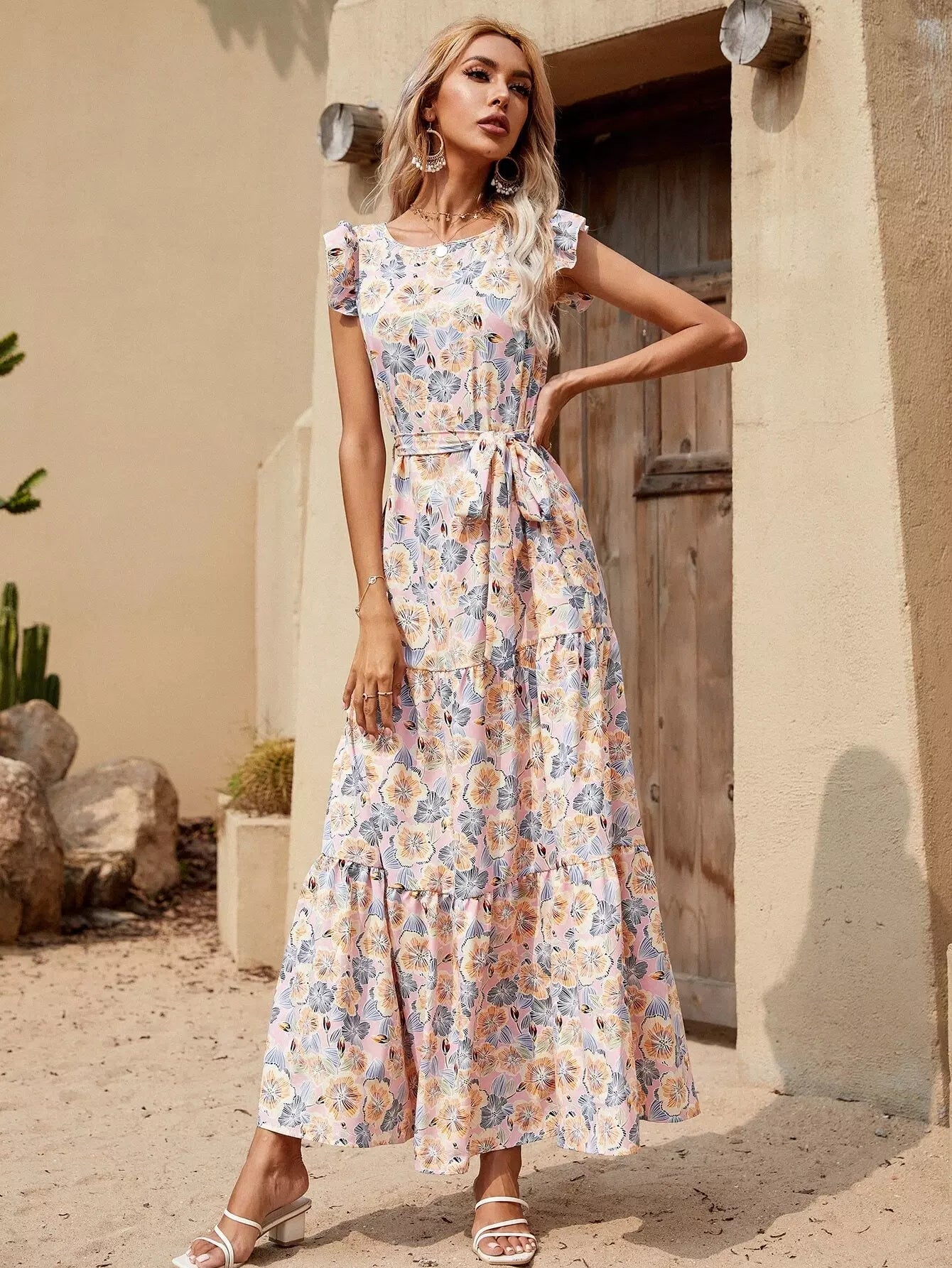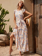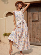 فستان مزين بطبعة زهور مطبوع فوقه ربطة عنق ذاتي
