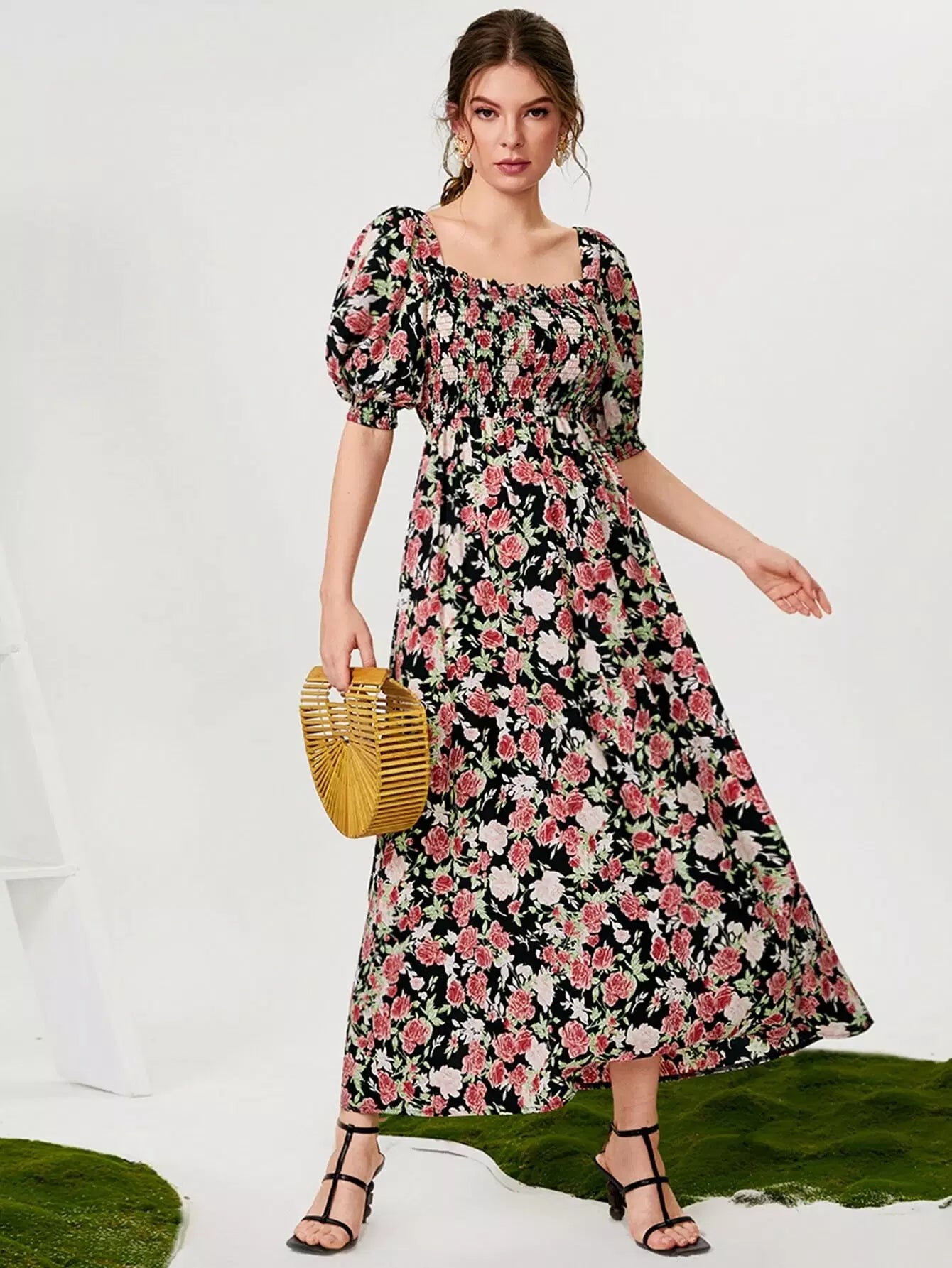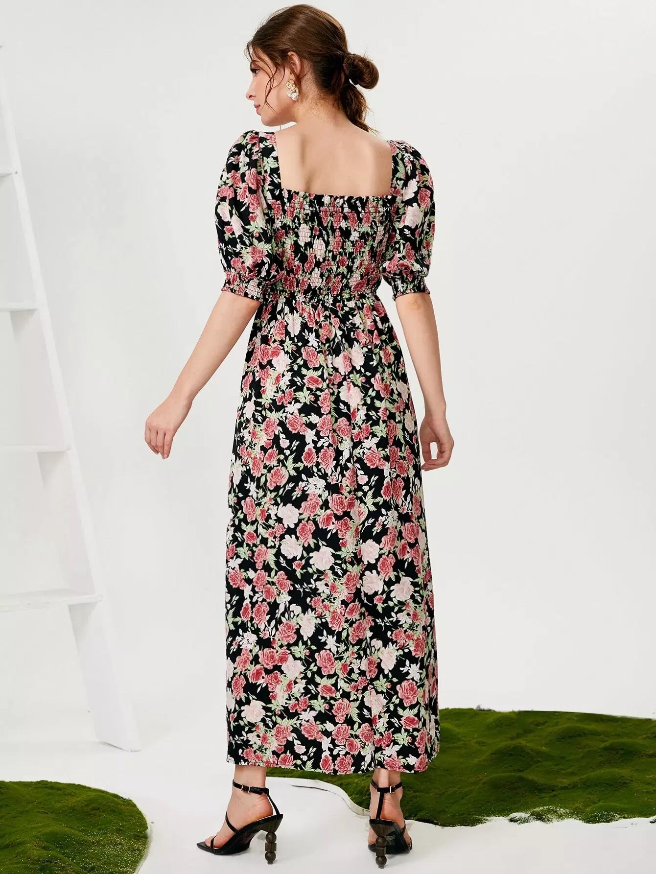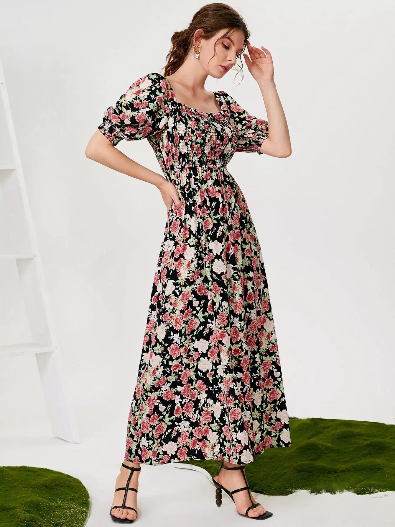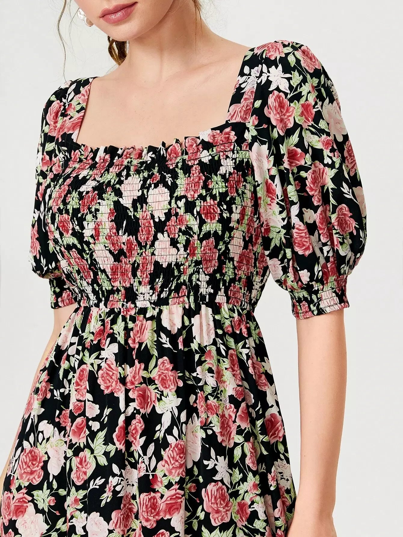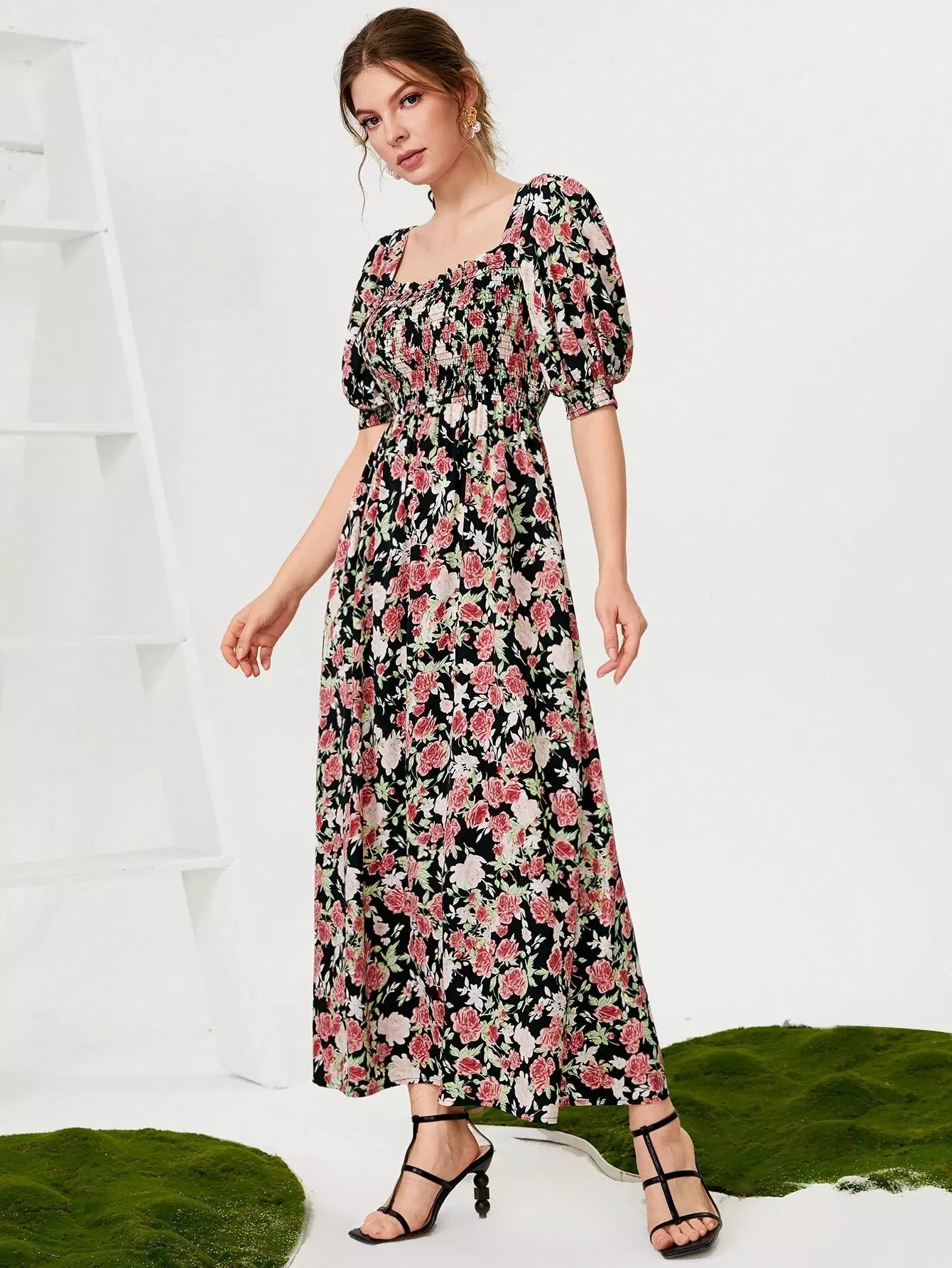 فستان مزين بطبعة زهور مطبوع عليه بالكامل