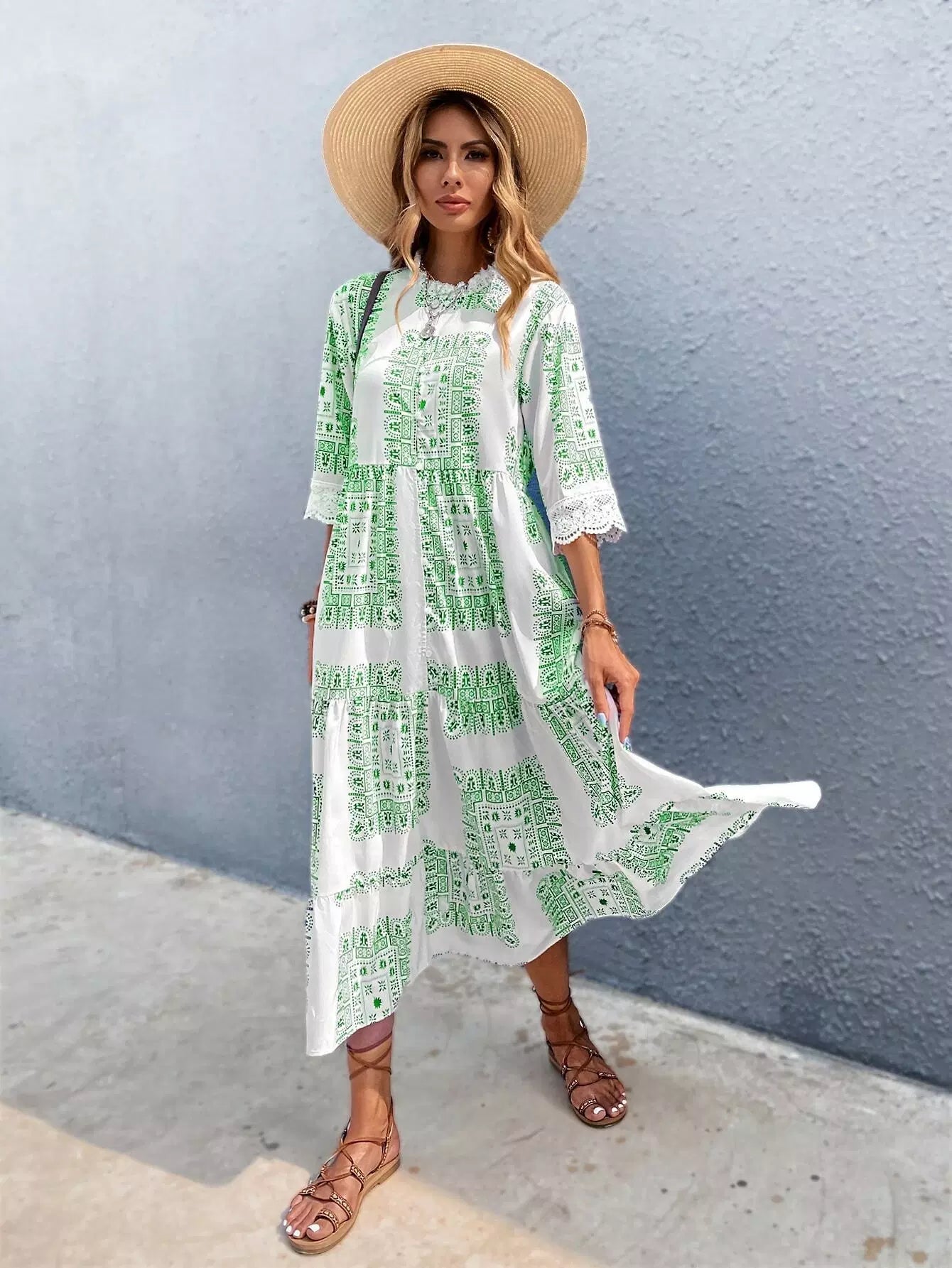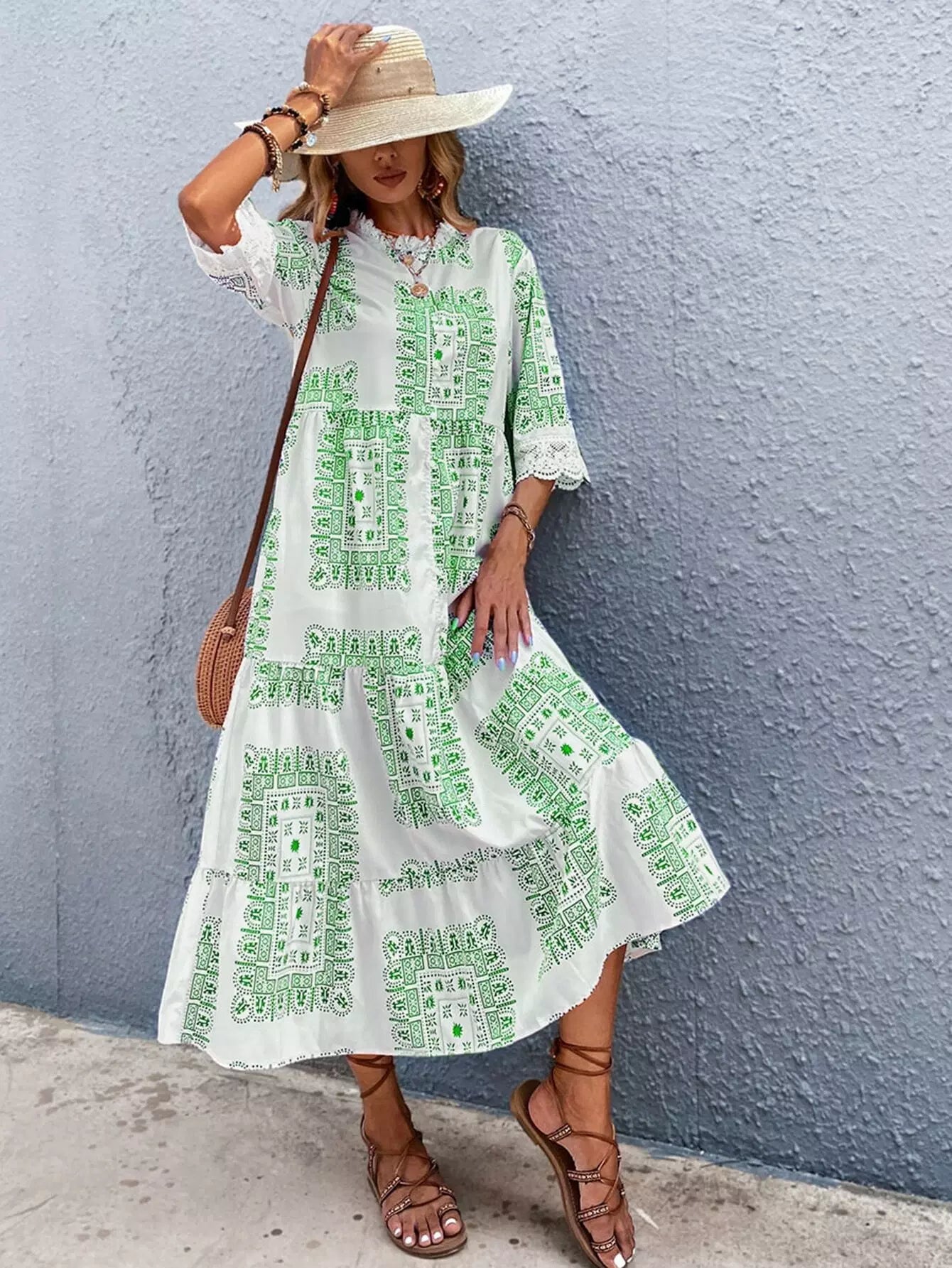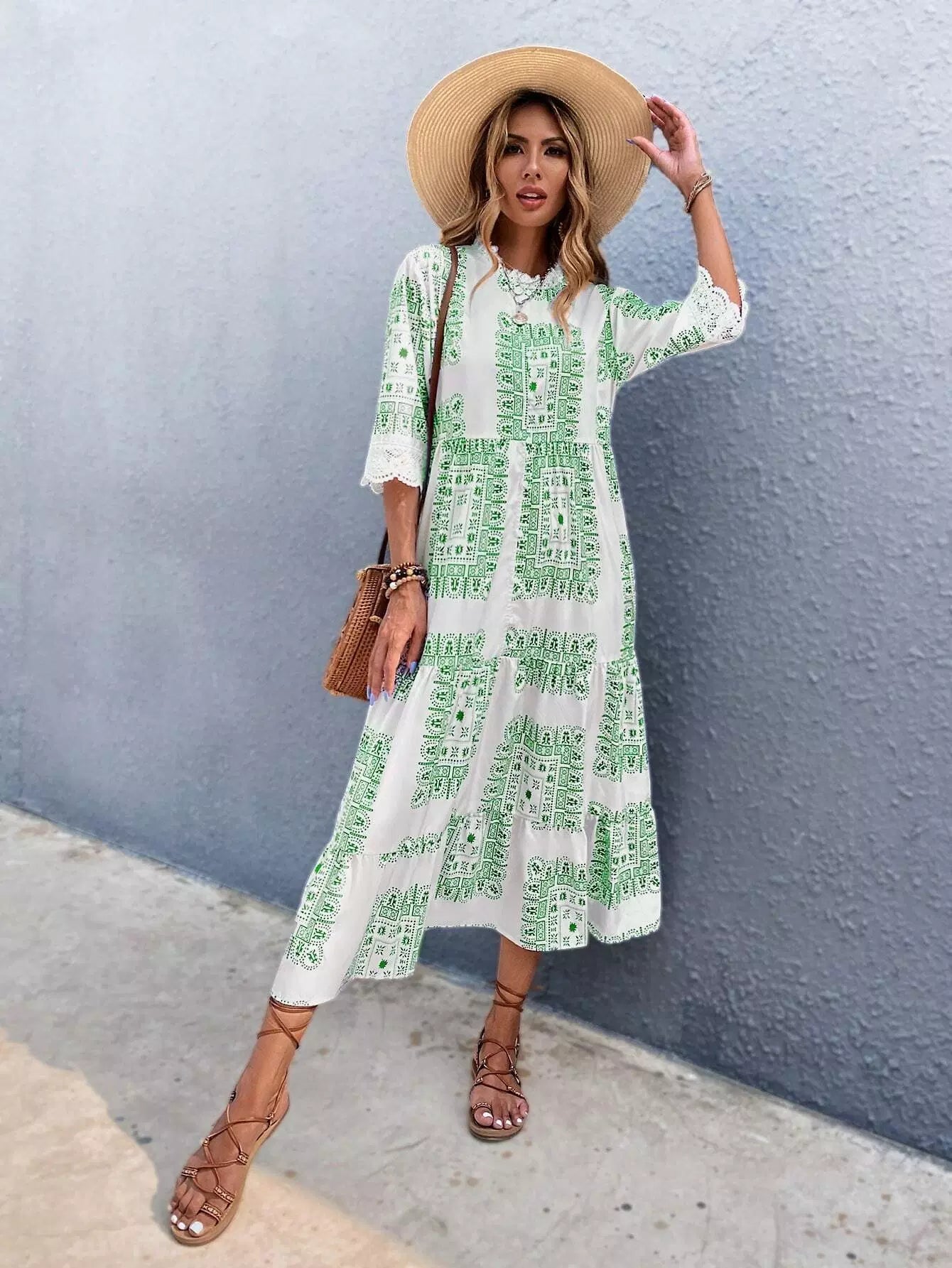 فستان بطبعة كاملة مع كشكشة على الرقبة
