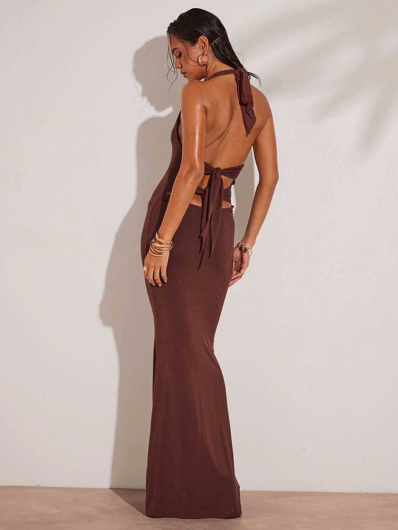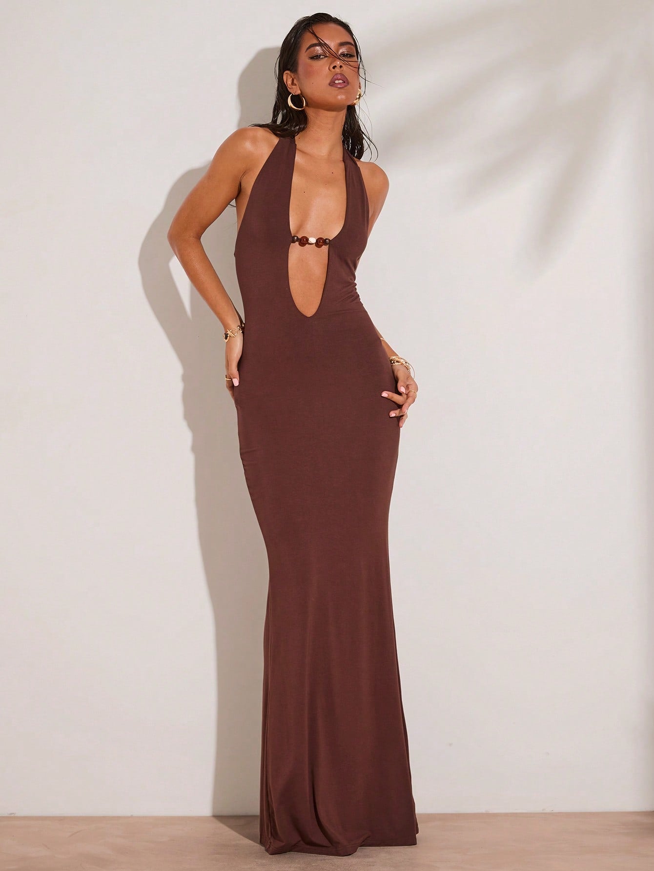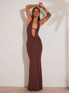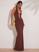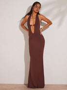فستان ماكسي نسائي من BAE ربيعي وصيفي، بني، بتصميم رقبة هالتر، مزين بالخرز، ضيق صيفي