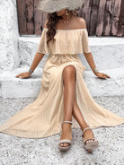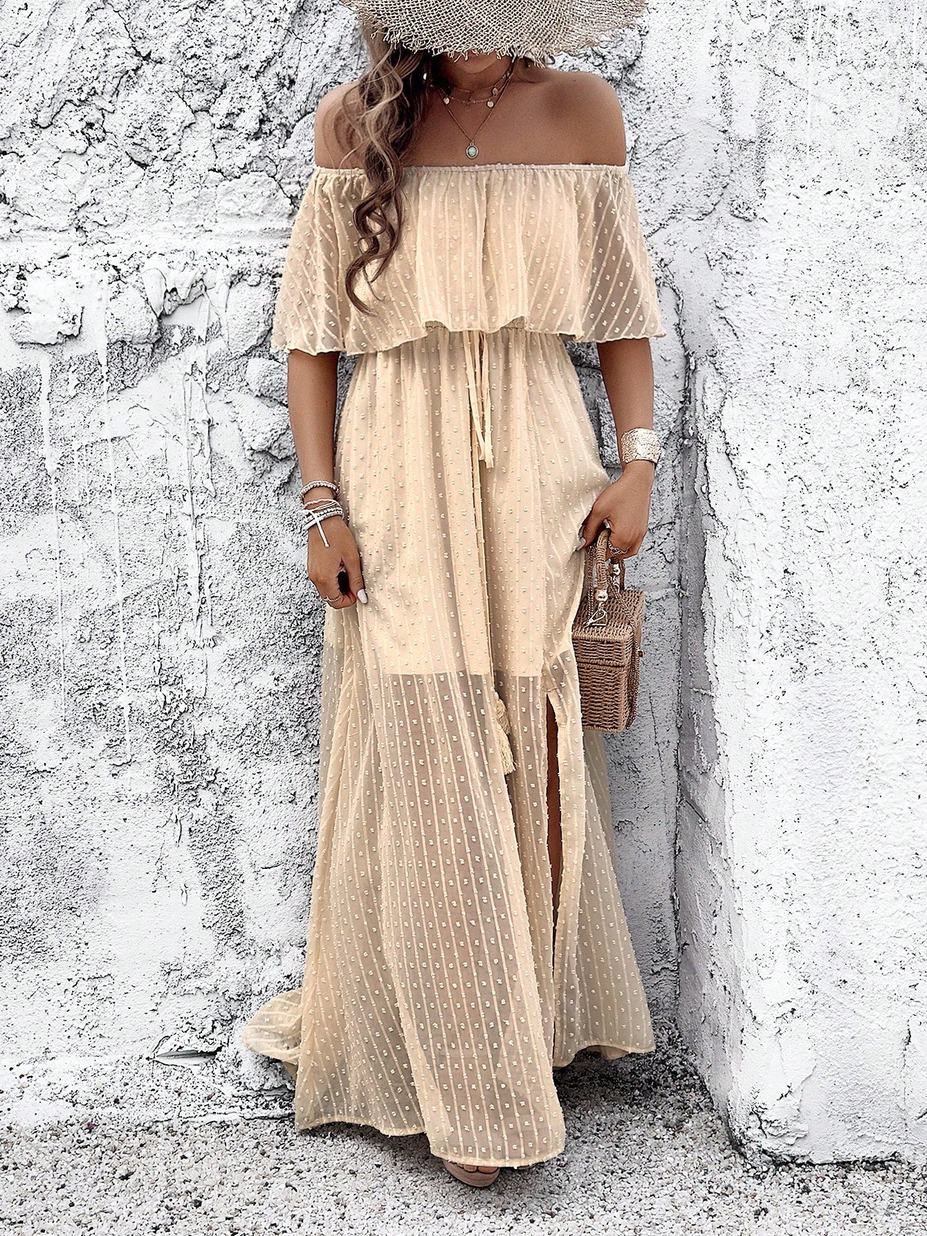 فستان ماكسي نسائي من بريزايا، مكشوف الكتفين، بنقشة البولكا السويسرية وفتحة عالية، مثالي لإطلالة شاطئية أنيقة في العطلات