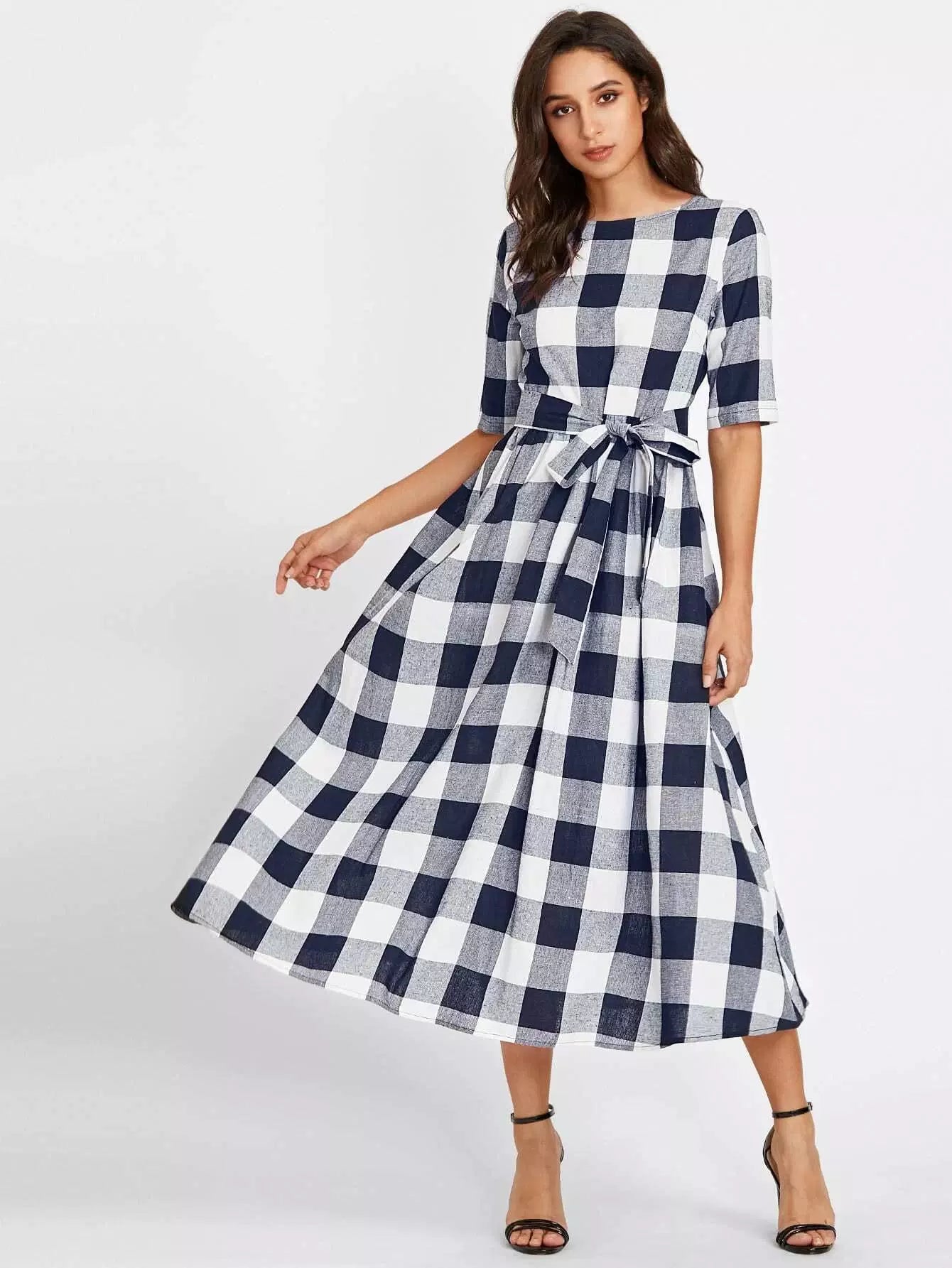 فستان بافالو منقوش بأزرار منقوشة بفتحة أزرار وربطة عنق ذاتية