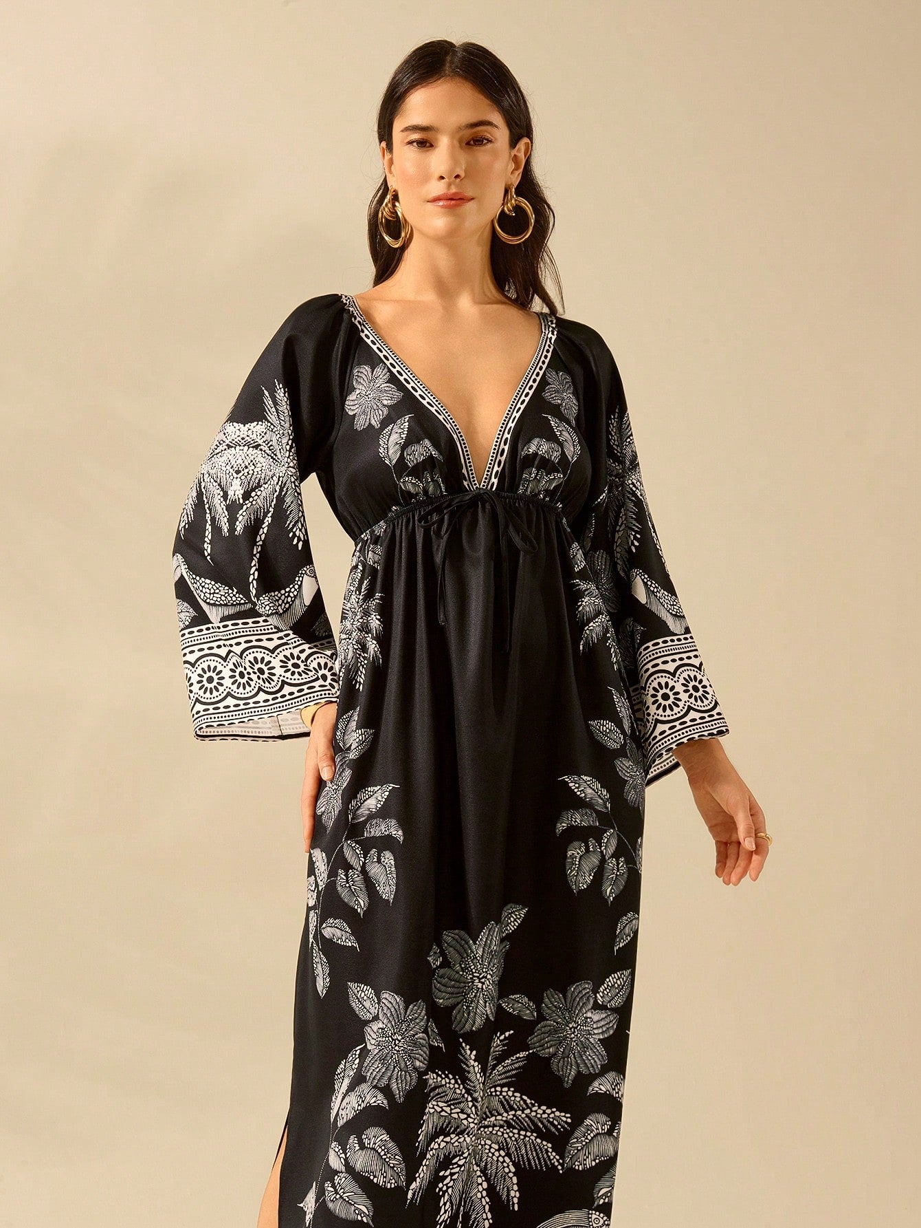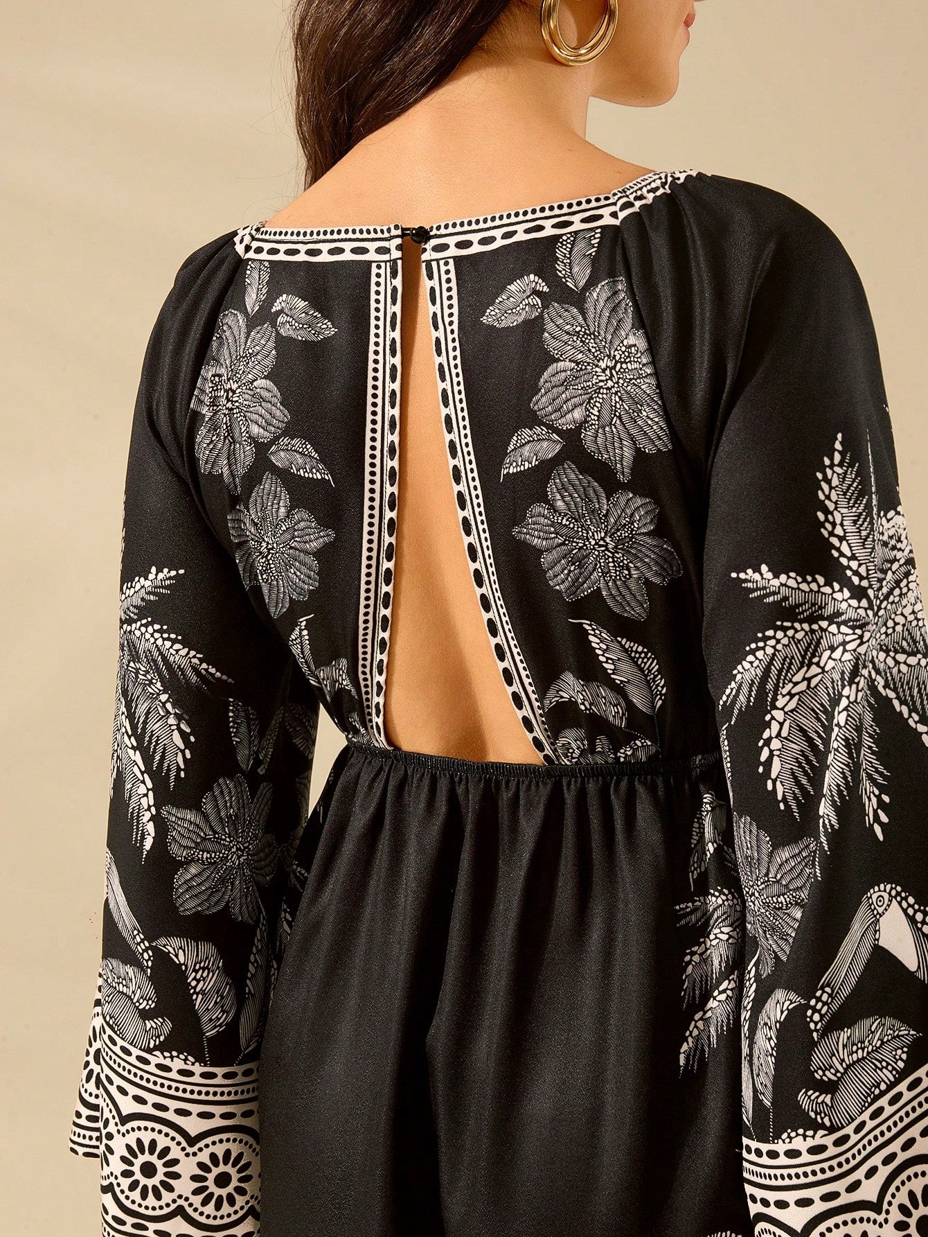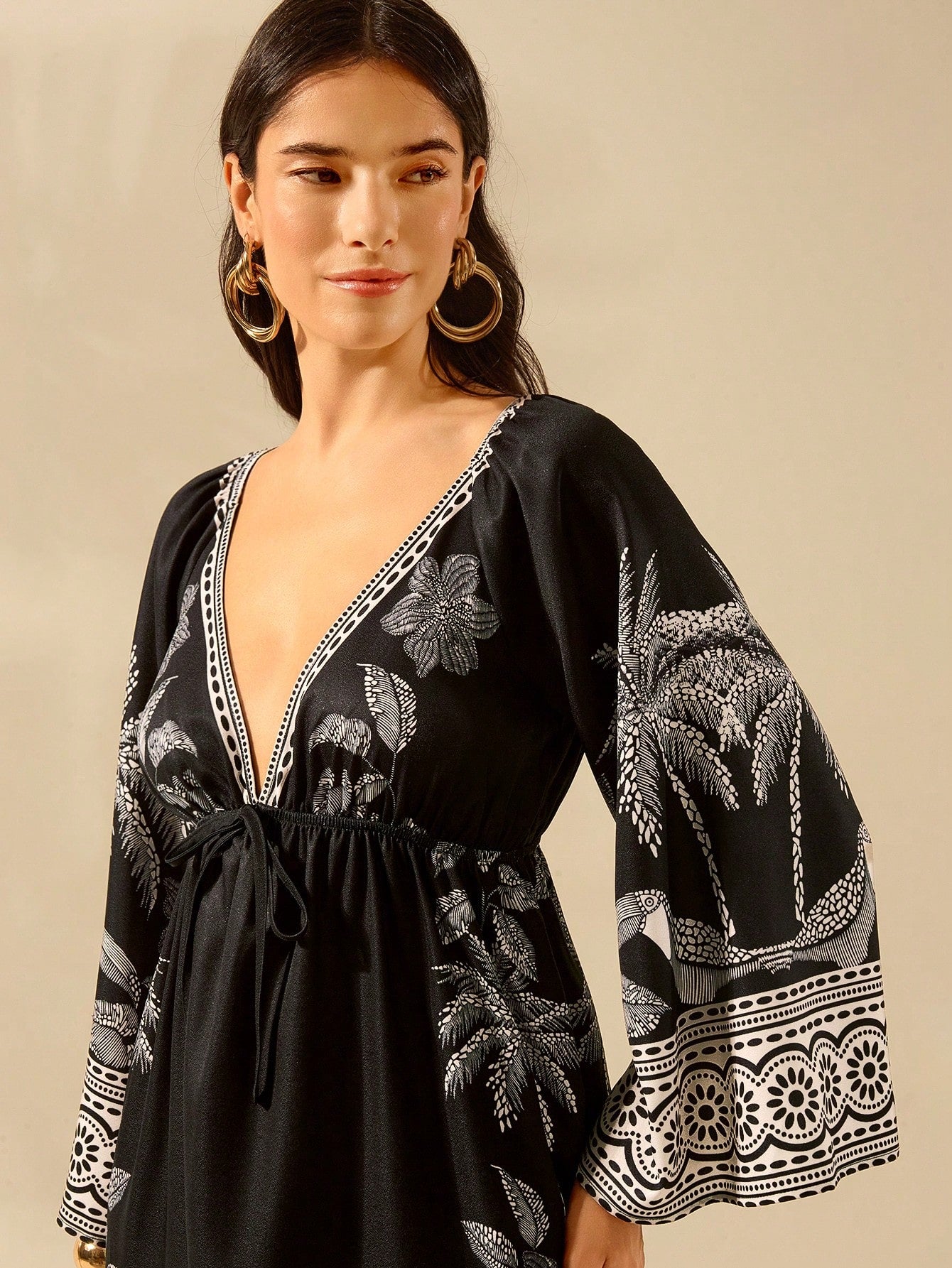 فستان CAJUNI نسائي بطبعة شجرة جوز الهند البوهيمية، مطبوع عليه نقشة الطوقان، بأكمام طويلة ورقبة على شكل حرف V وظهر مكشوف