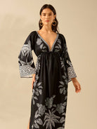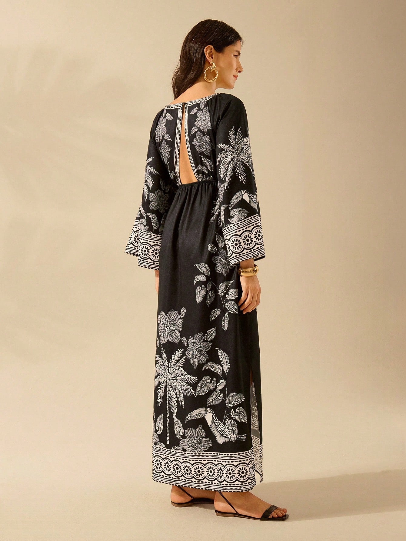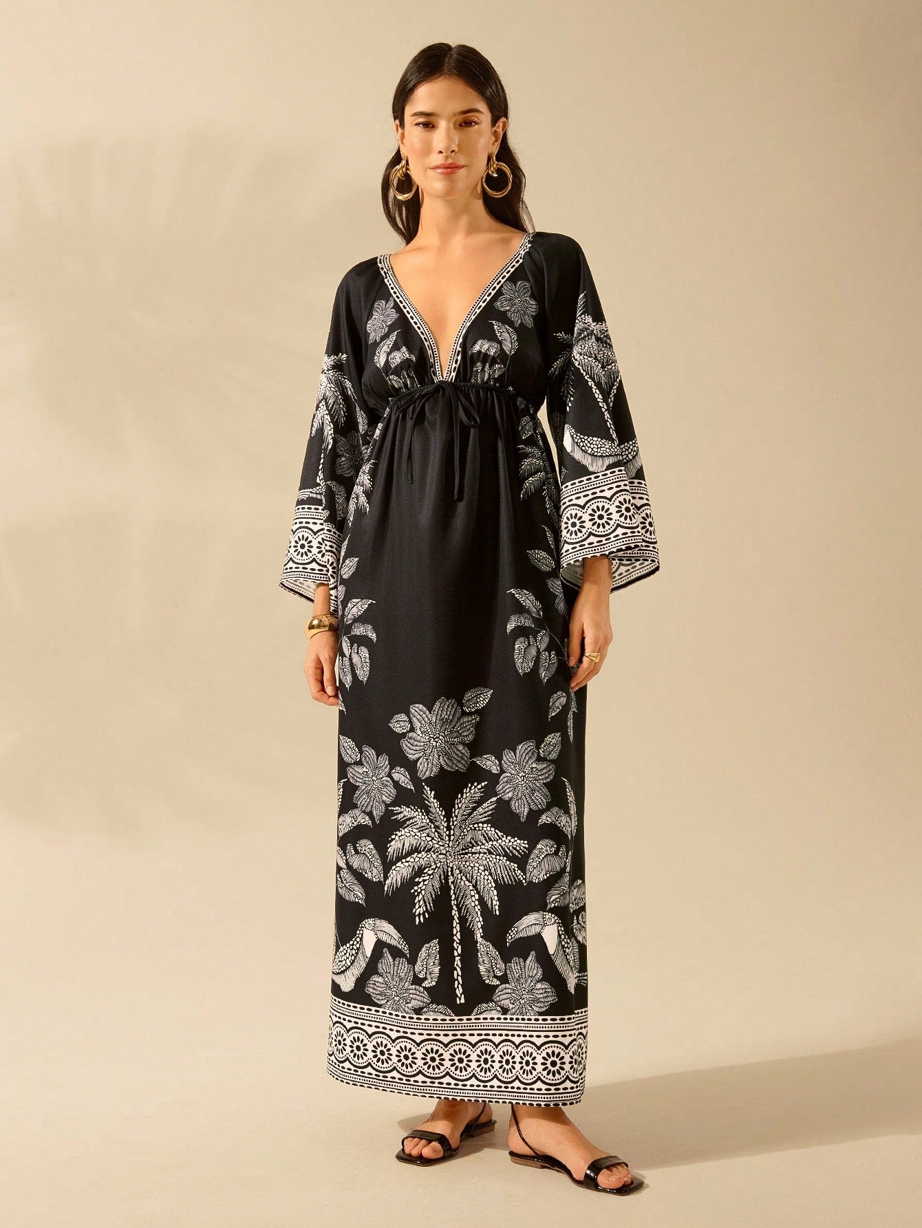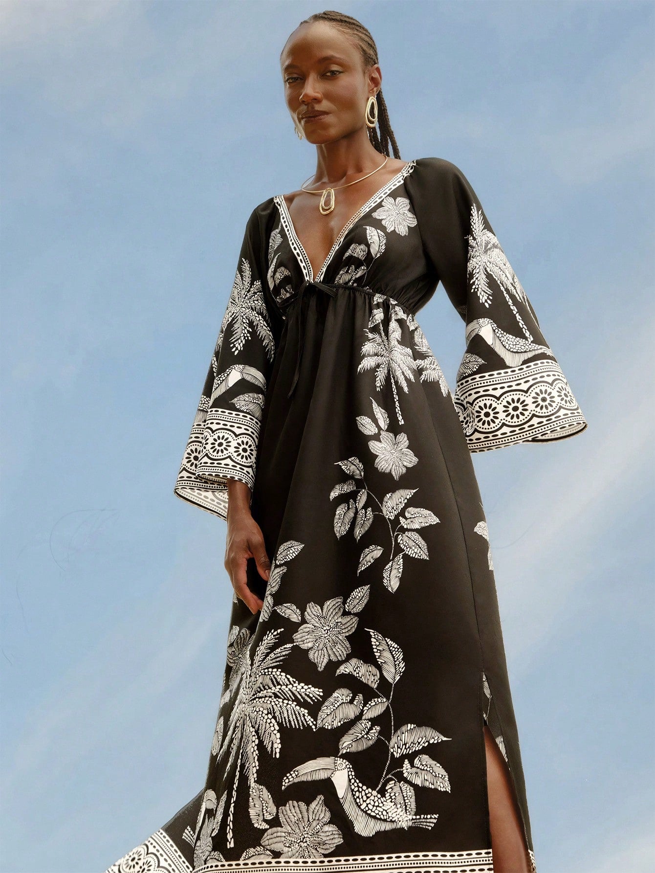 فستان CAJUNI نسائي بطبعة شجرة جوز الهند البوهيمية، مطبوع عليه نقشة الطوقان، بأكمام طويلة ورقبة على شكل حرف V وظهر مكشوف