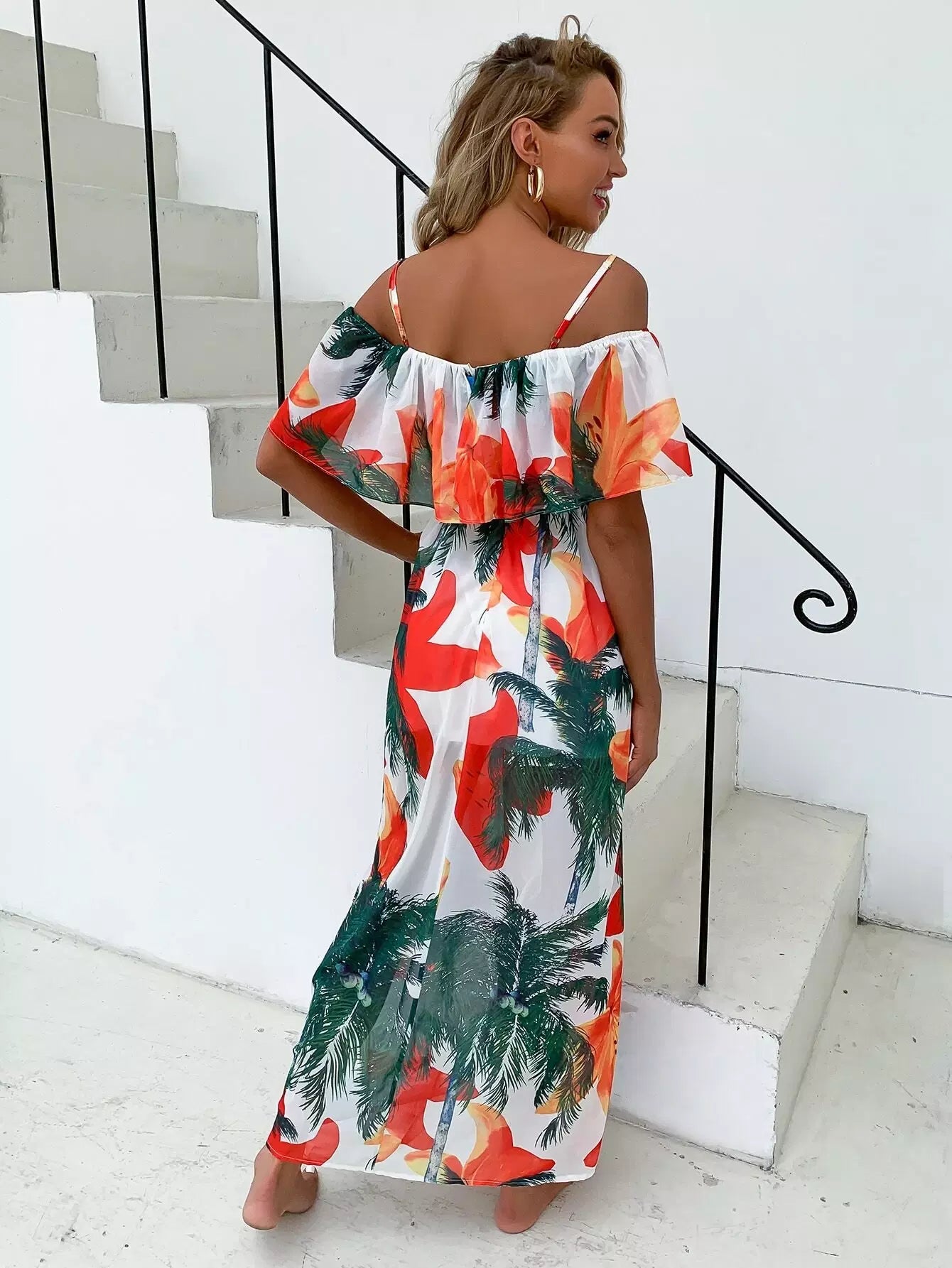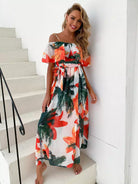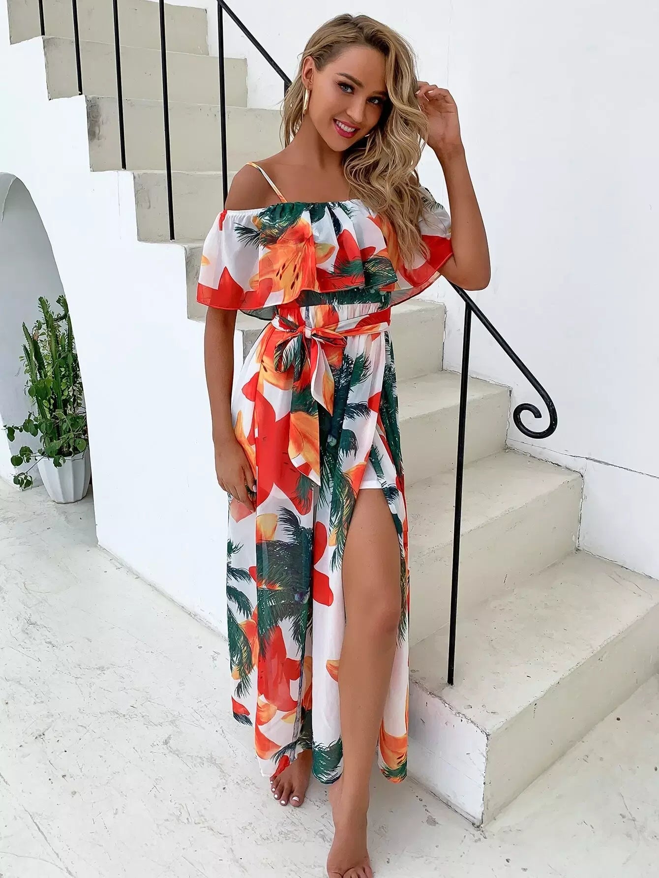 للنساء - فستان استوائي وزهري بحزام على الكتف البارد