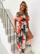 فستان بكتف مكشوف استوائي وزهري بدون حزام