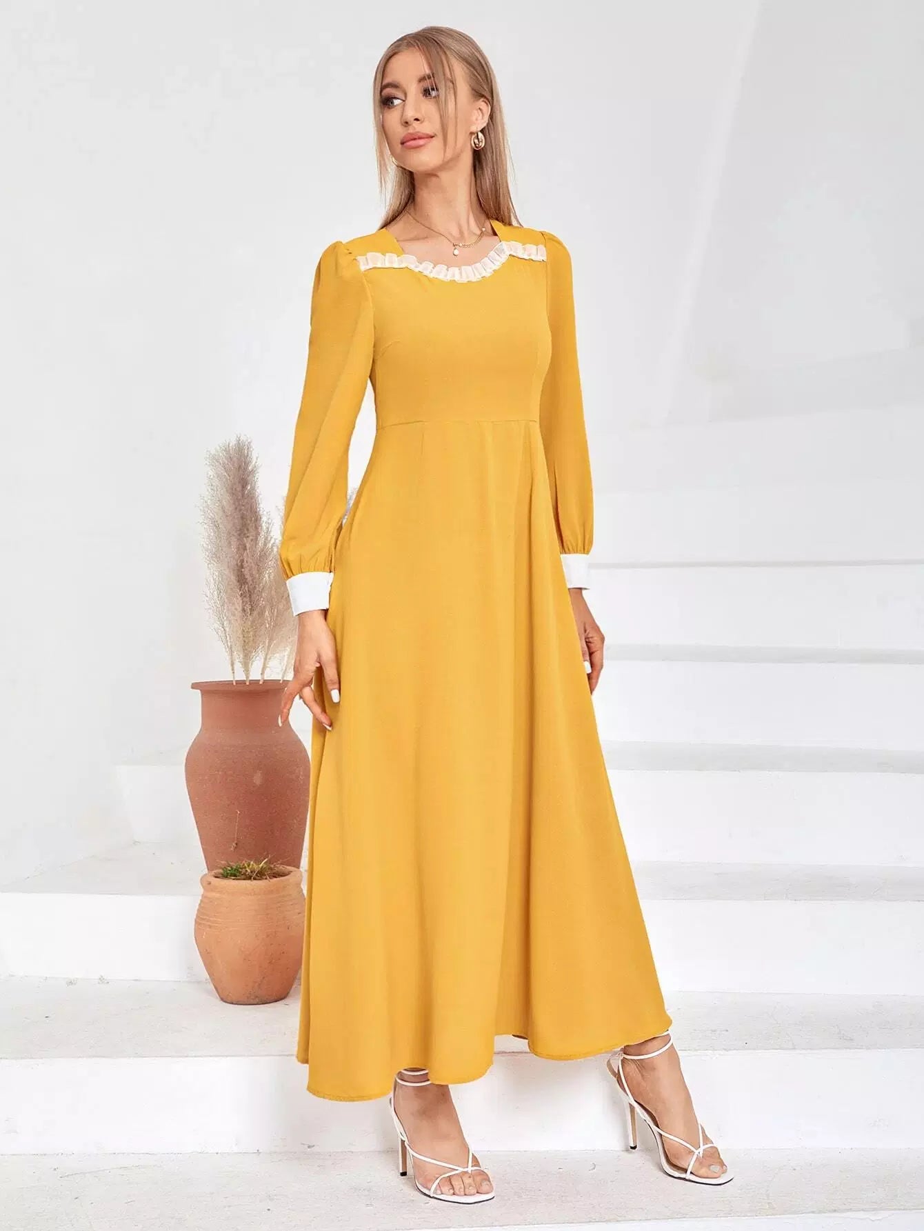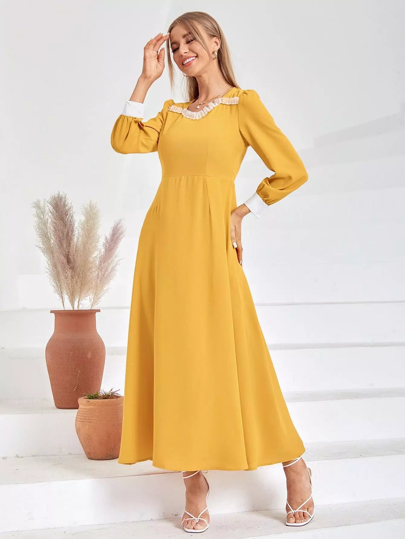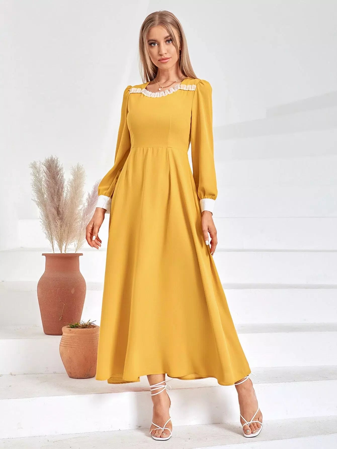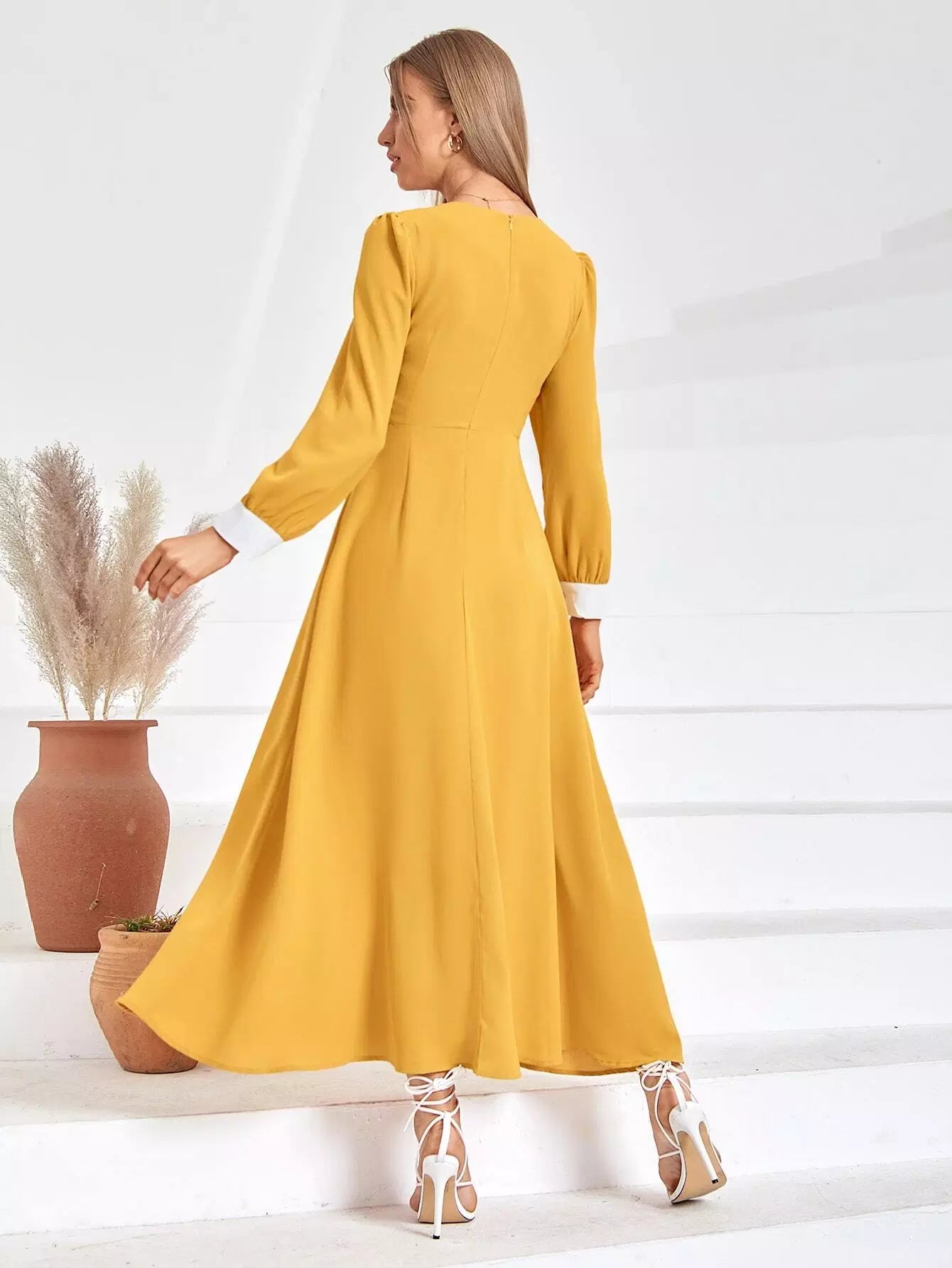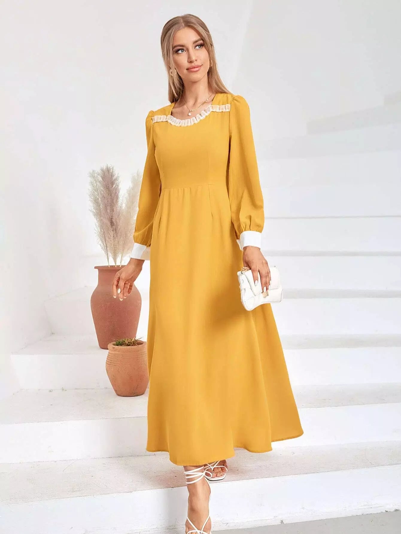 فستان بقصّة على شكل حرف A بقصّة شبكية بلون مغاير بسحاب من الخلف