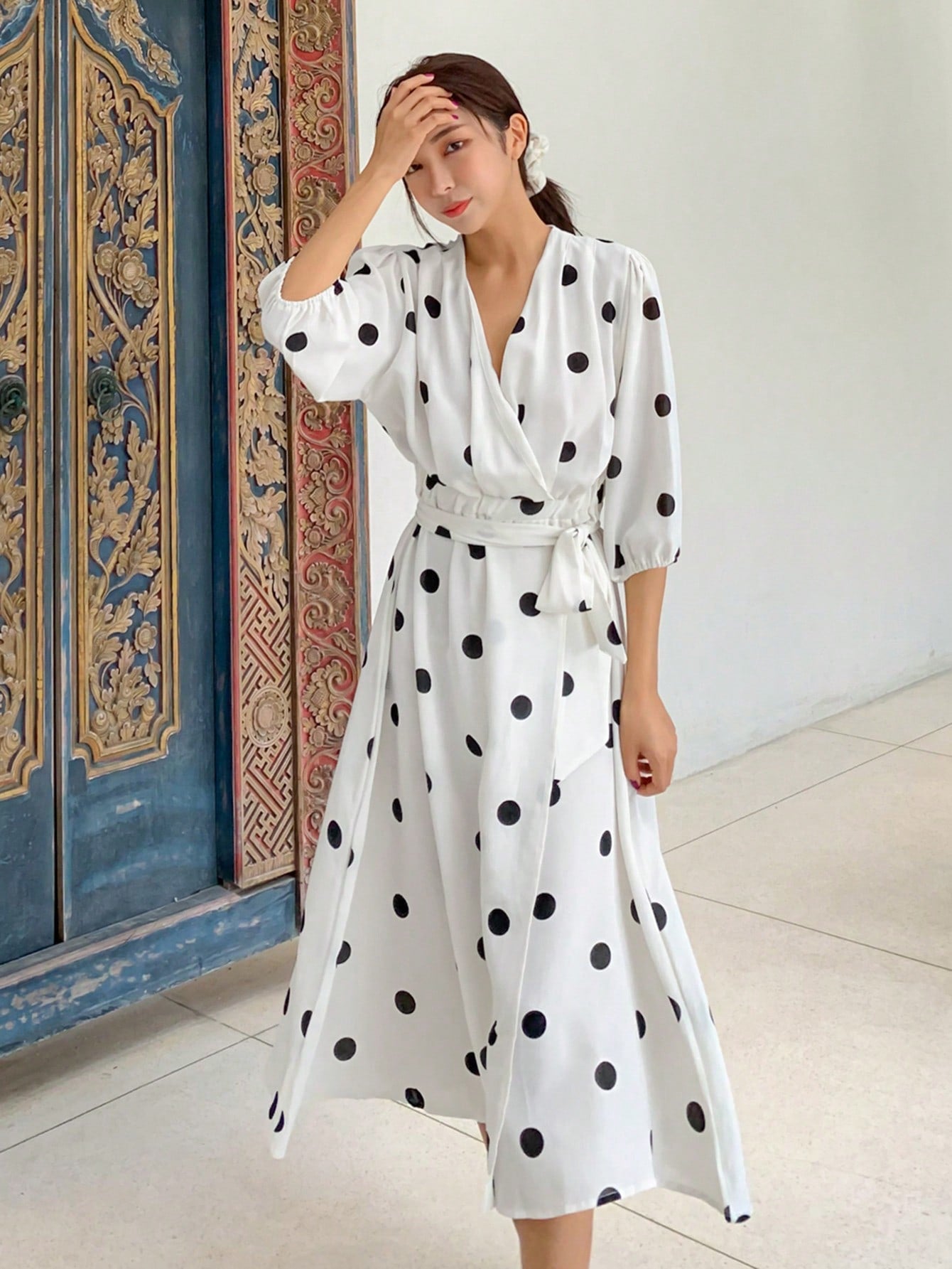 DAZY Polka Dot Print V Neck Wrap Dress With Lantern Sleeve Sundress