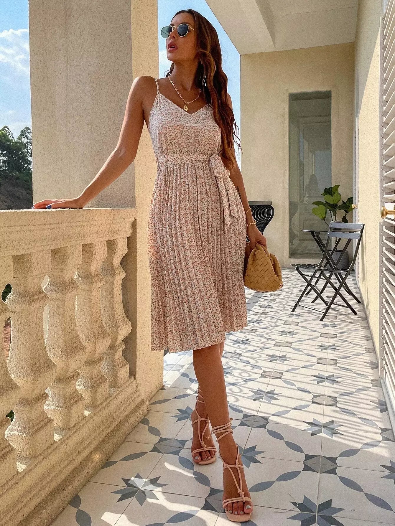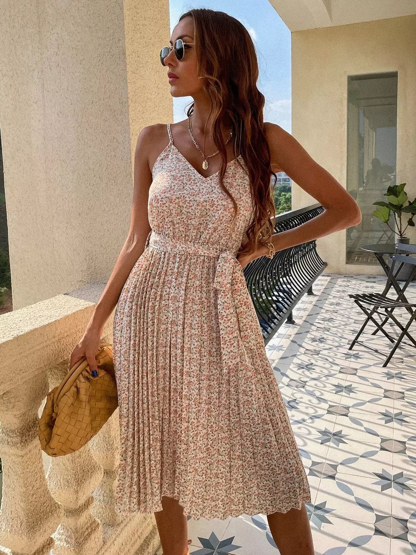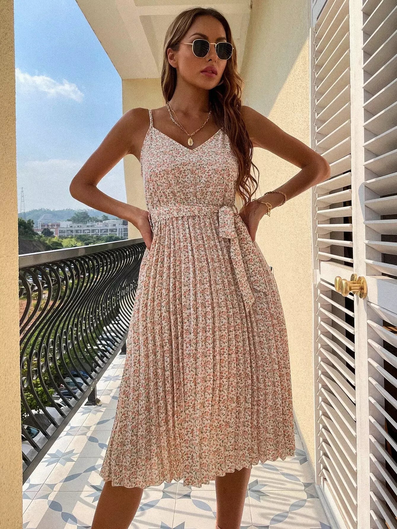 فستان كامي بطيات من Ditsy بدون حزام