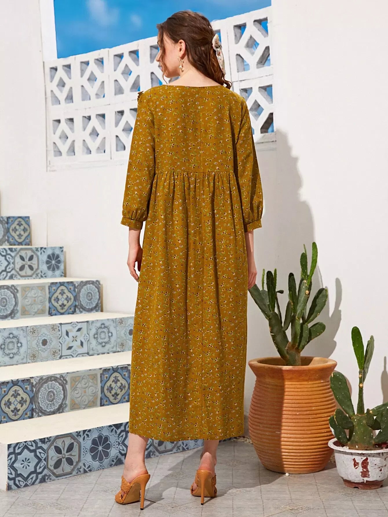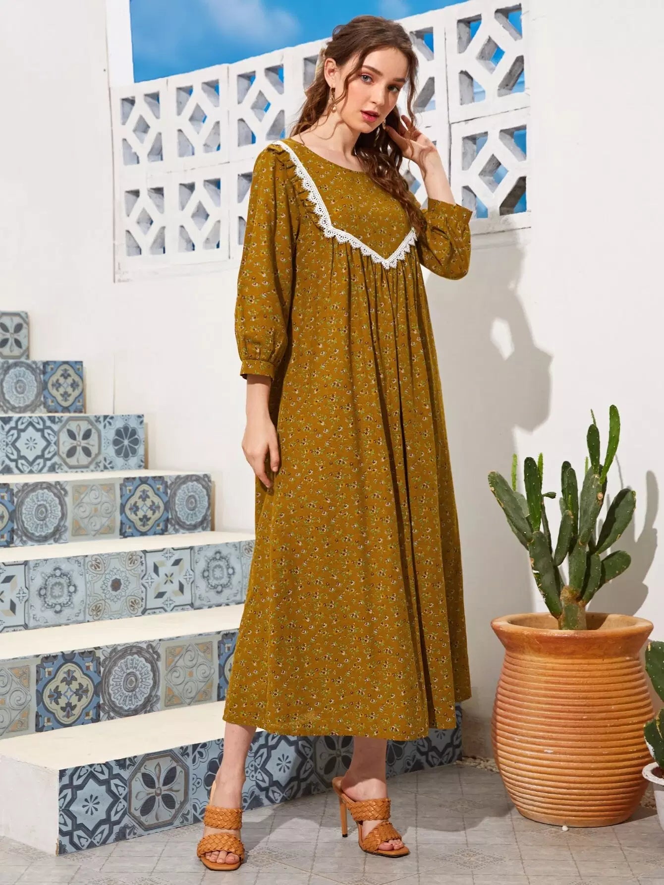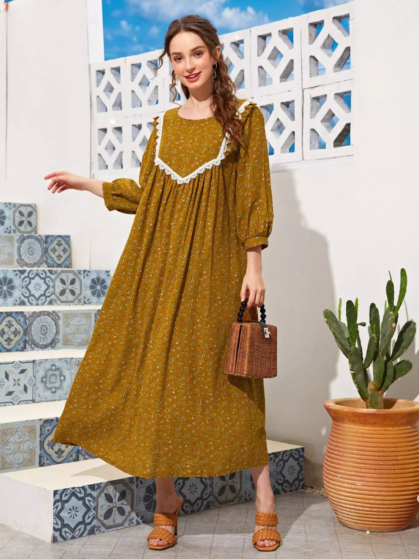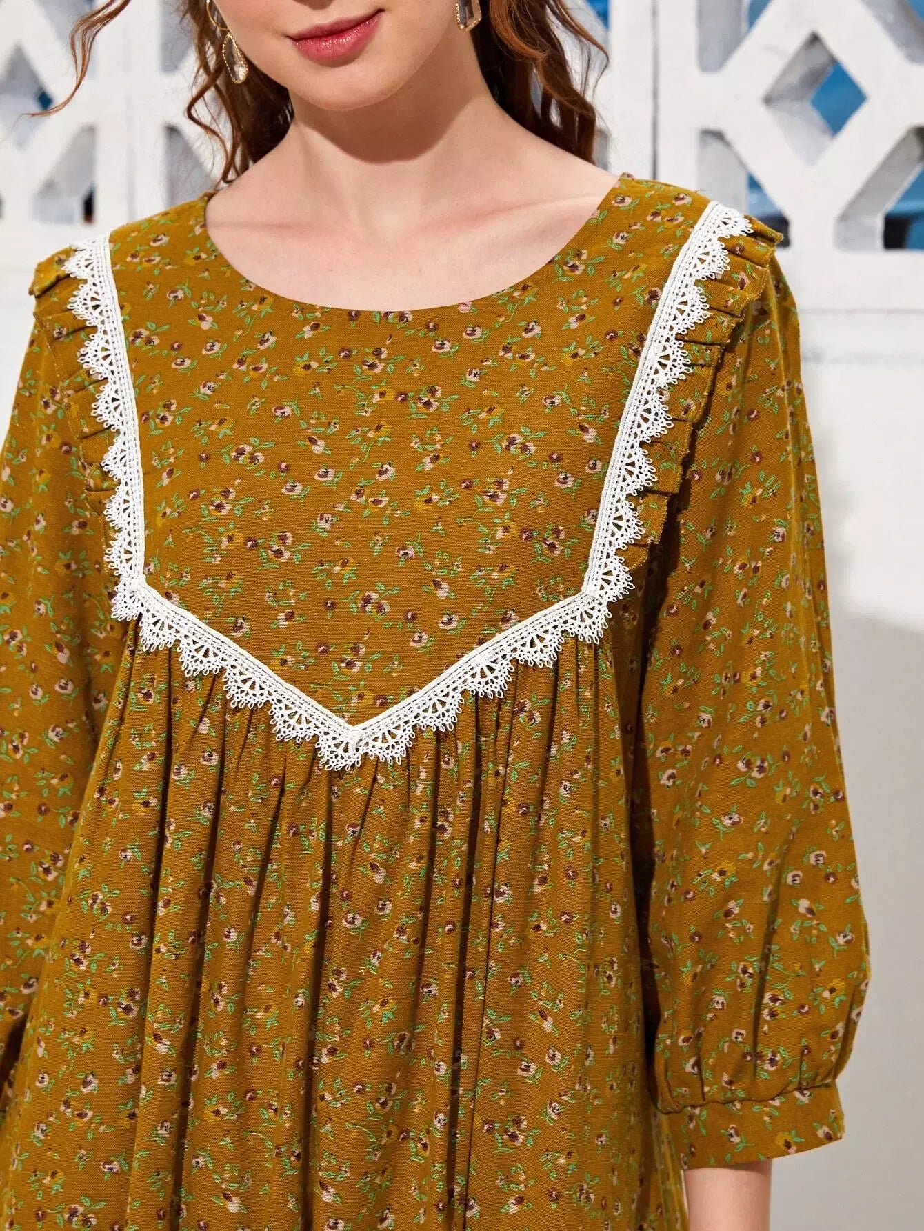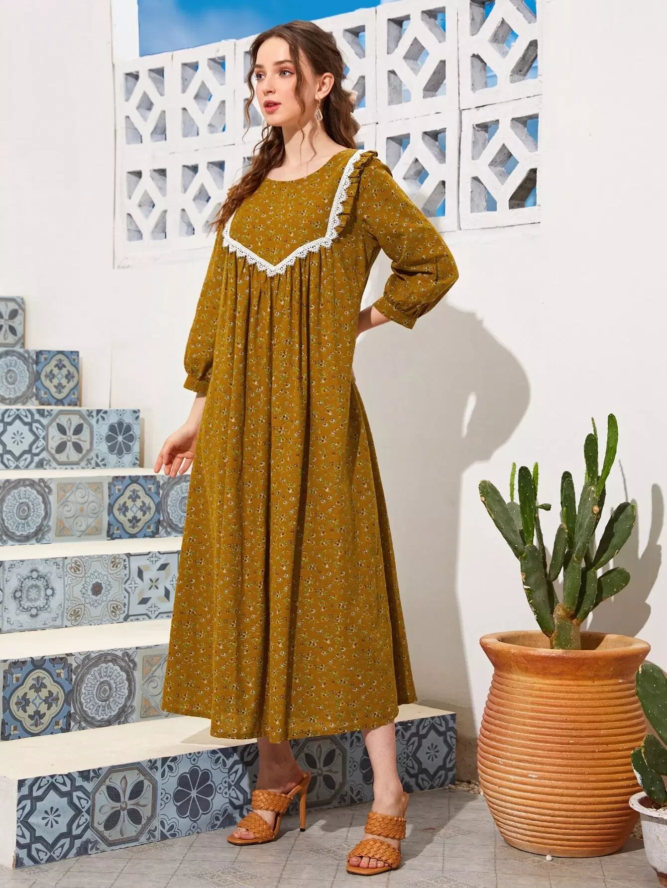 فستان ديتسي من الدانتيل المزين بالورود بلون متباين