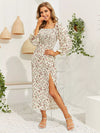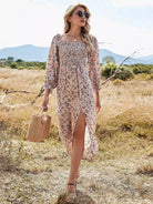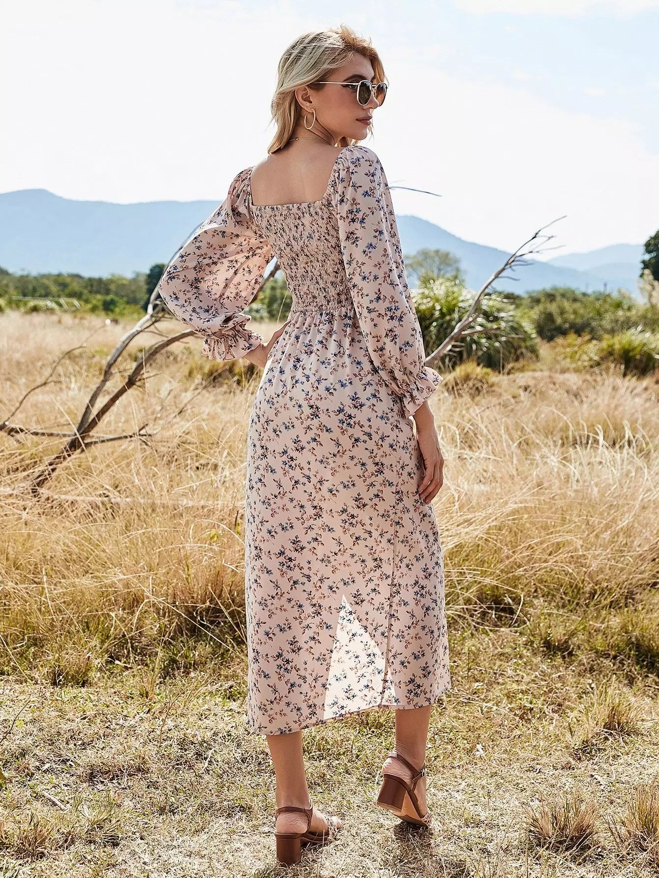 فستان ديتسي مزين بفتحة زهرية منقسمة على الفخذين بشريط على الصدر