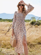 للنساء - فستان مزين بالزهور ومكشكش عند الفخذ