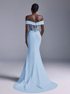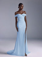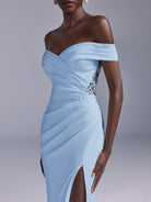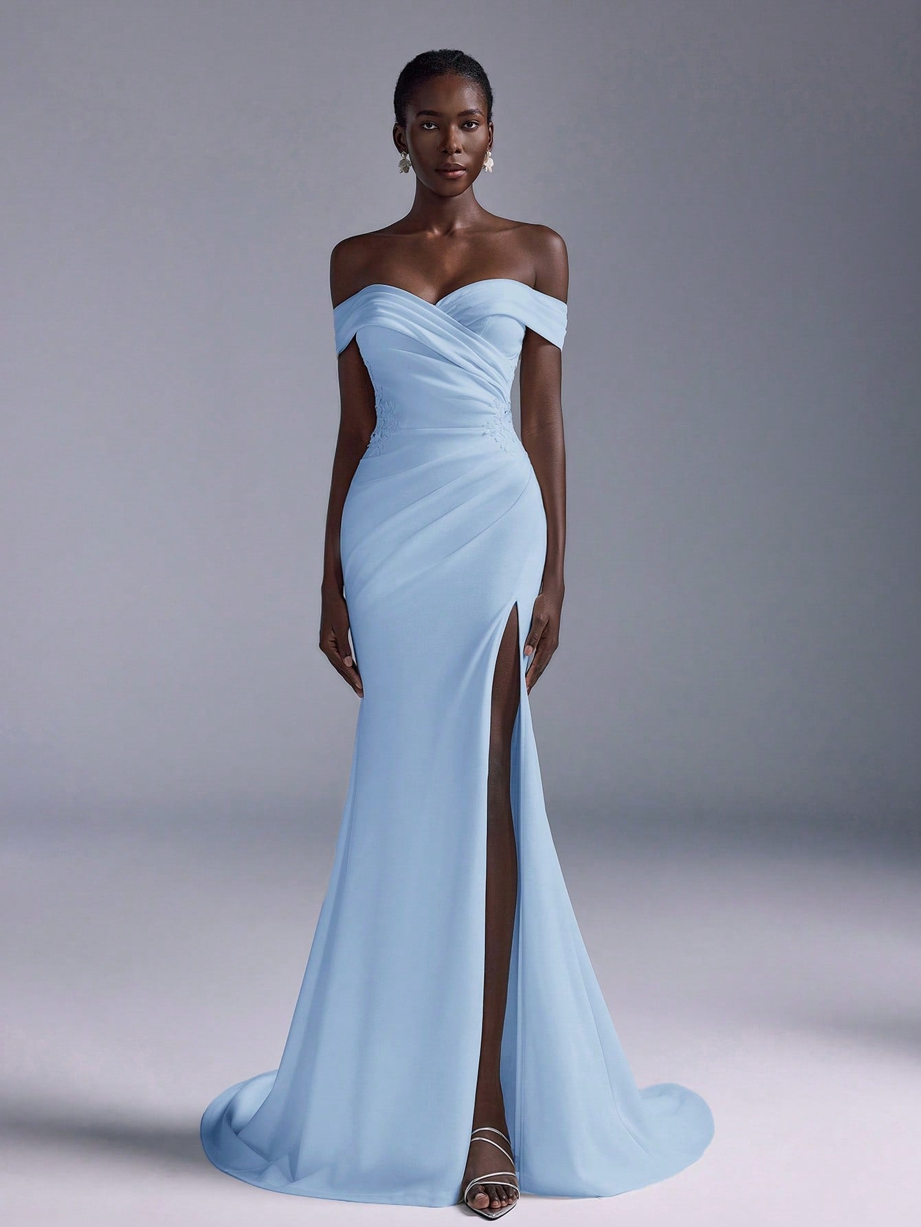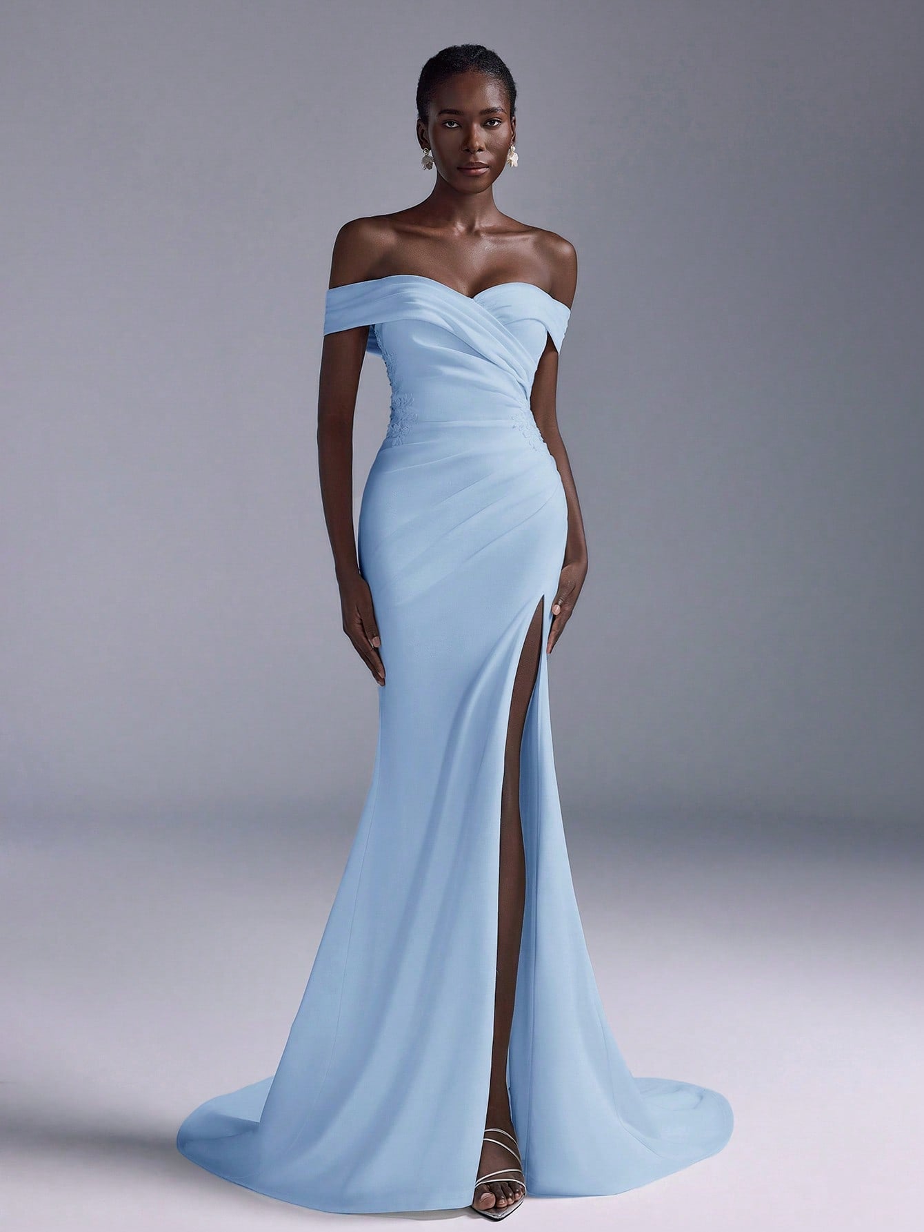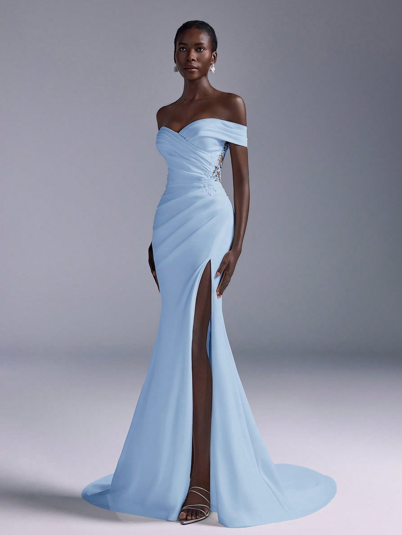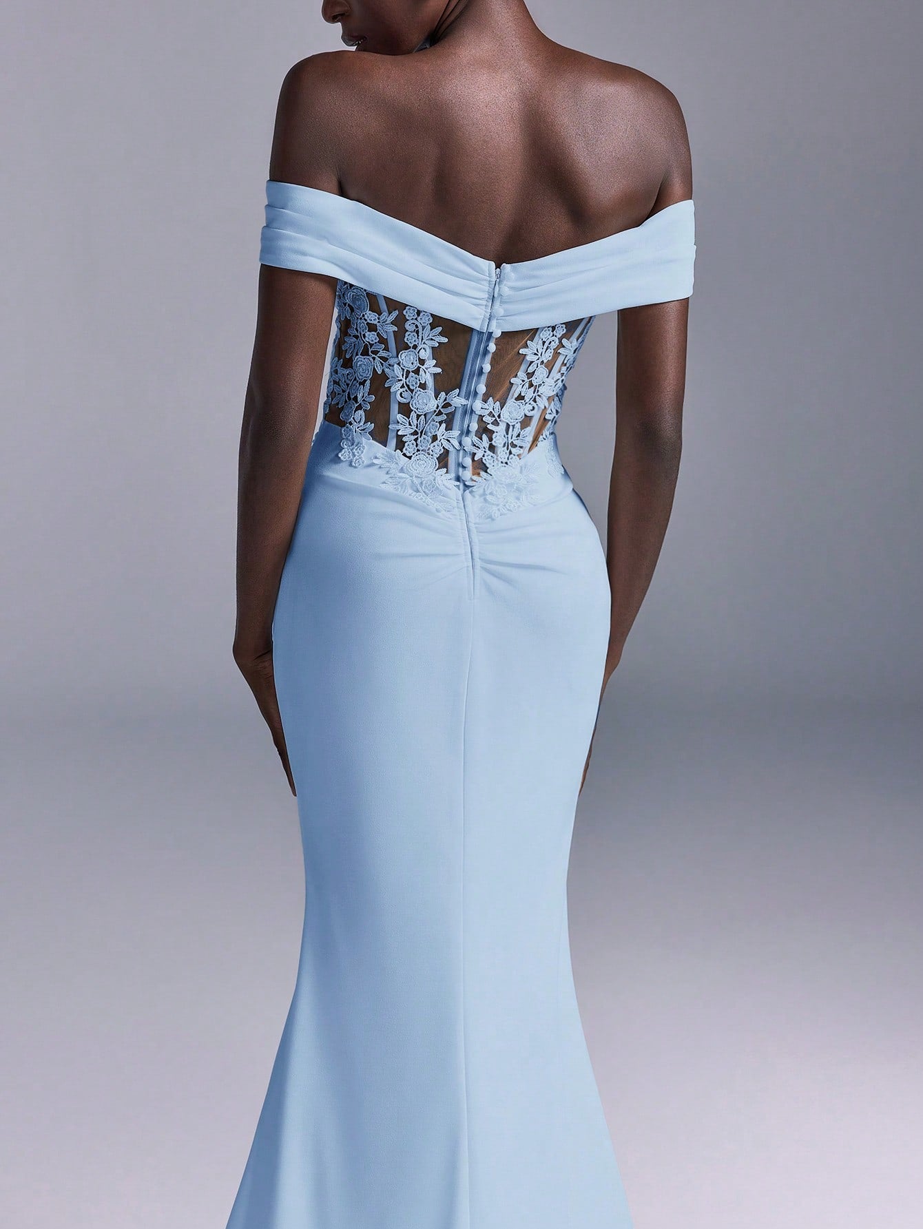 فستان ماكسي أنيق وفاخر من إيليتارا، مزين بتطريزات دانتيل، مكشوف الكتفين، مطاطي، مكشكش، بفتحة جانبية، بتصميم حورية البحر.
