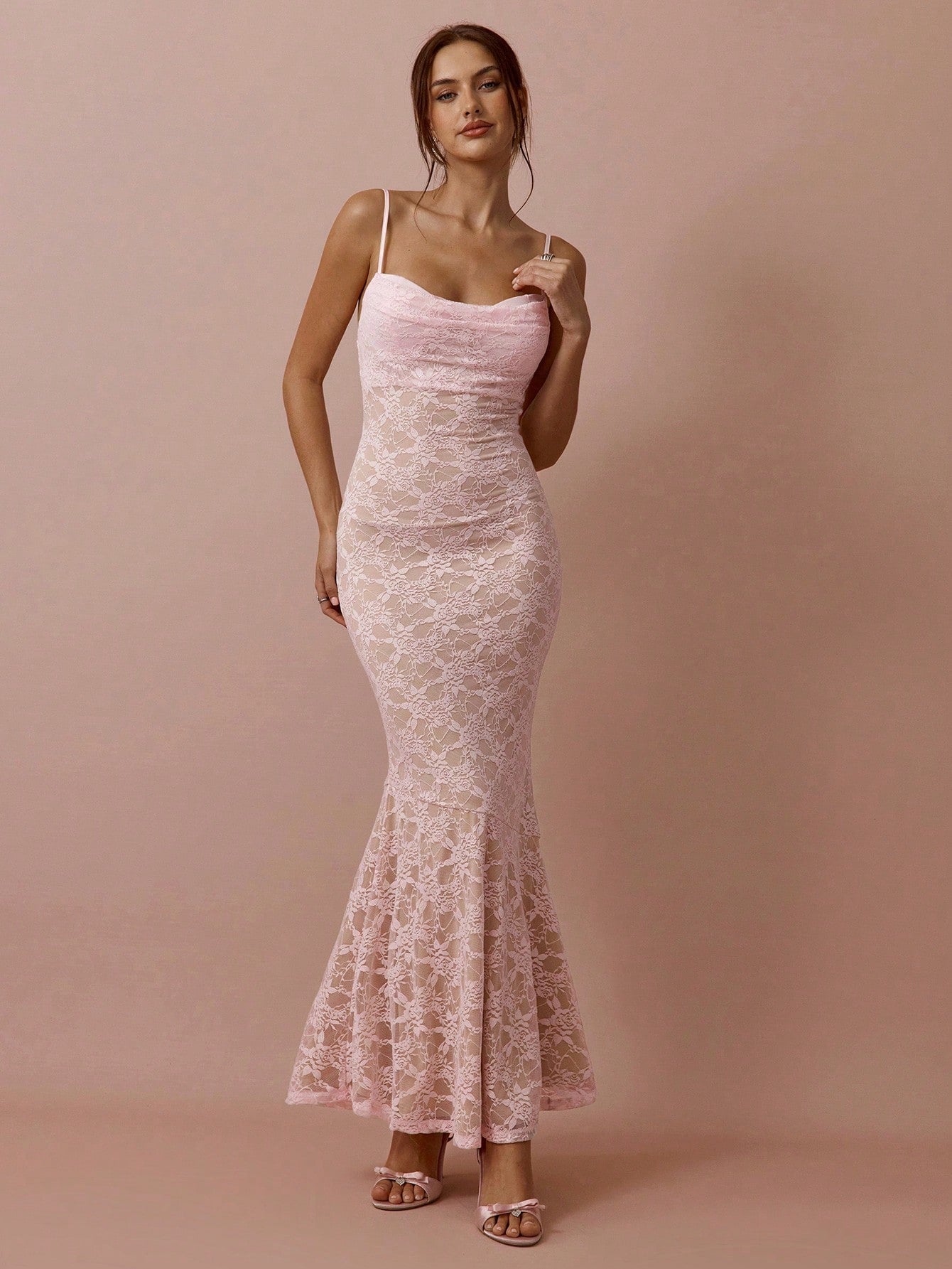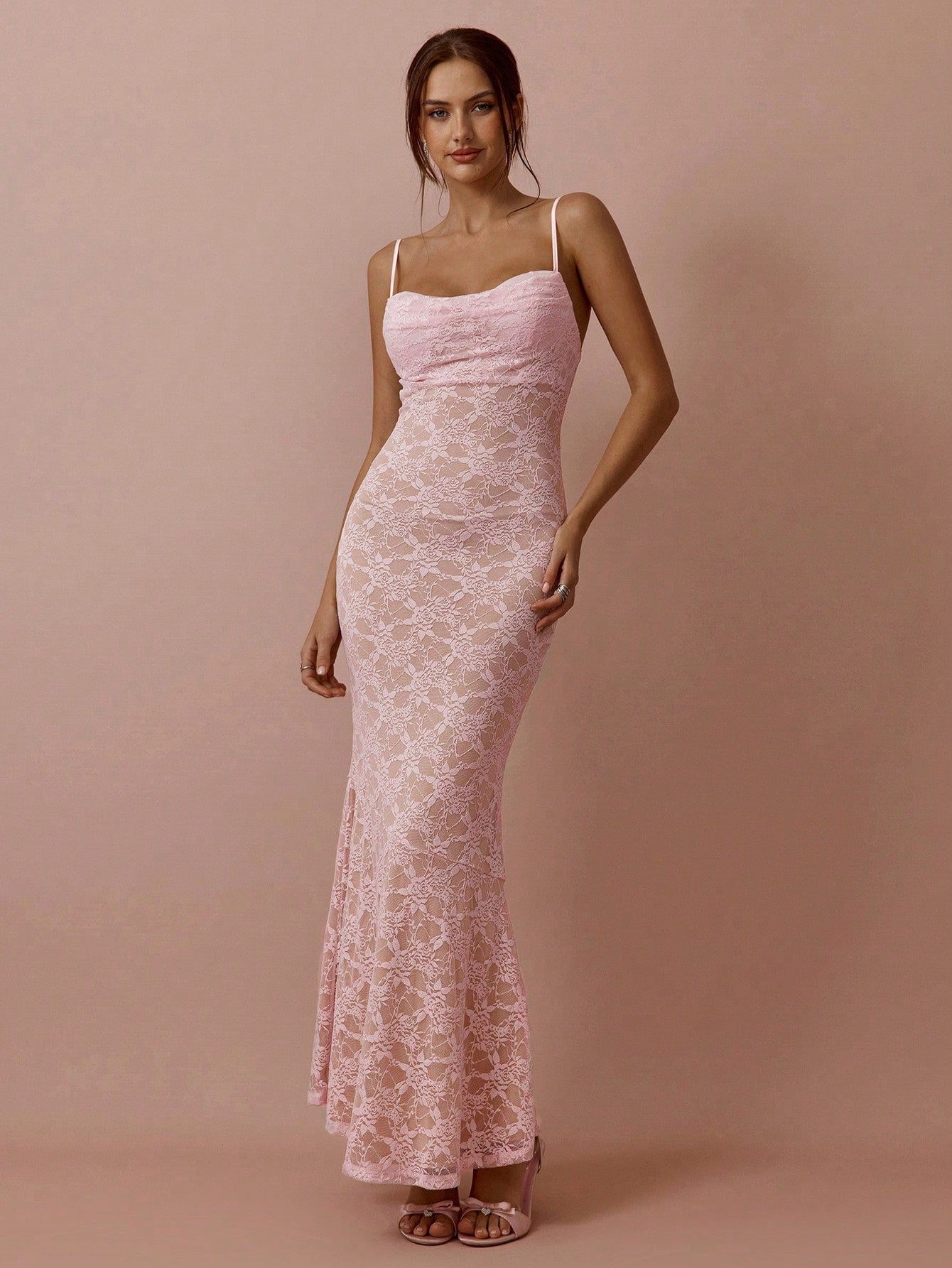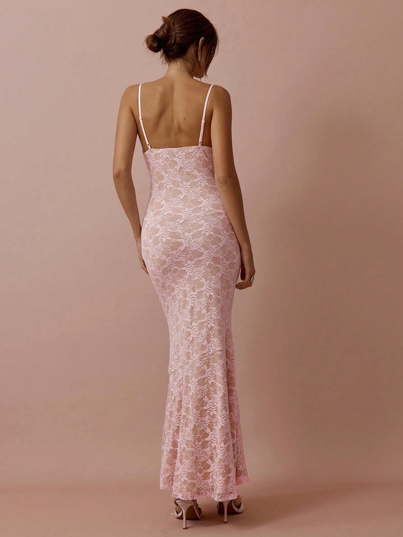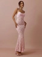 Enchnt Spring/Summer Romantic Women's Pastel Pink Little ROSE Floral Lace Spaghetti Strap Mermaid Maxi