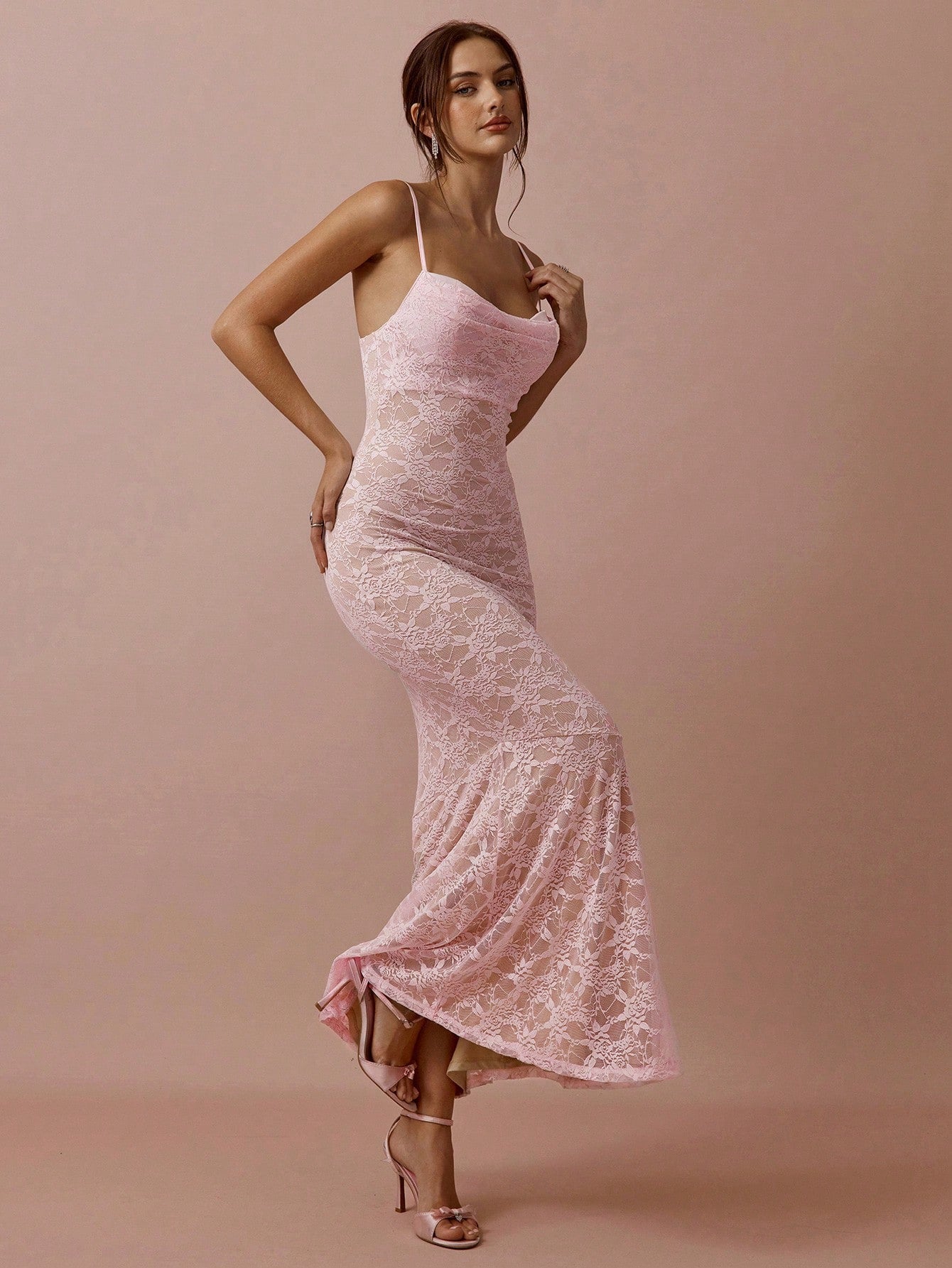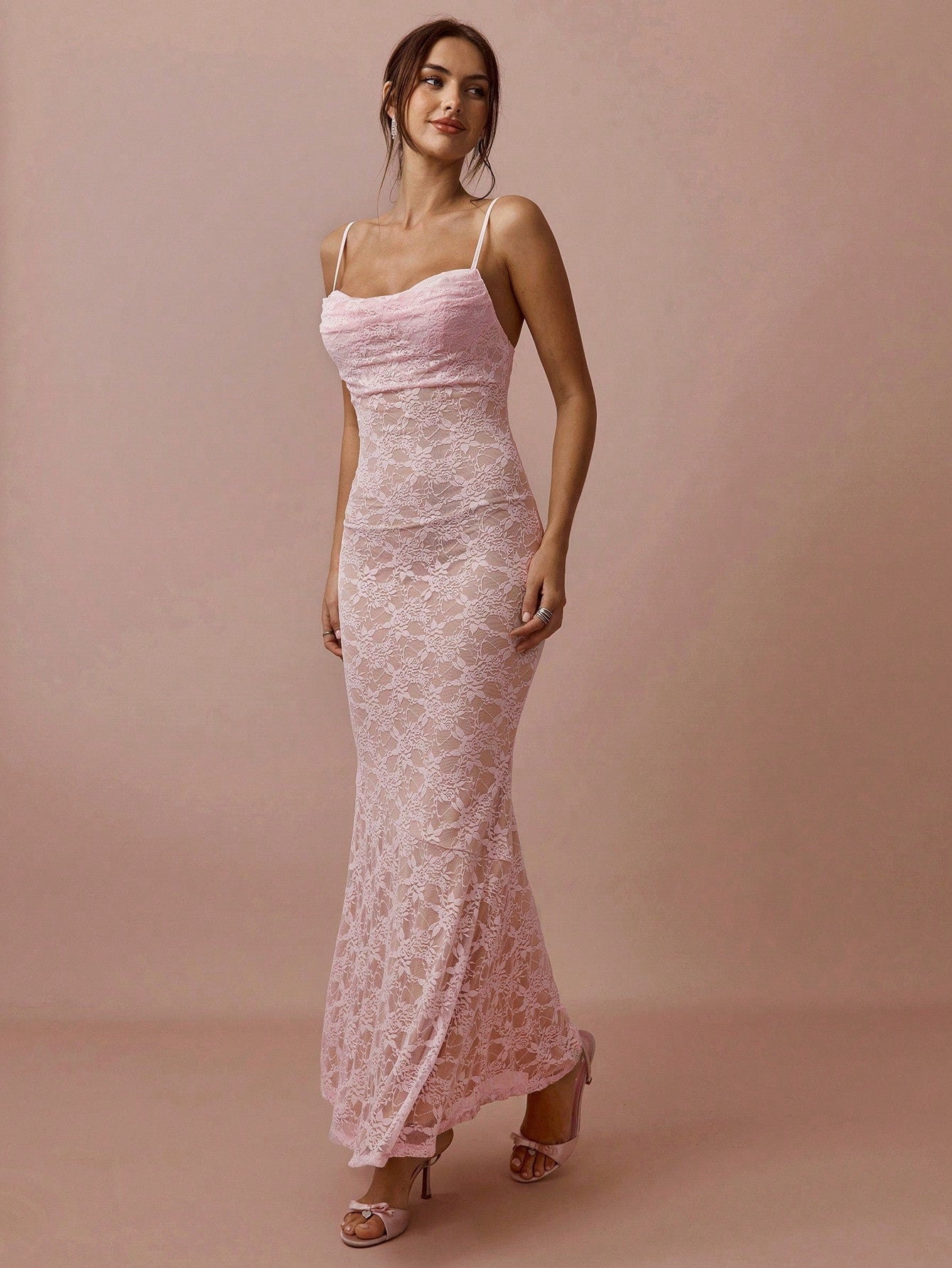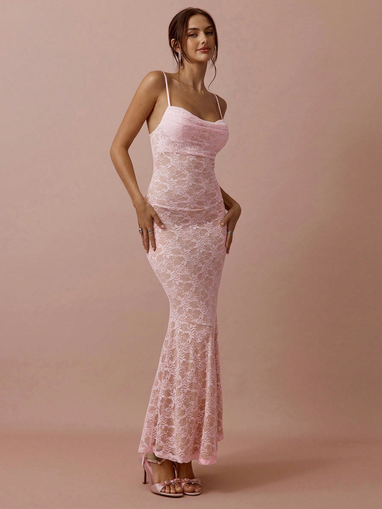 Enchnt Spring/Summer Romantic Women's Pastel Pink Little ROSE Floral Lace Spaghetti Strap Mermaid Maxi