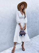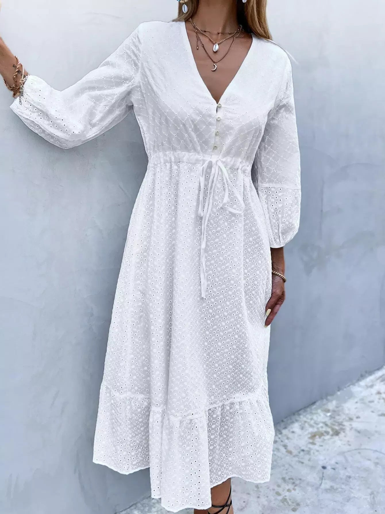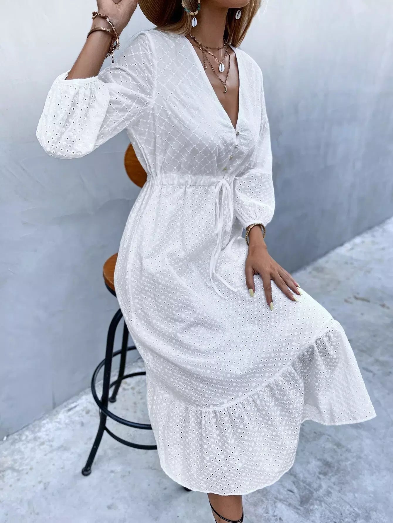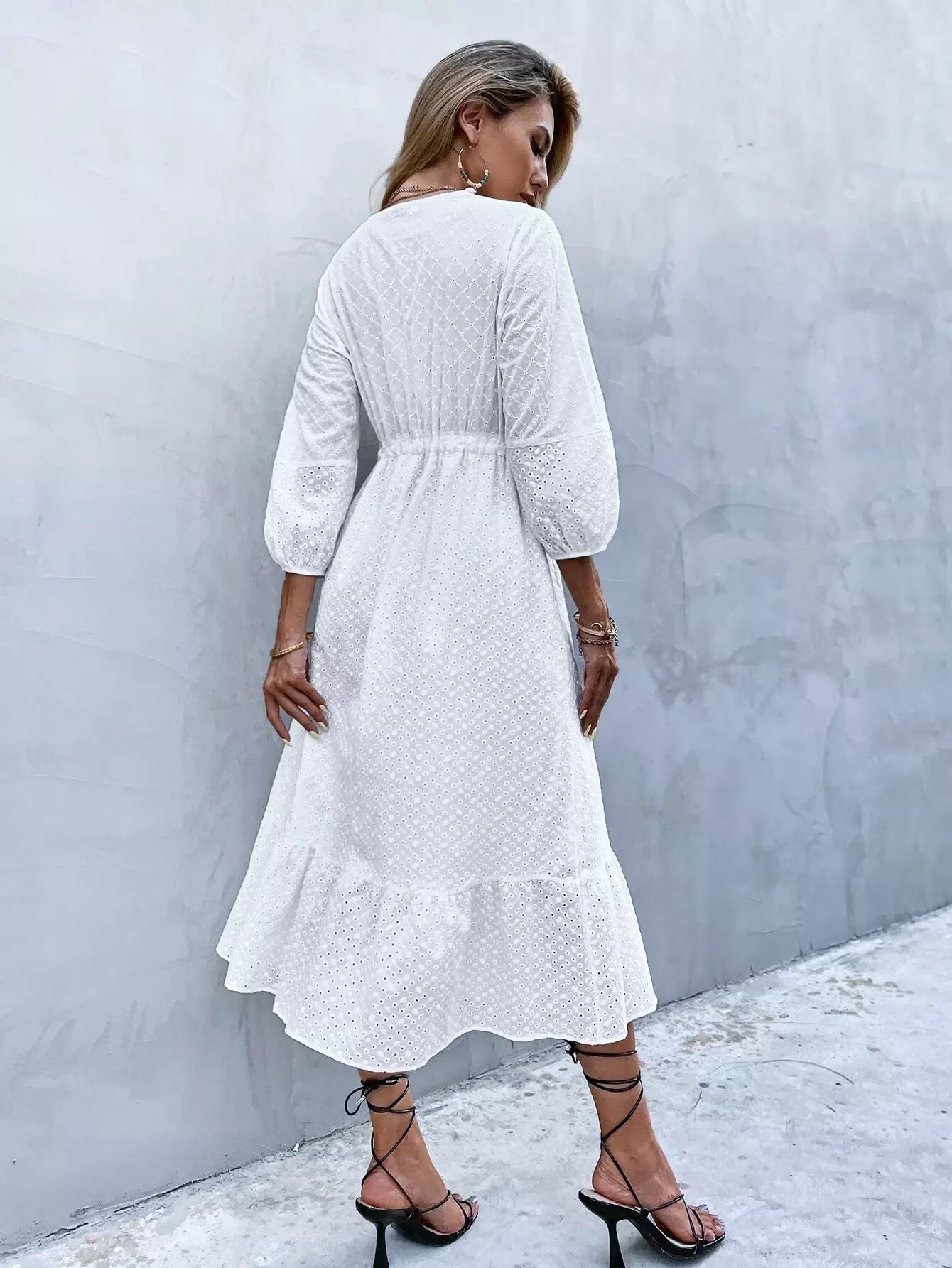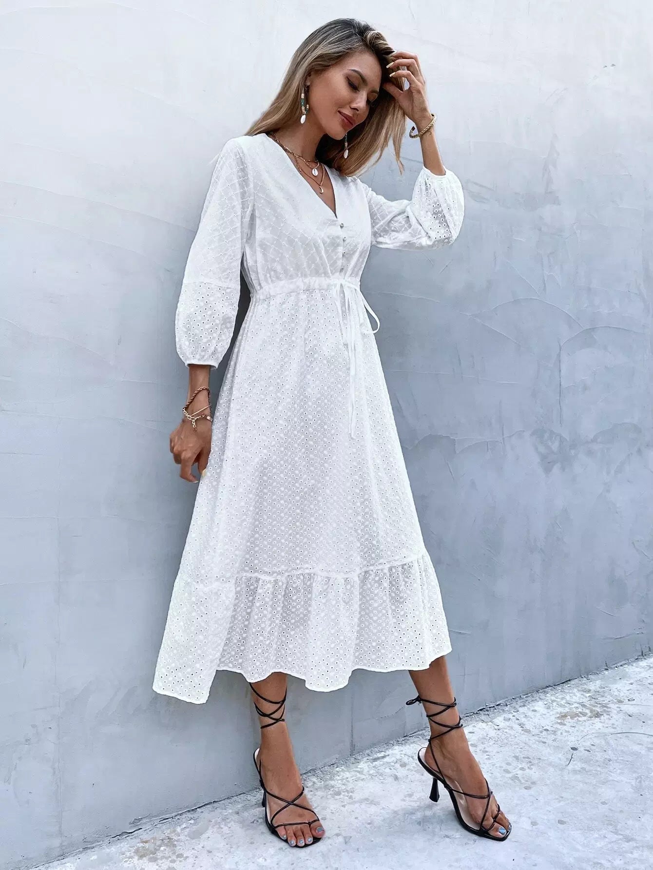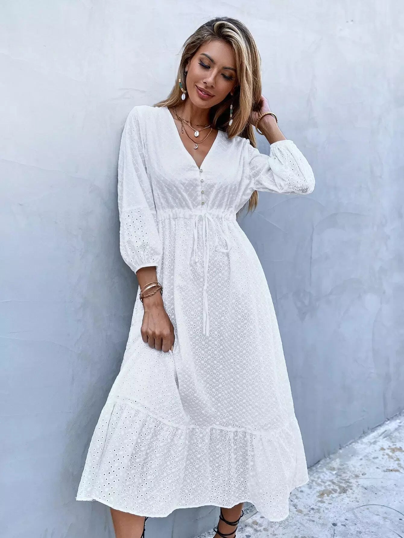 فستان مطرز بفتحات ورباط على الخصر وحاشية مكشكشة