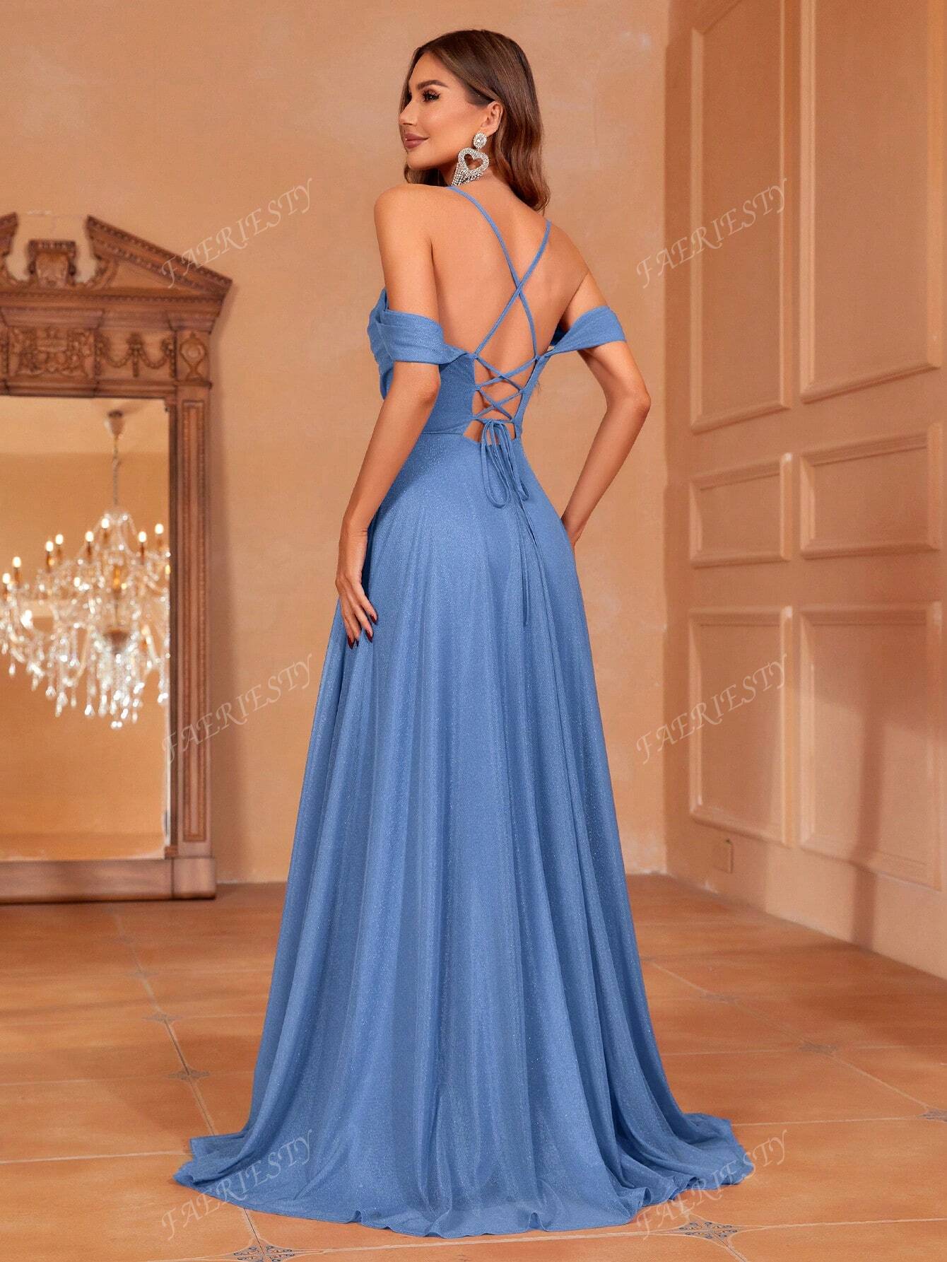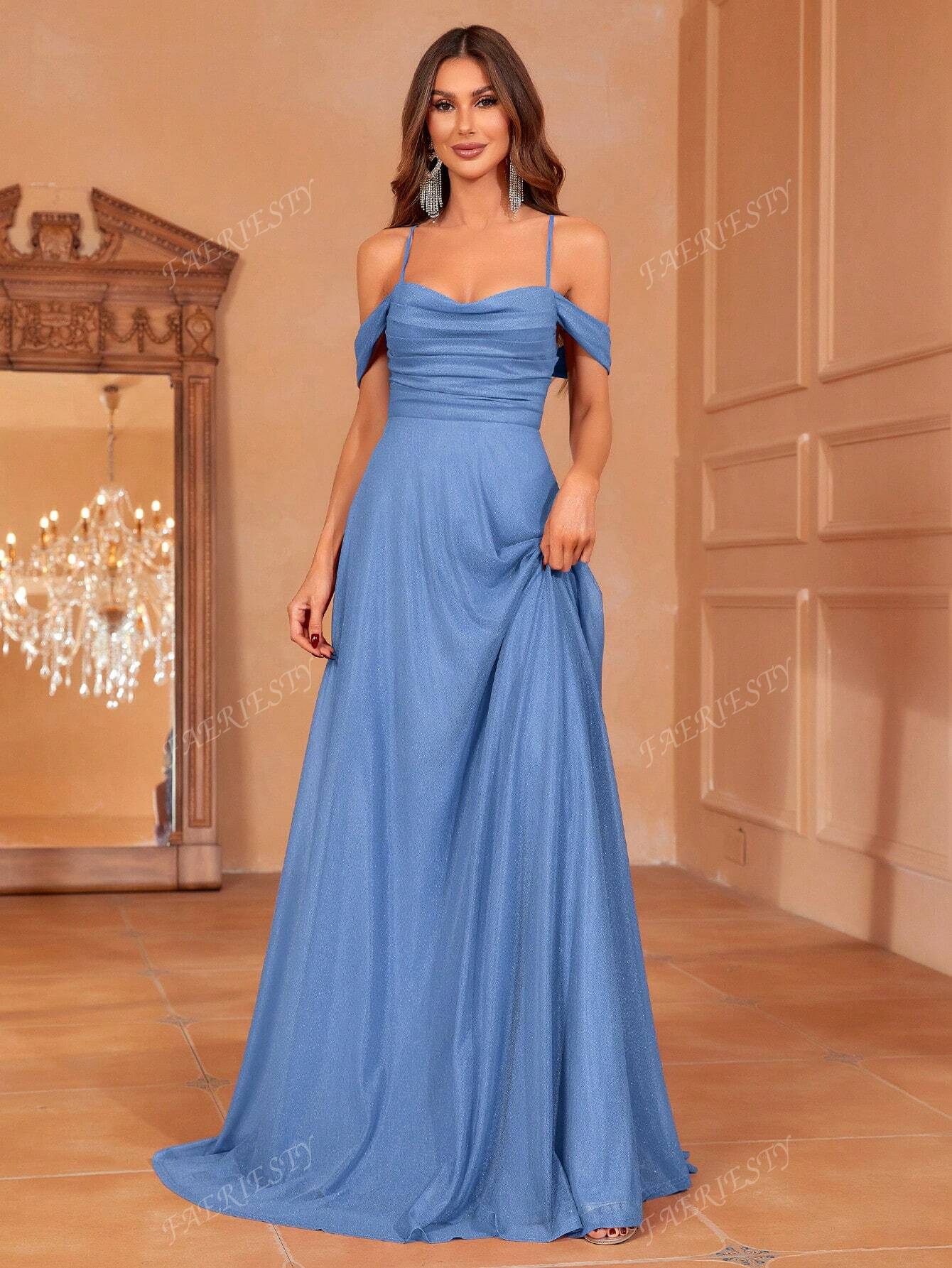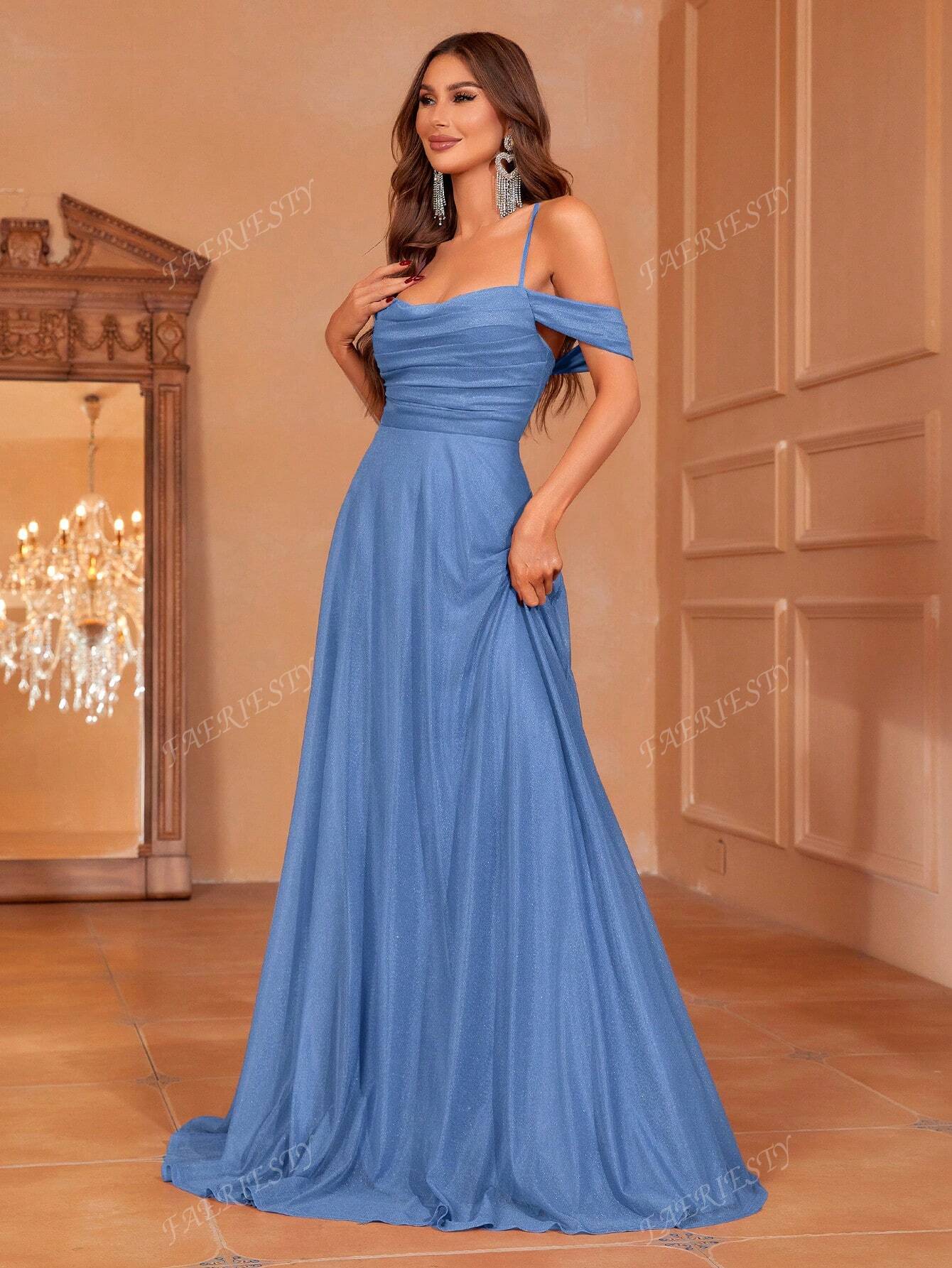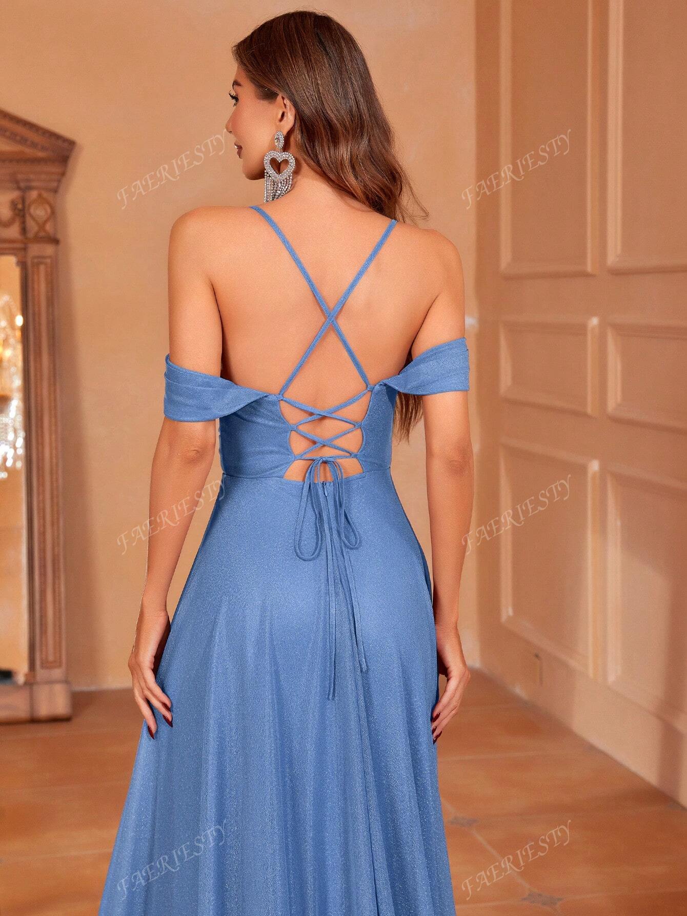 فستان وصيفة العروس الأنيق ذو الأكتاف المكشوفة من فيريستي، مع رباط خلفي قابل للتعديل وحبل، وتنورة واسعة متدفقة |