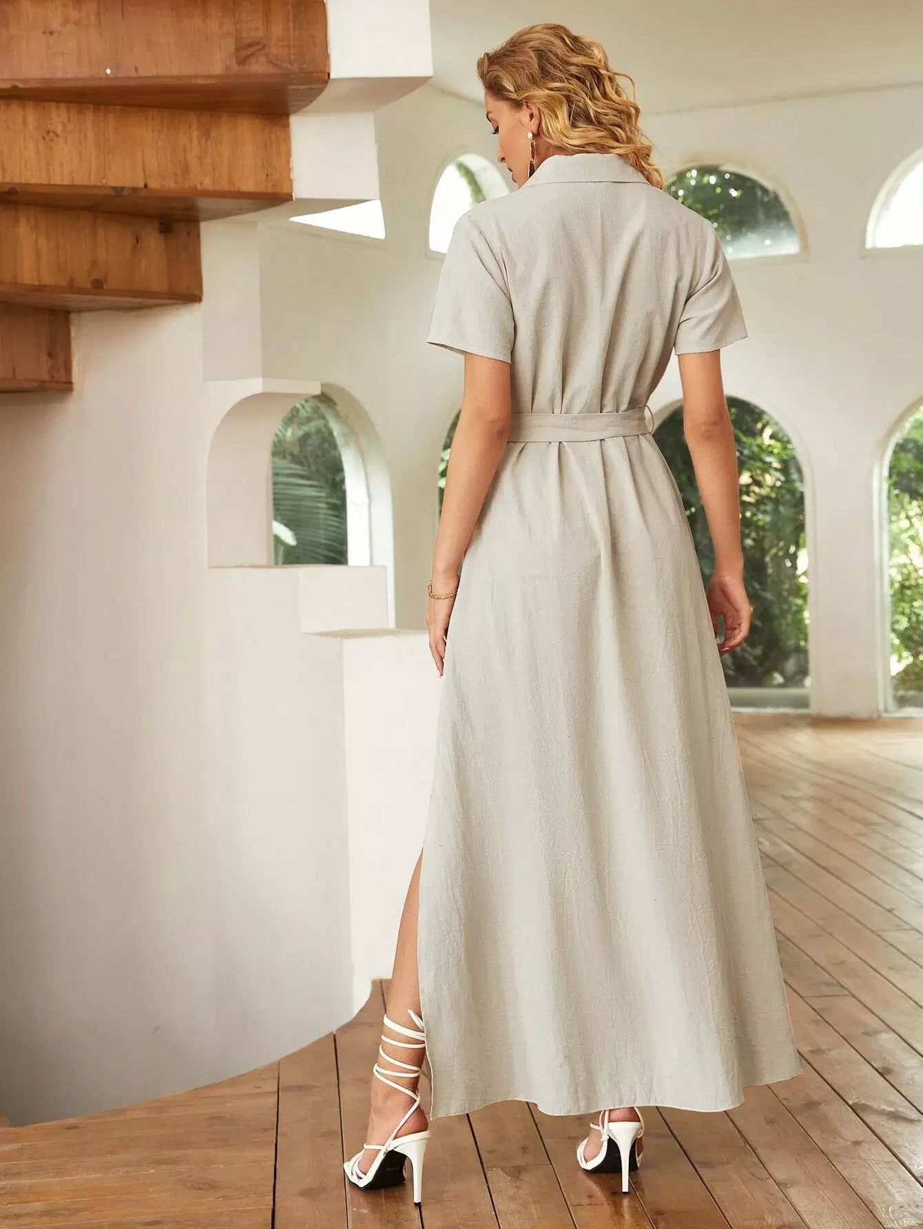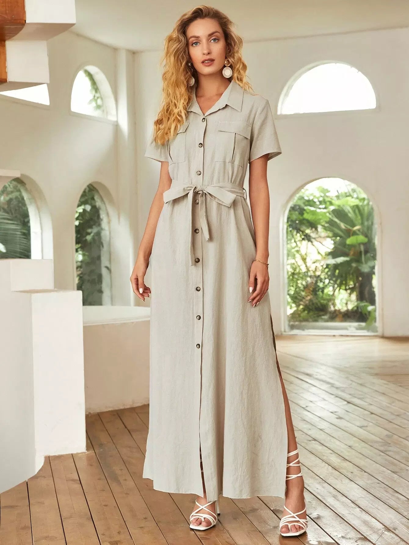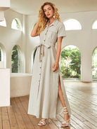 فستان قميص بحاشية مقسمة وجيب قلاب بدون حزام