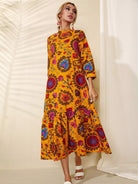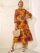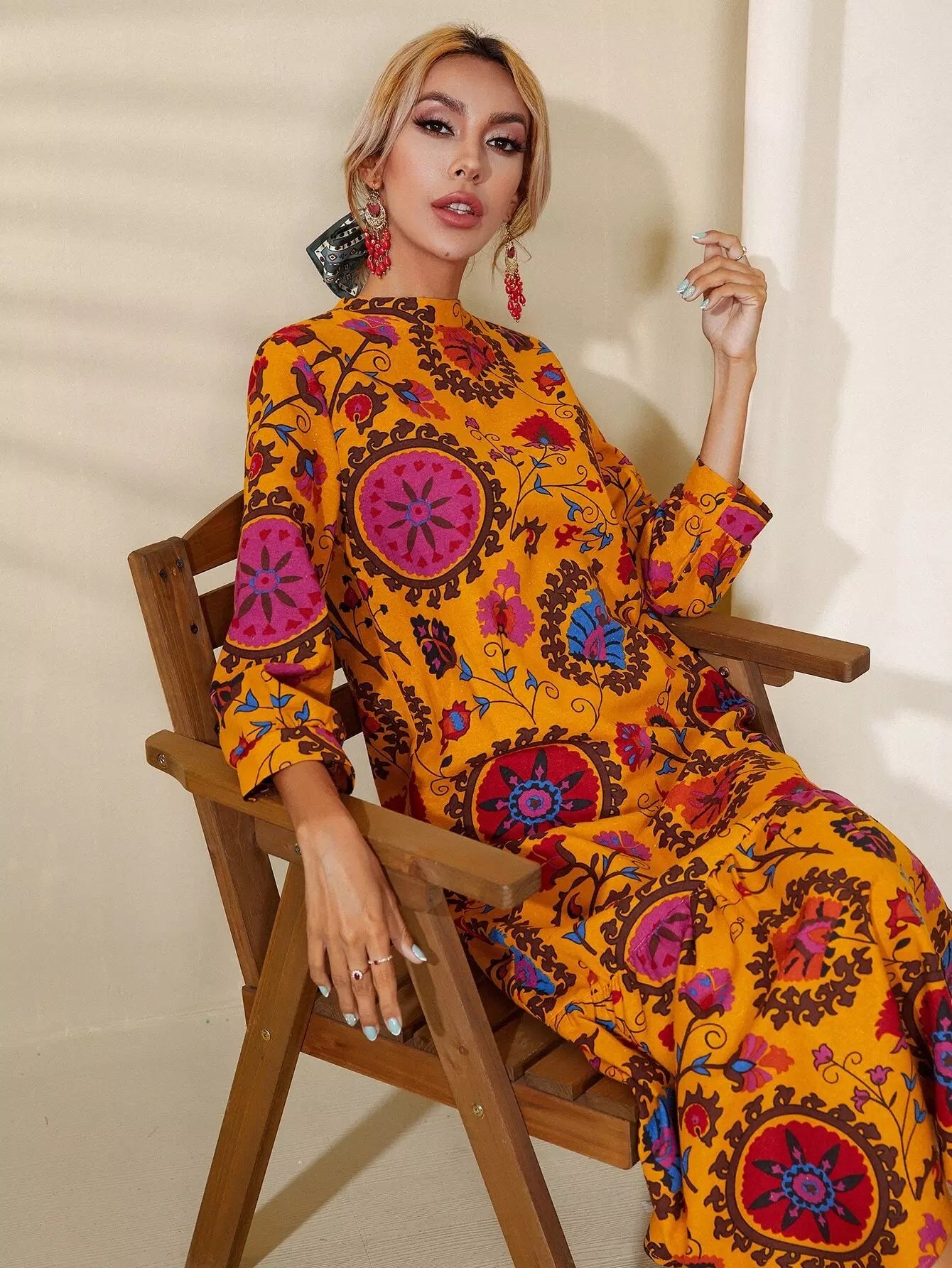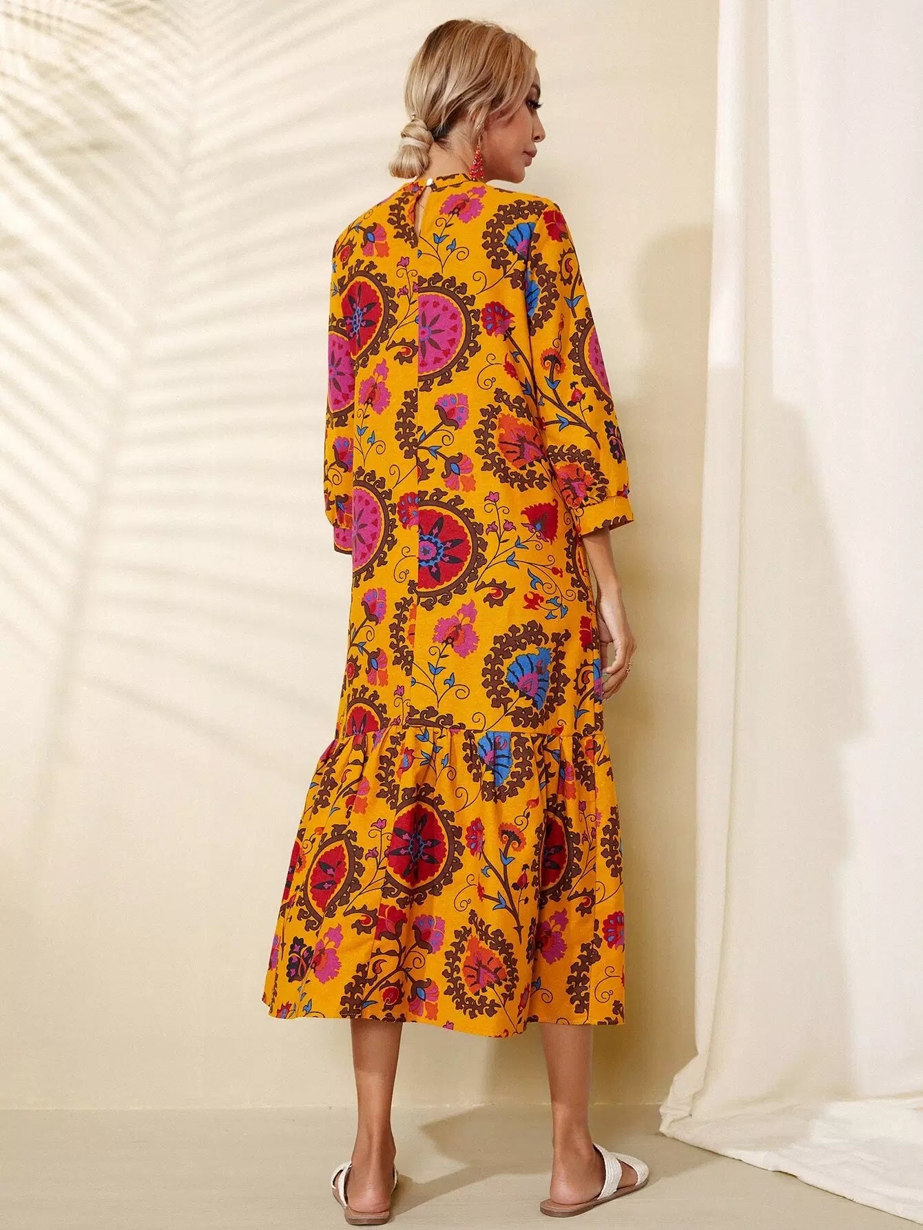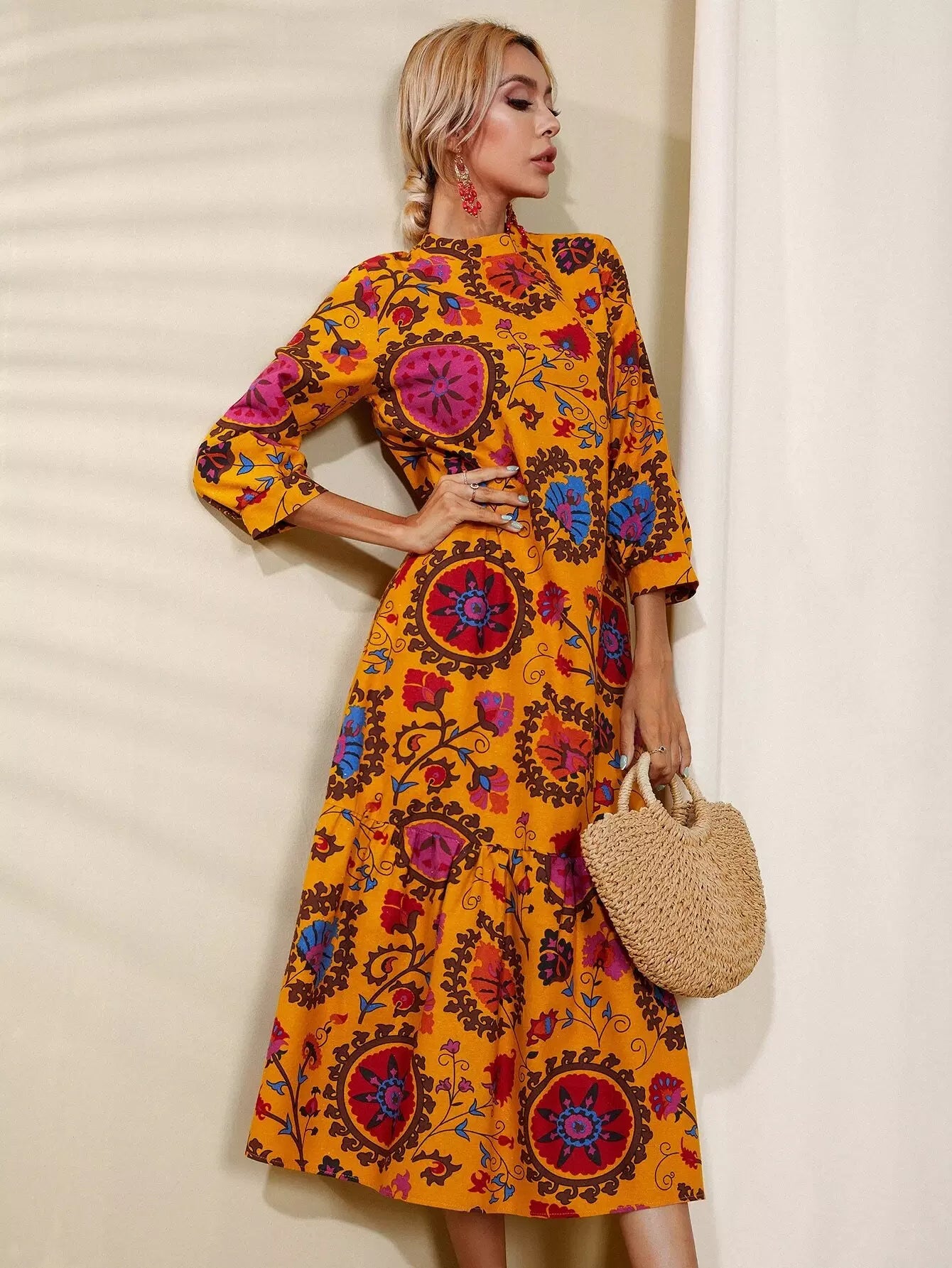 فستان زهري برقبة عالية وحافة مكشكشة
