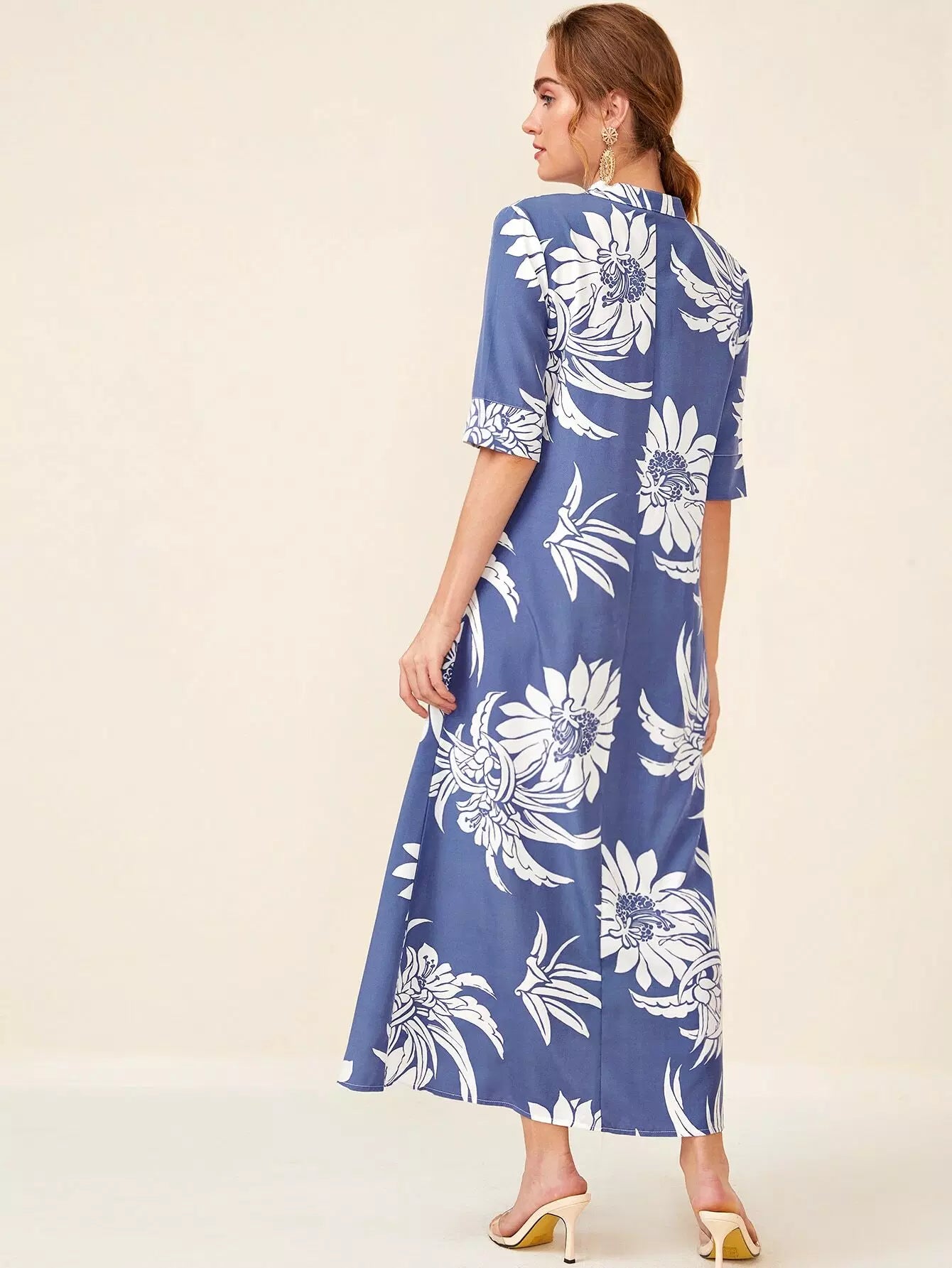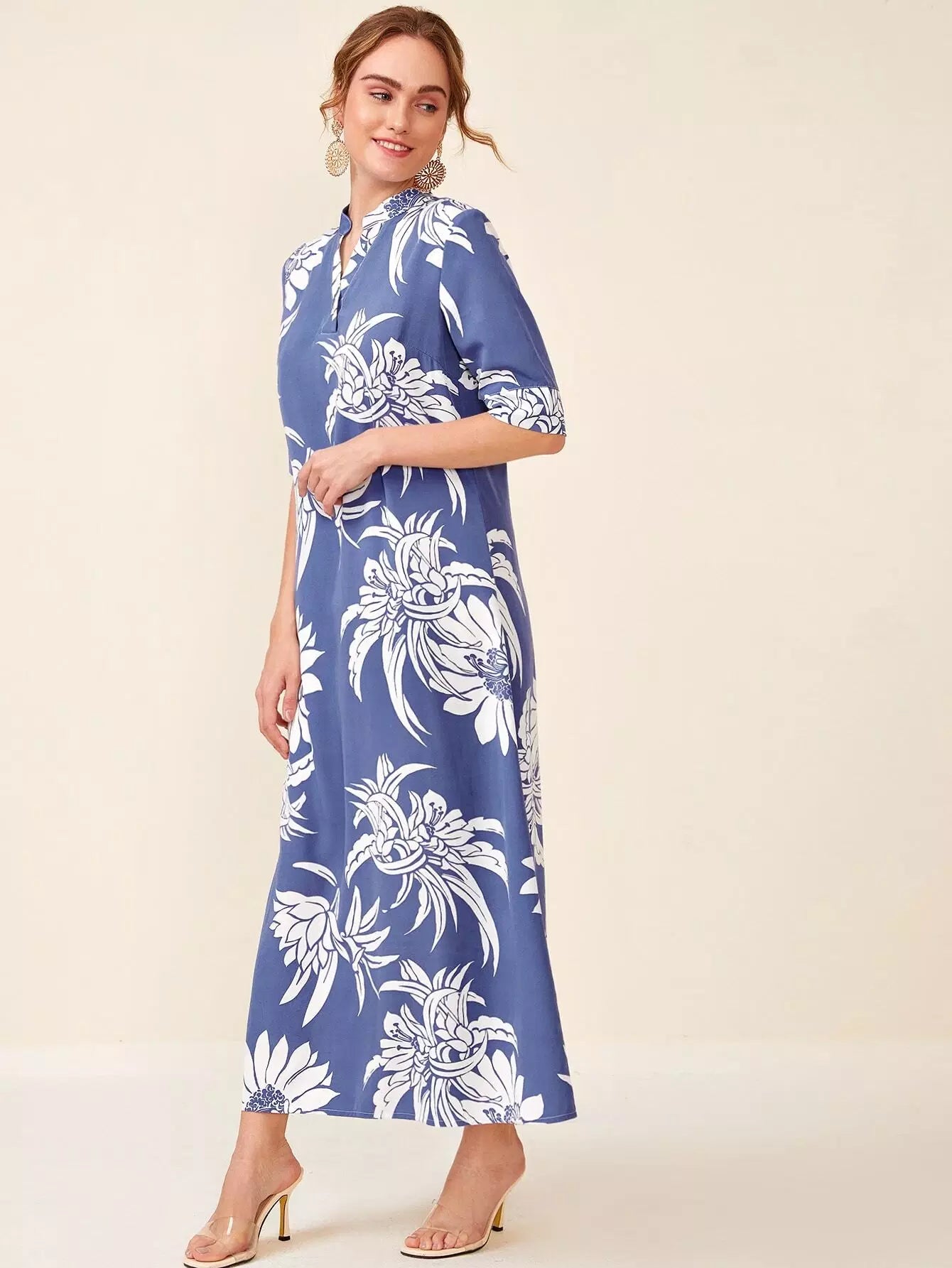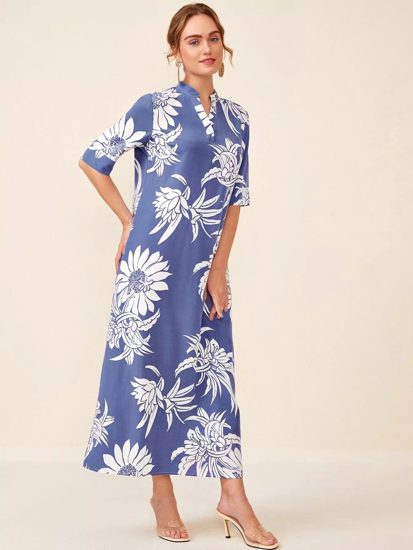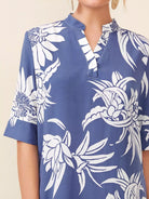فستان تونيك برقبة مزين بطبعة زهور بفتحة رقبة مدببة