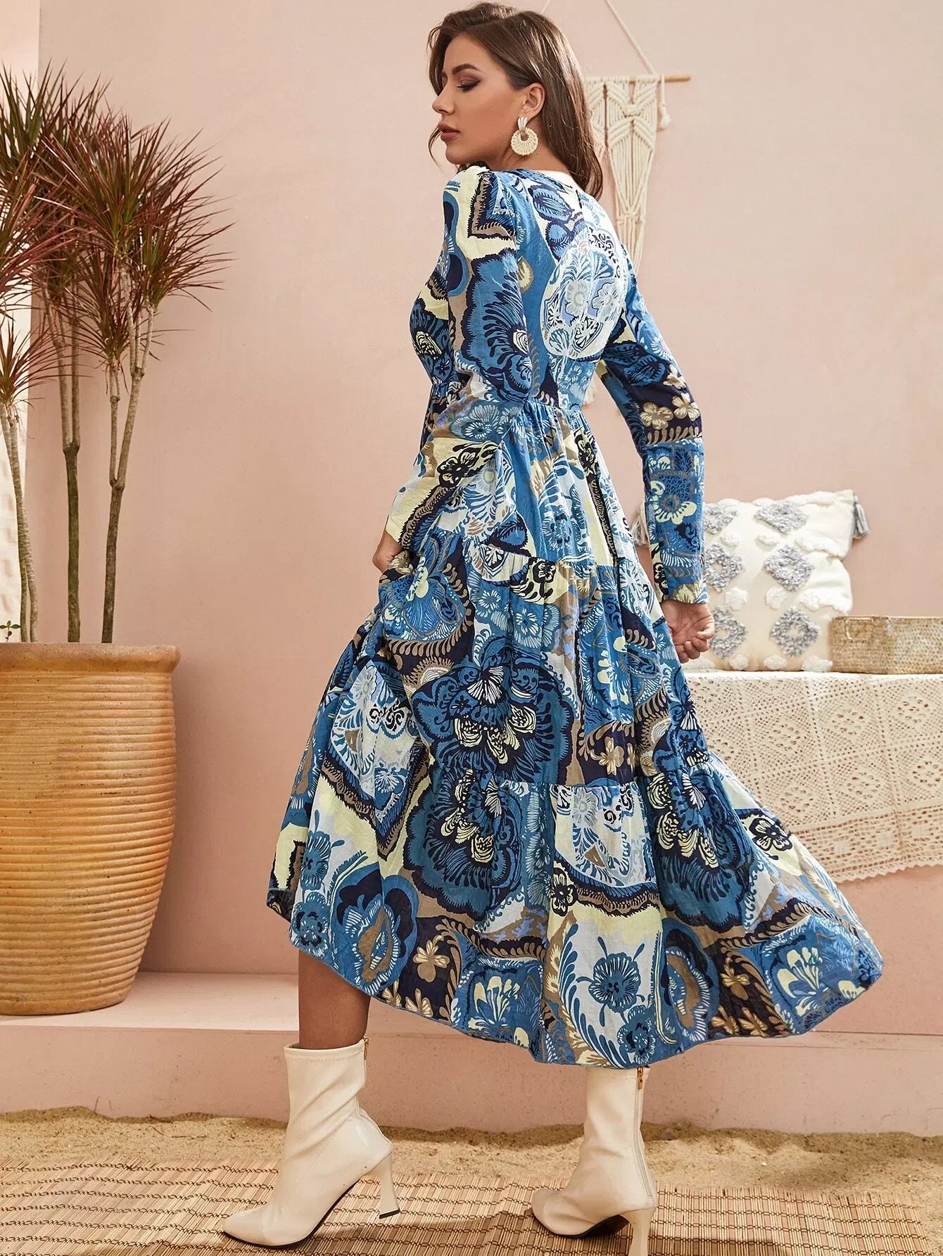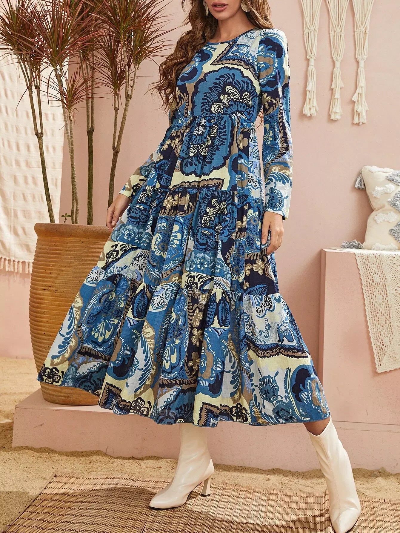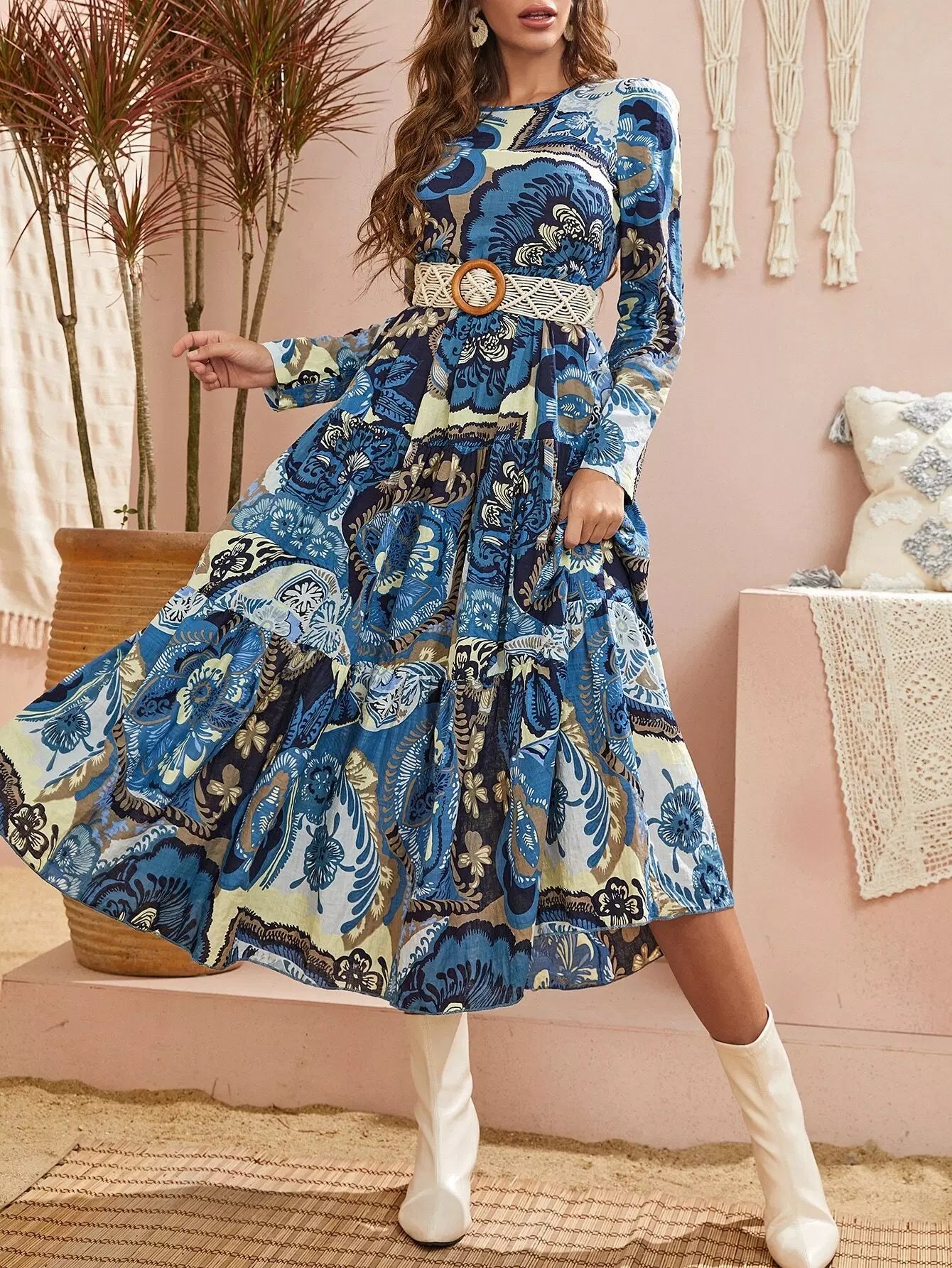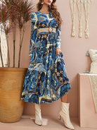 فستان بحاشية كشكش مطبوع بالزهور على شكل حرف A بدون حزام