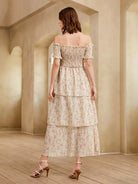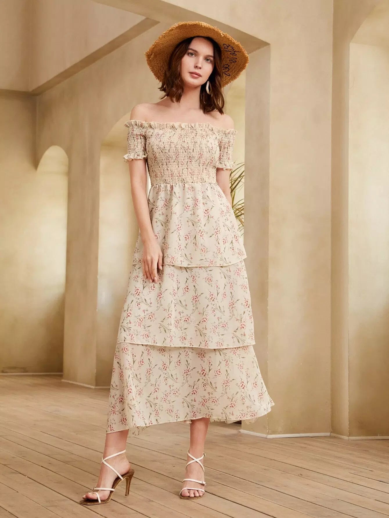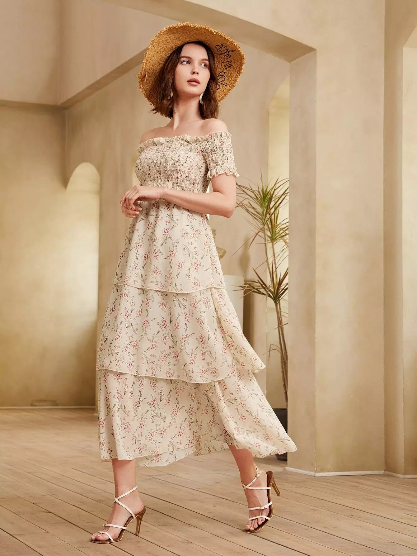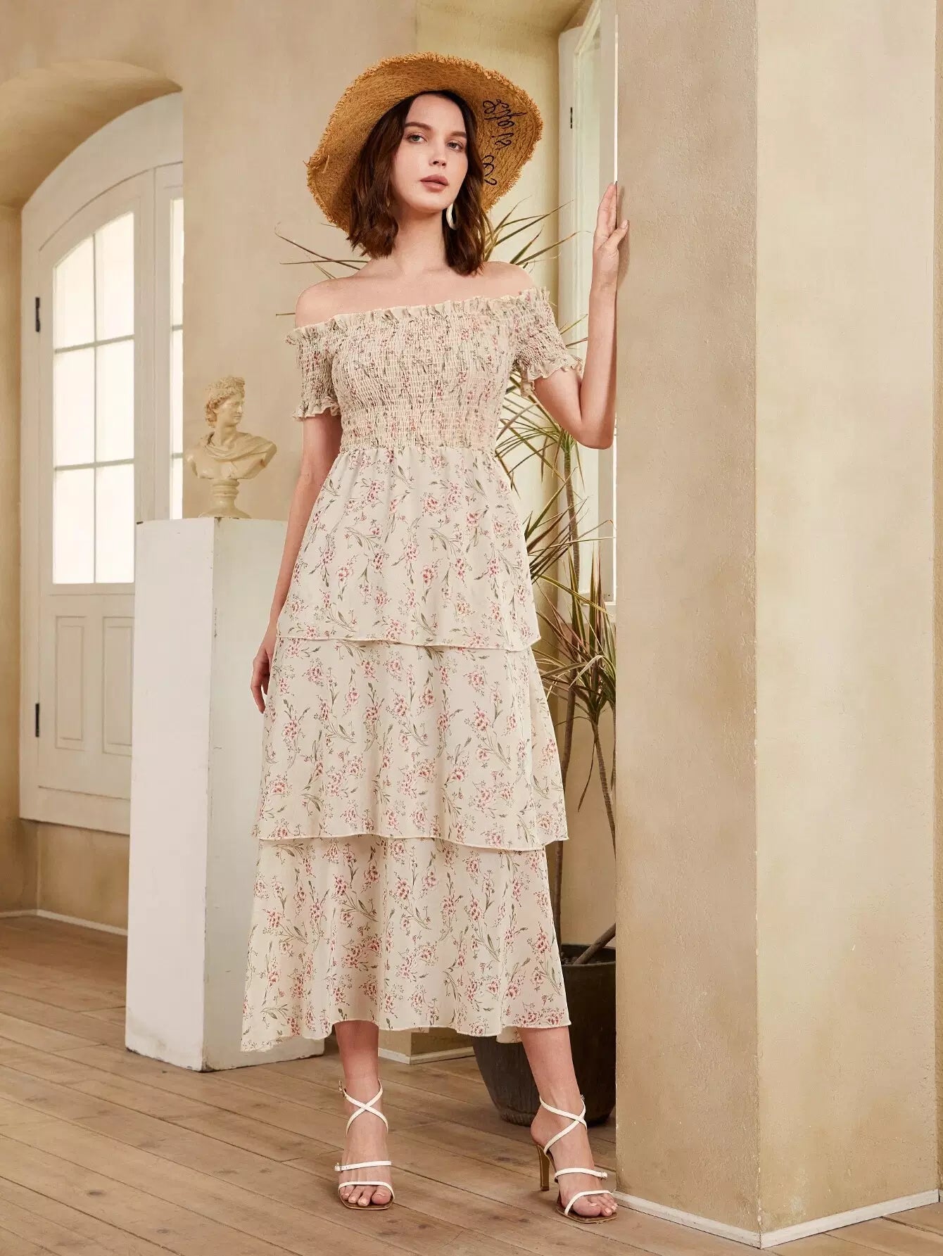 فستان باردو مزين بالزهور وذو حافة متعددة الطبقات وقصة A