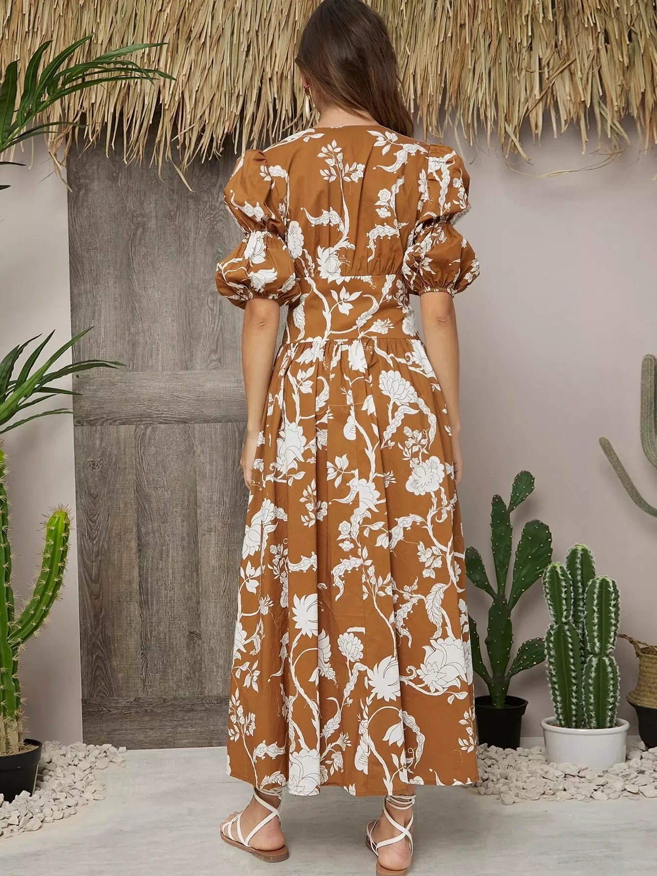 فستان بأكمام مجمعة بأزرار أمامية بأزرار