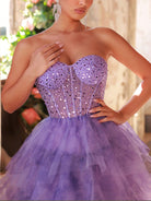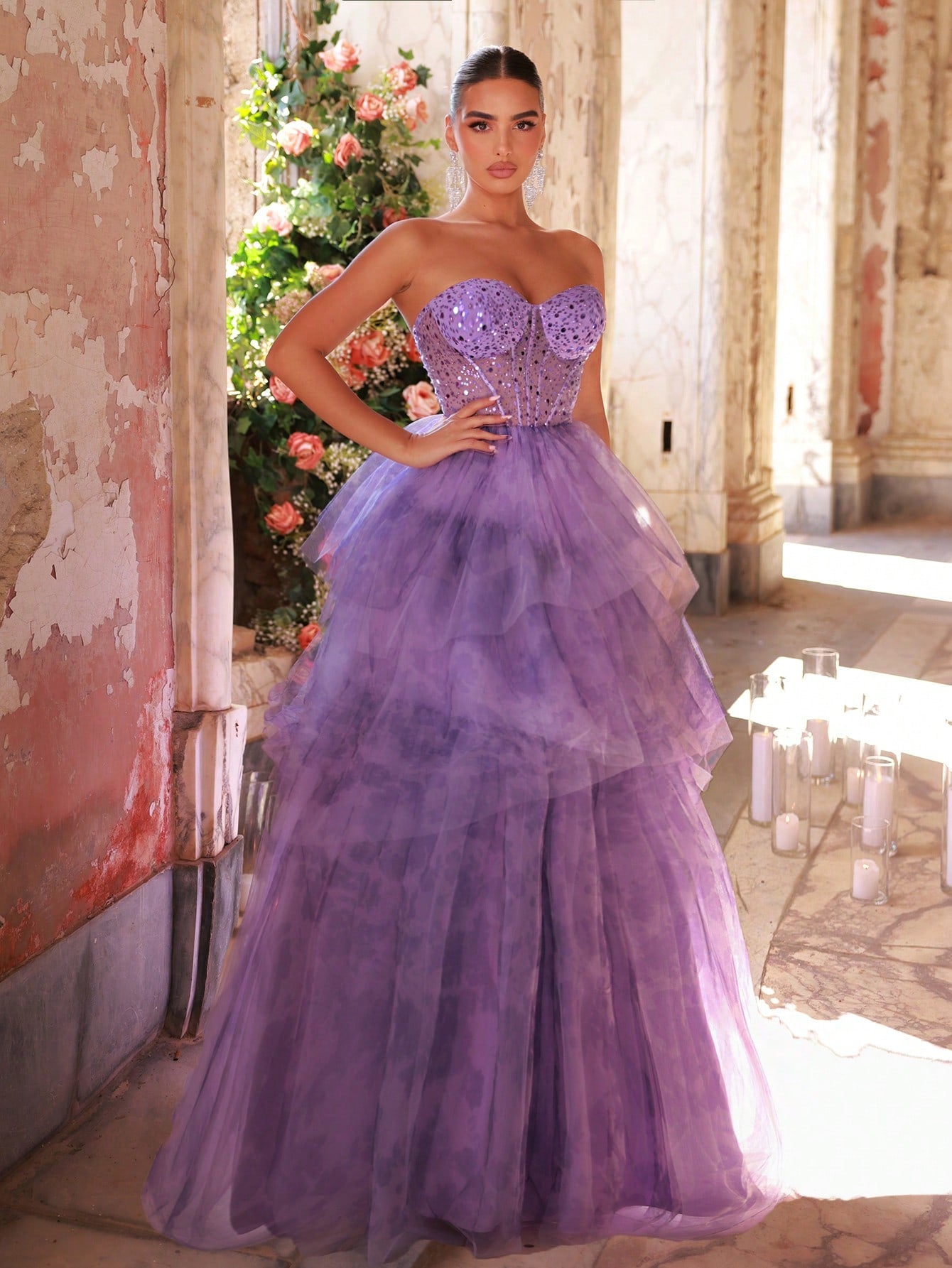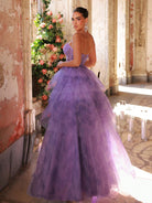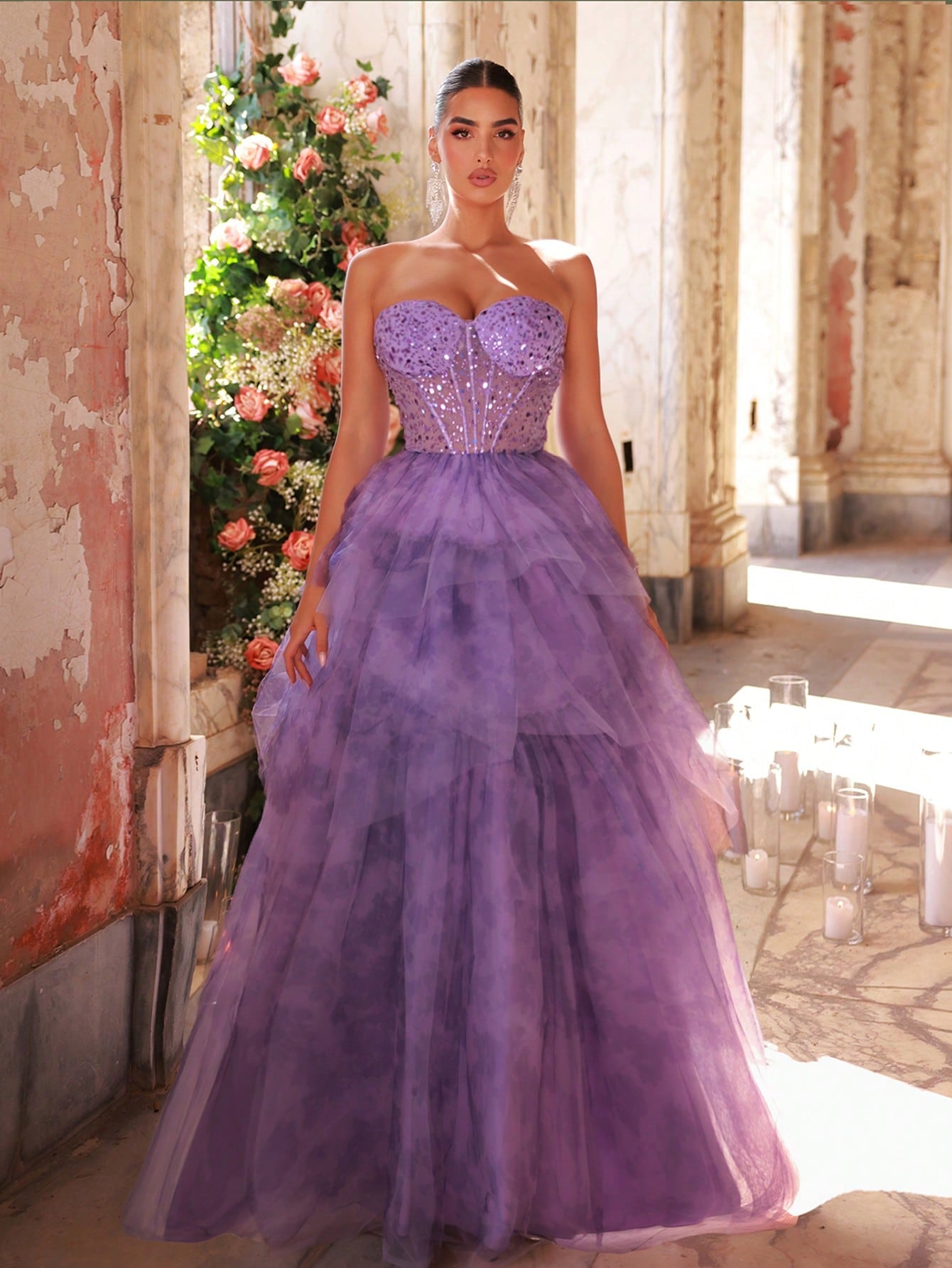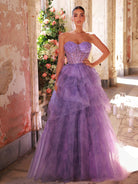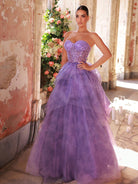 Glamrae Elegant Lavender Luxury Sequin Embellished Strapless Waist See-Through Mesh Hemline Floral Print