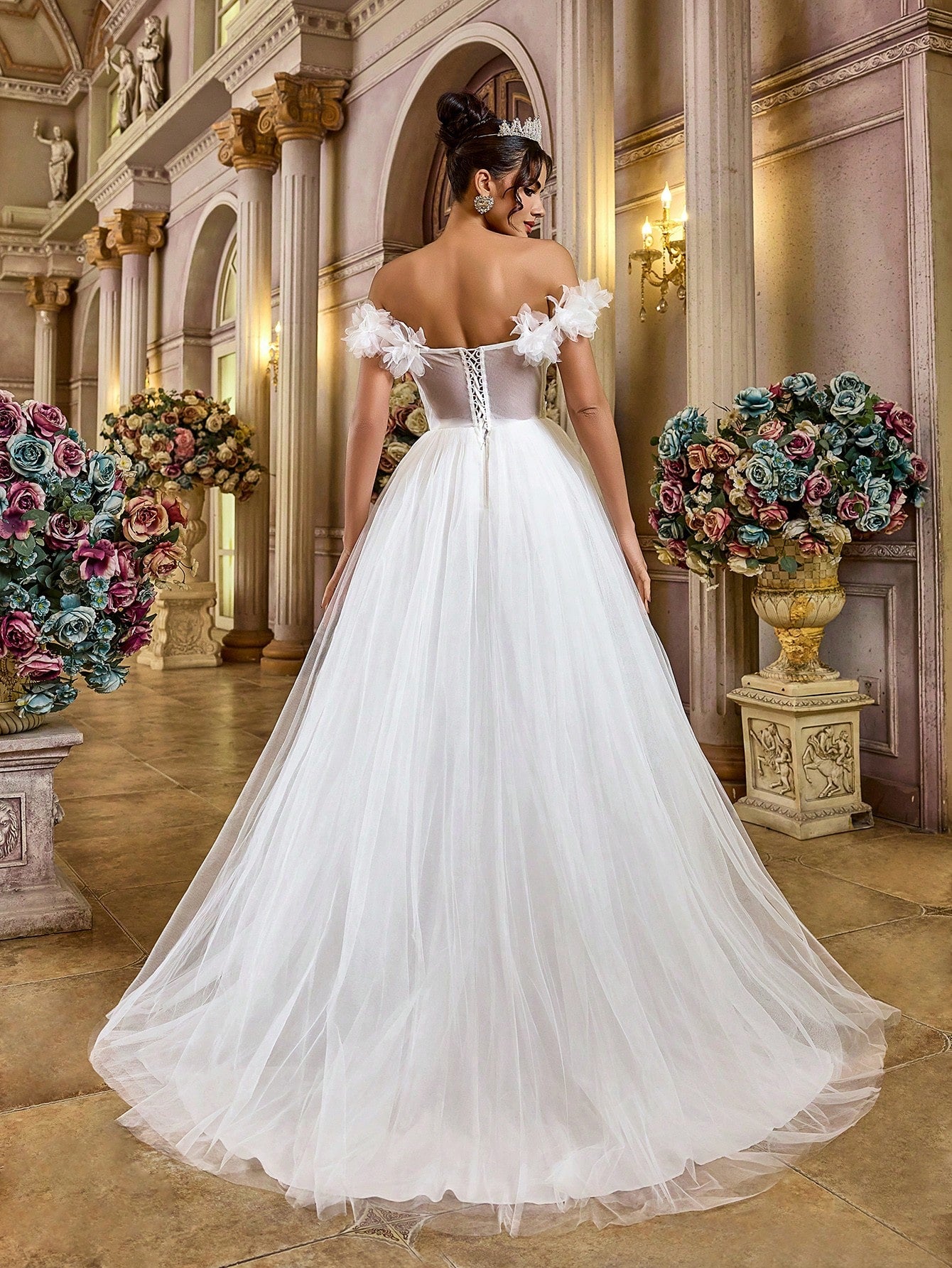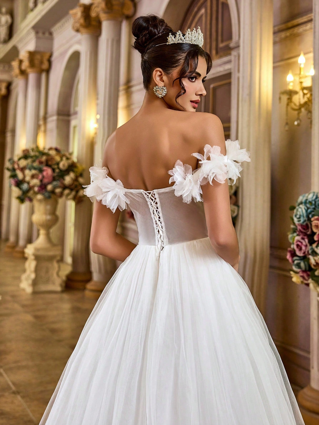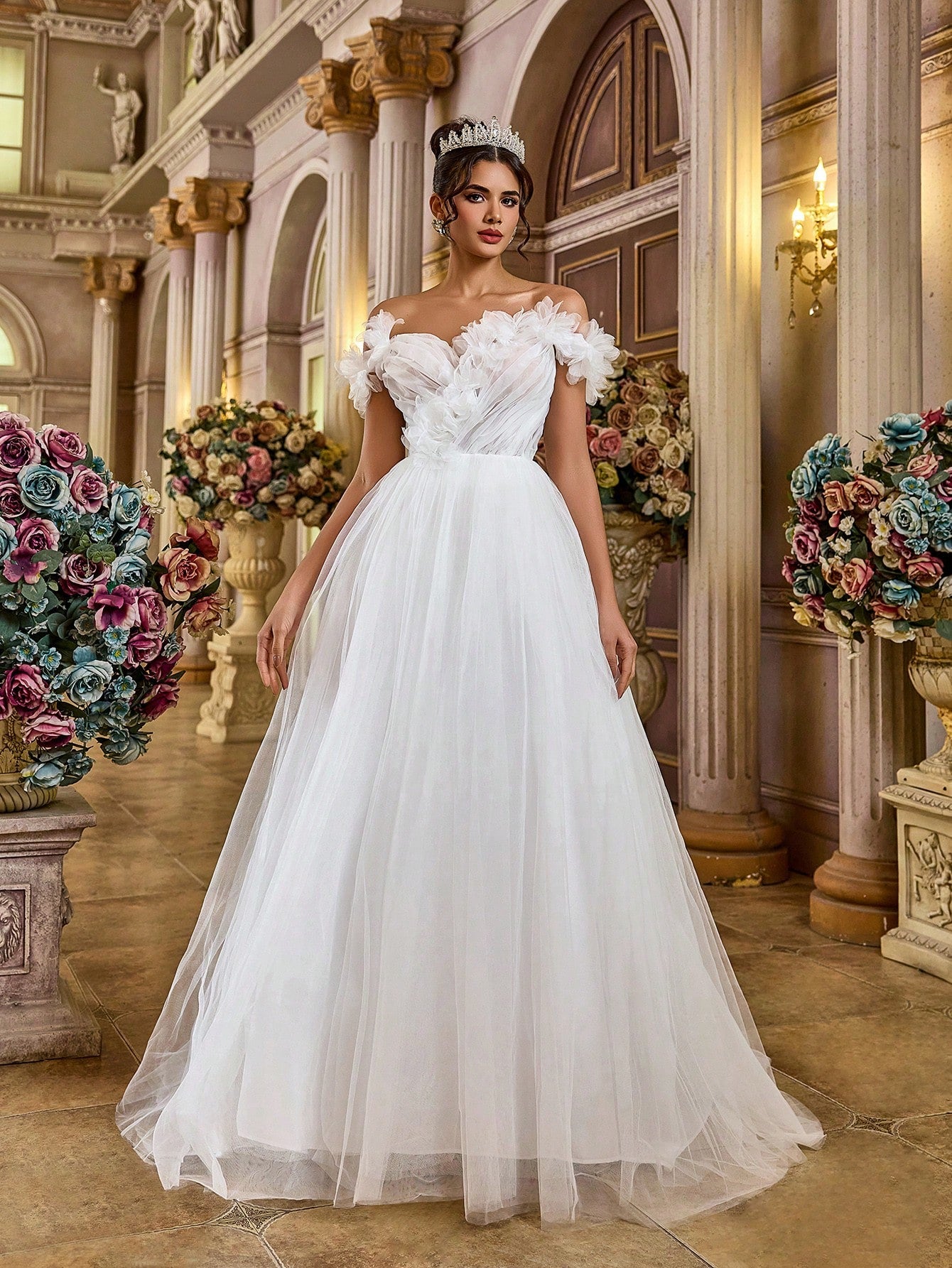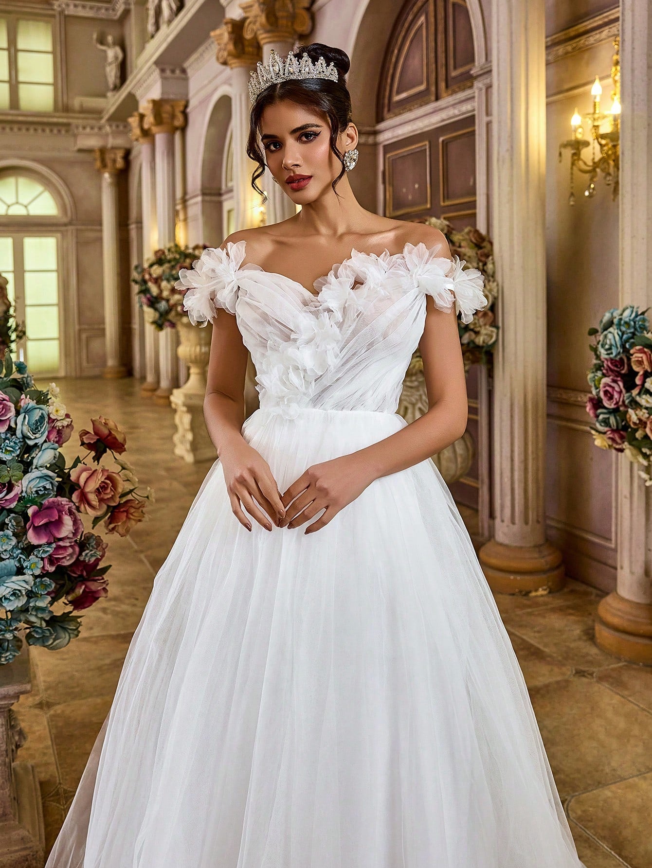 Glamrae Summer Elegant Romantic Sexy White One-Shoulder 3D Three-Dimensional Flower Design Pleated Fluffy