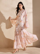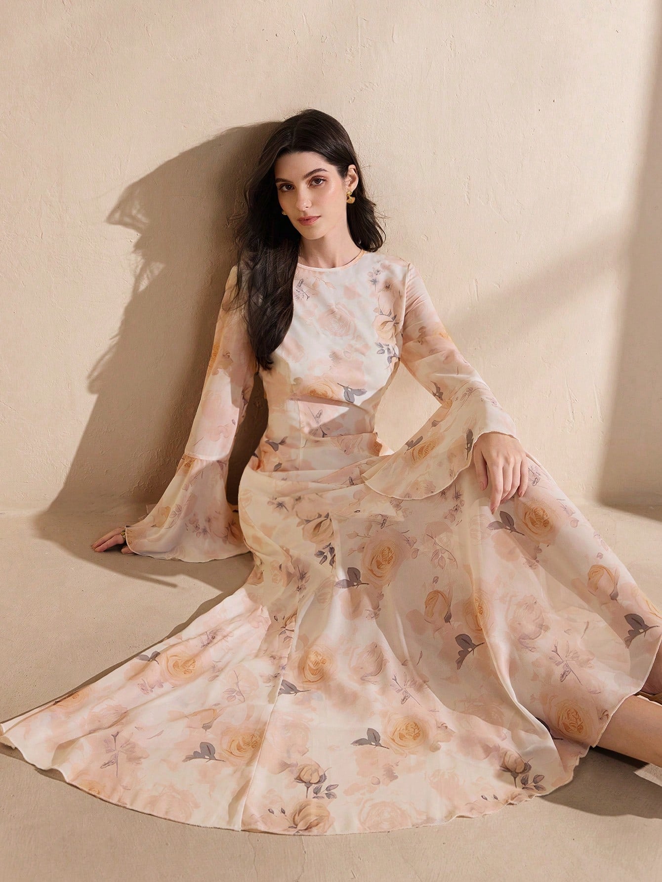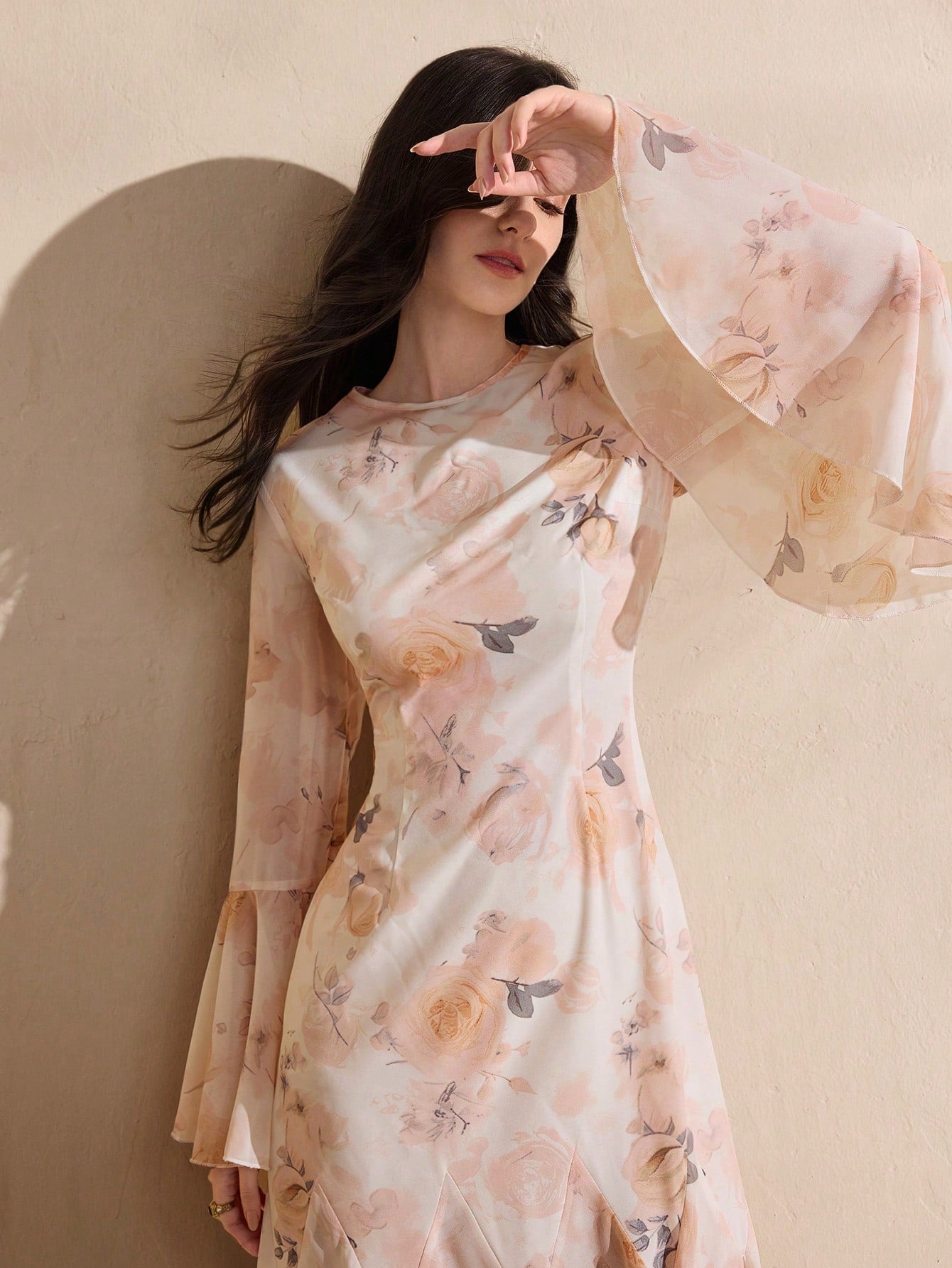 Graceveil Women's Spring Summer Chiffon Long Romantic Floral Patchwork Flare Sleeve Modest Elegant Fashion