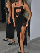 ICON Women Sexy Asymmetric Neck Hollow Out Slit Party Dress With Mesh Fabric
