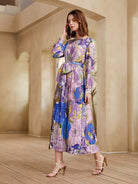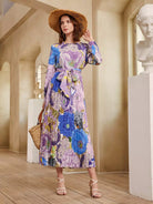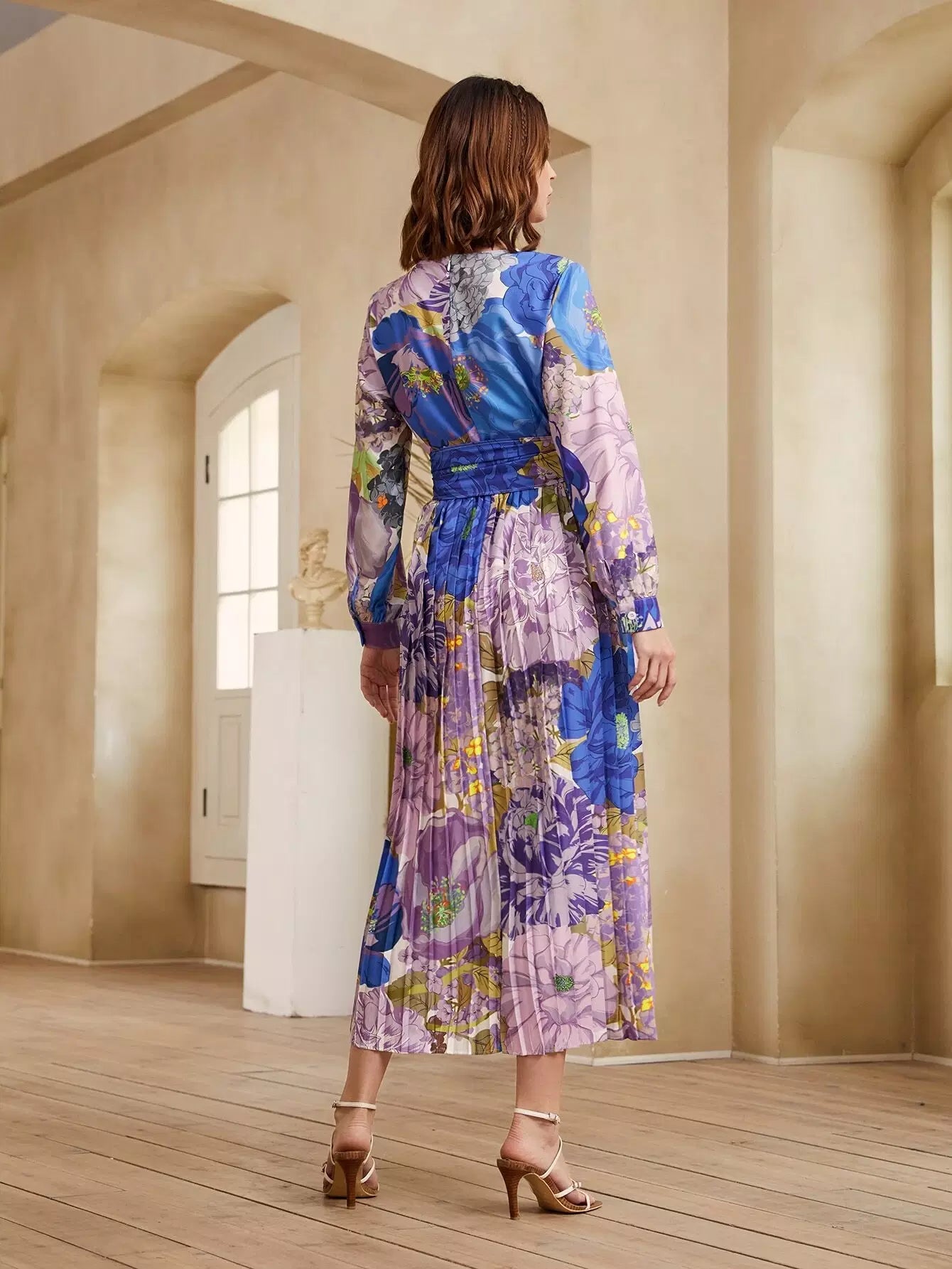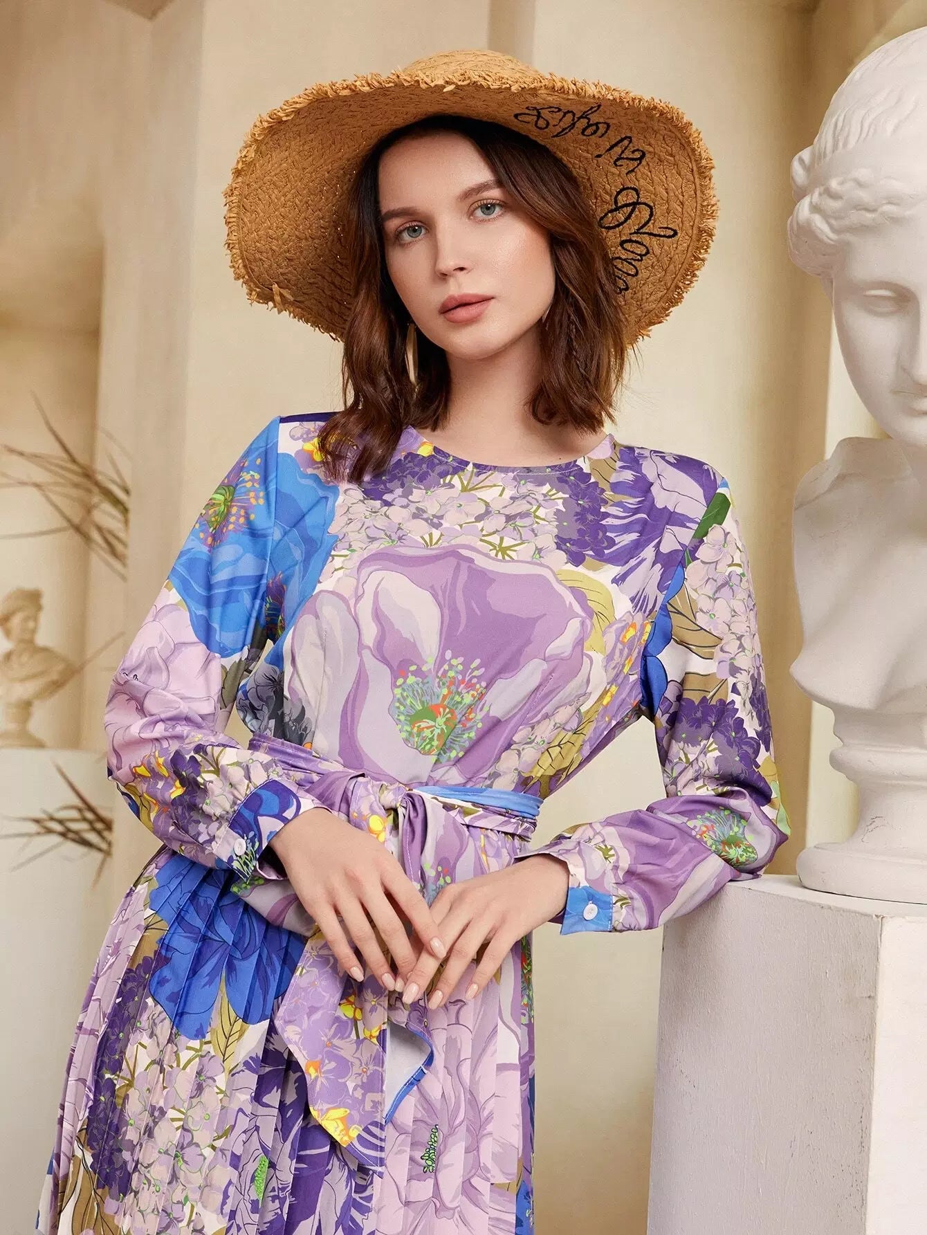 فستان بحاشية مطوي كبير مزين بالزهور بدون حزام