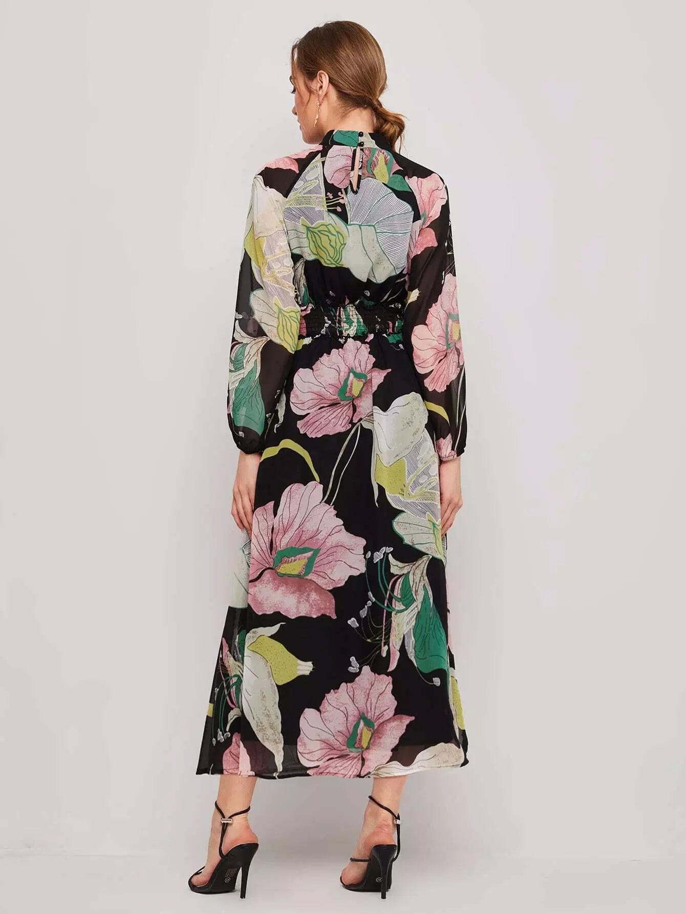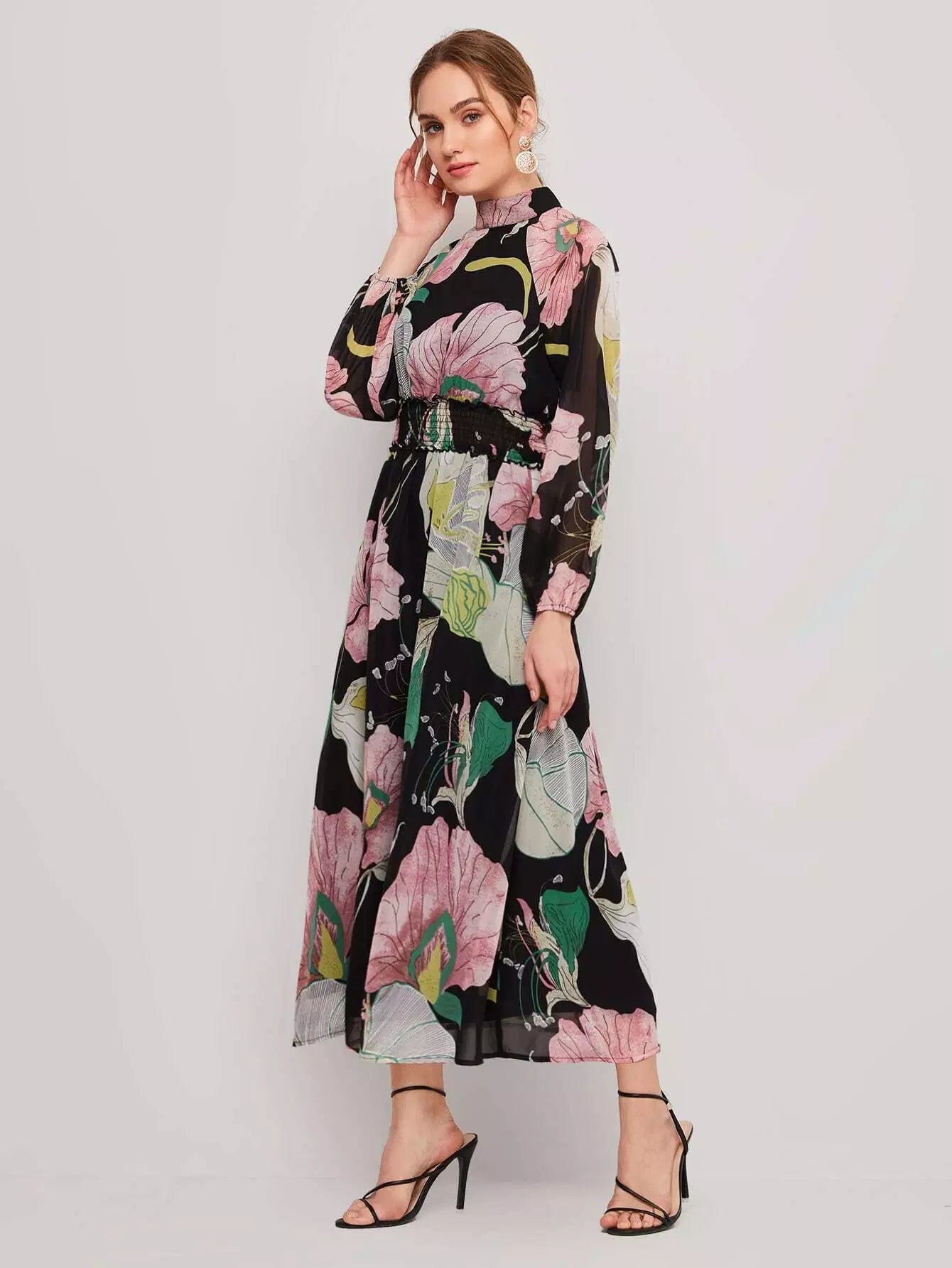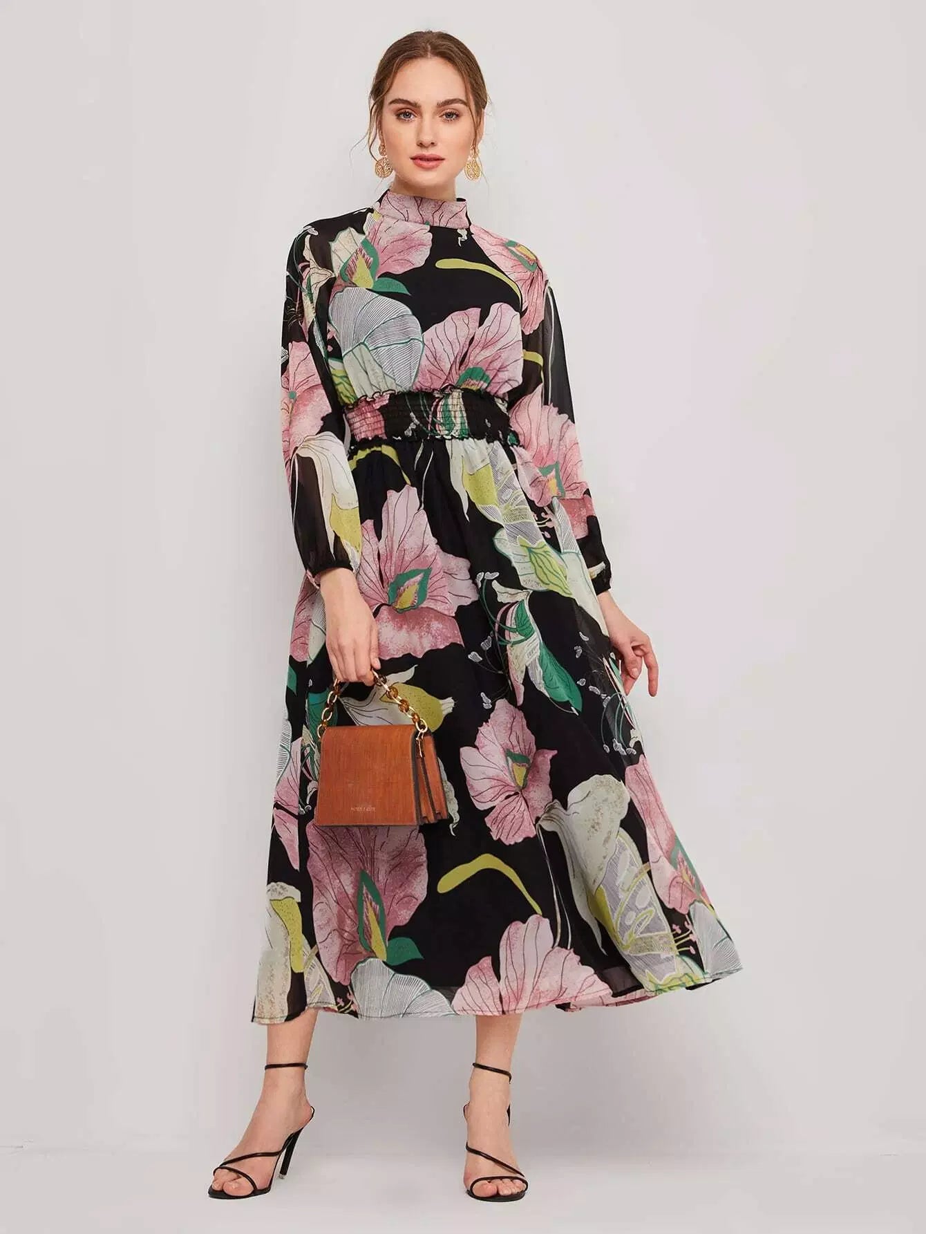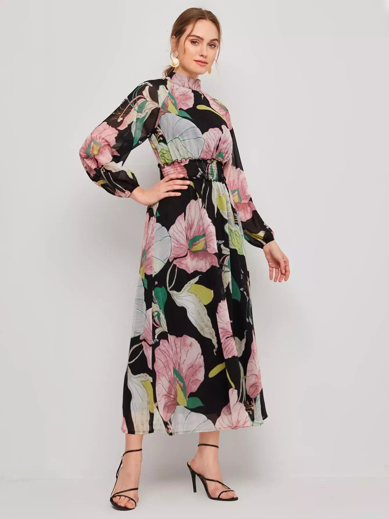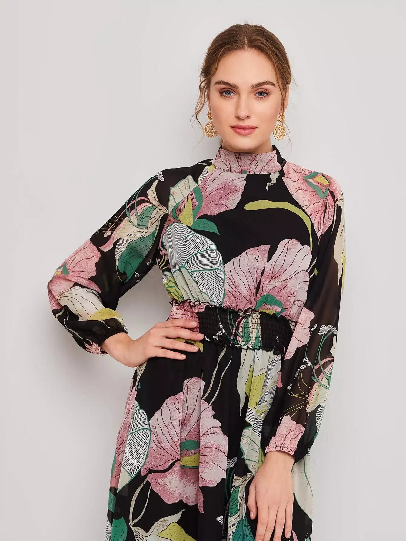 فستان زهري برقبة وهمية بفتحة رقبة وهمية وخصر مكشوف