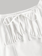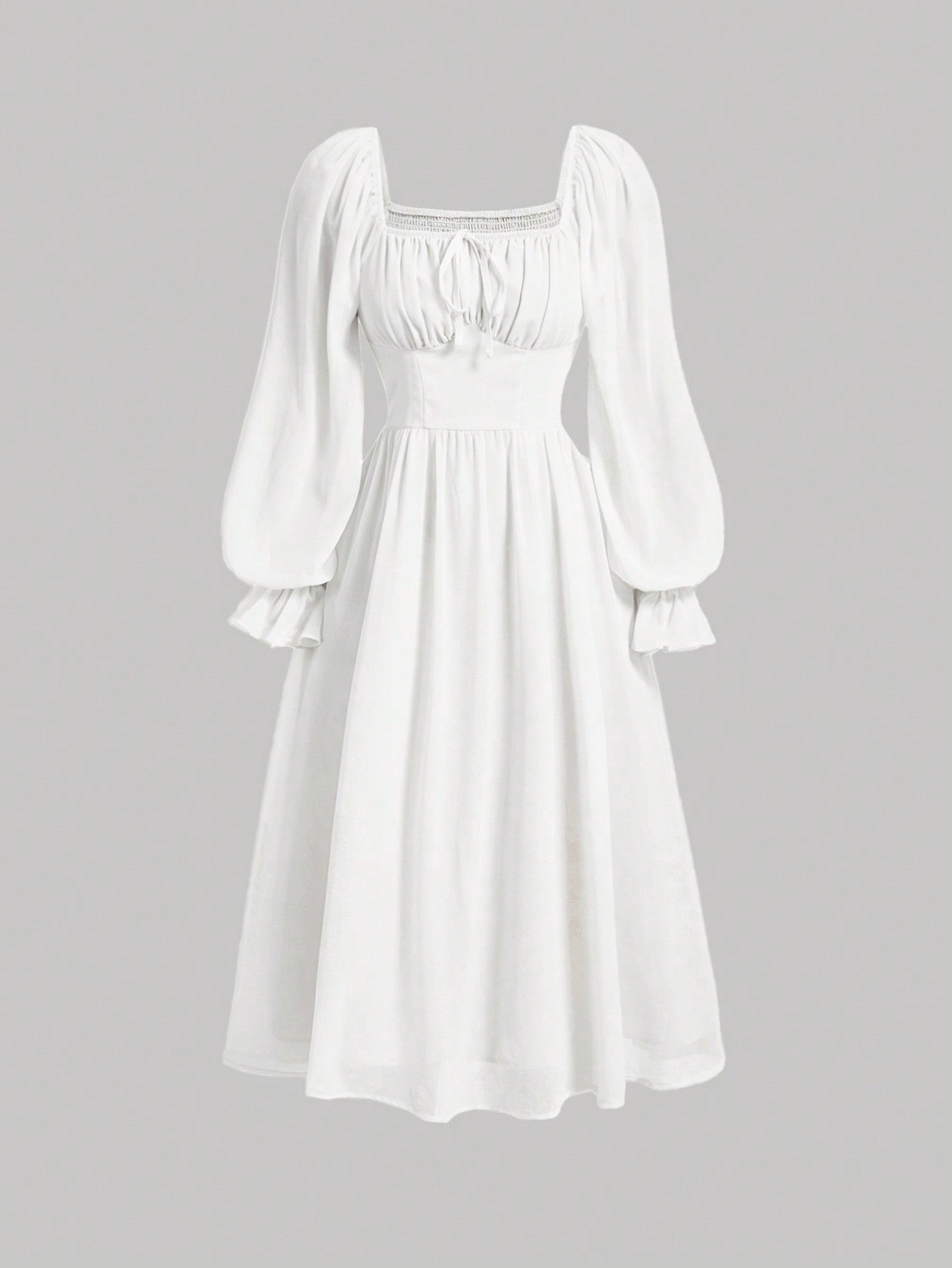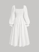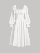 فستان أبيض بتصميم وصيفة الحليب، بياقة مربعة وأكمام واسعة وصدر مكشكش، مناسب لحفلات التخرج