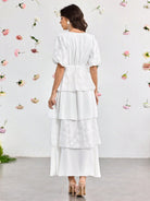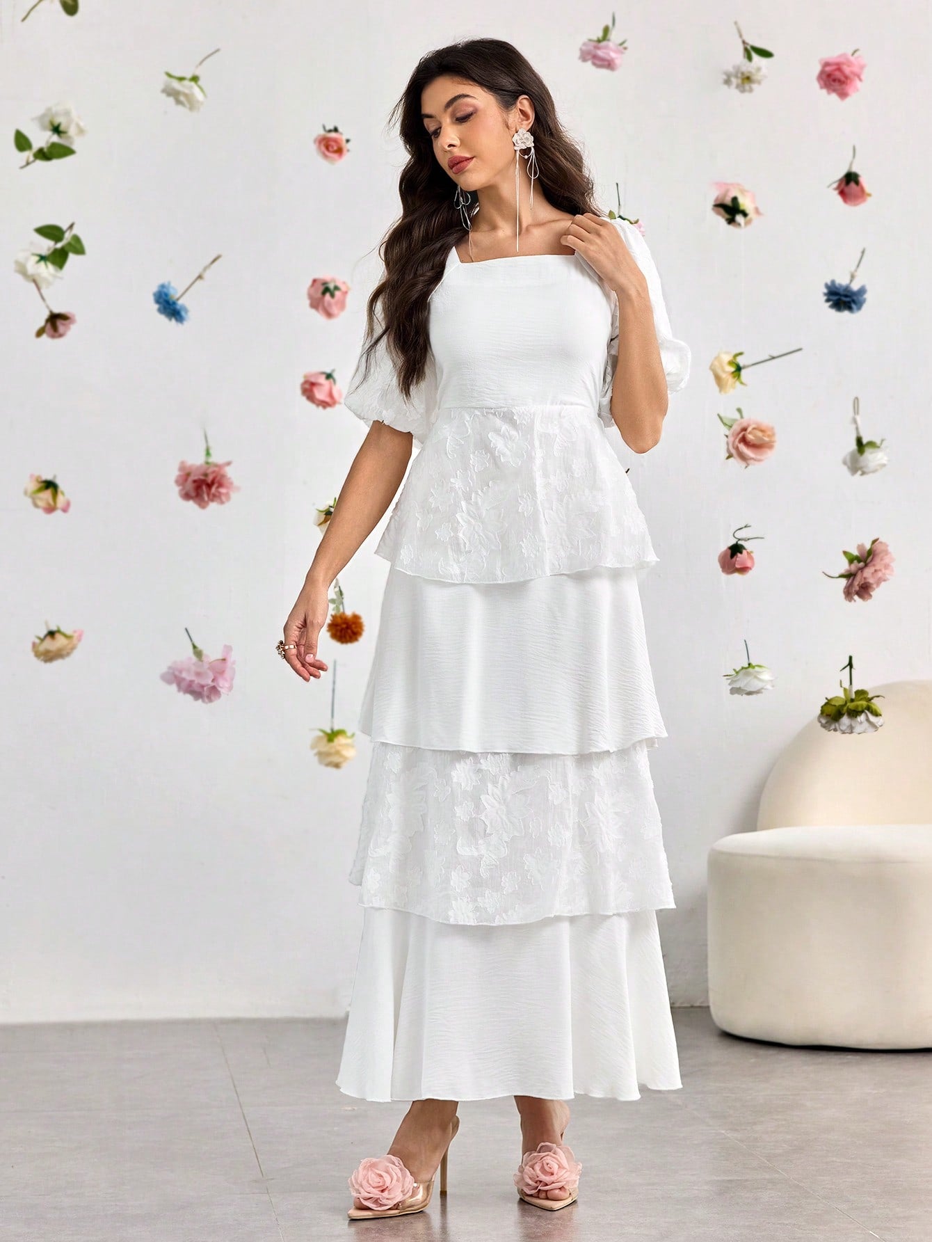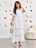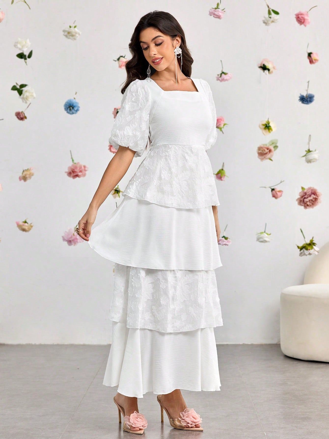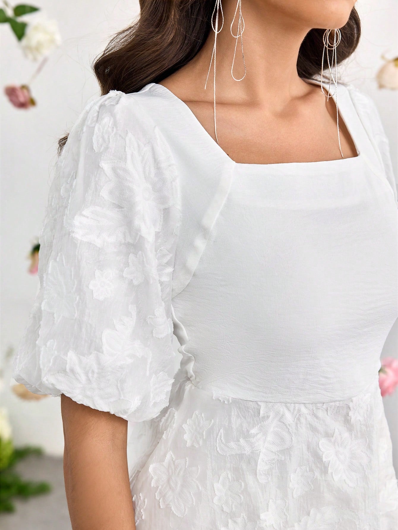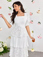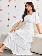 فستان نسائي طويل من موديلين، مزين بنقوش زهور، وحافة مكشكشة، وياقة مربعة، وأكمام منفوخة، مثالي لإطلالة رومانسية في العطلات.