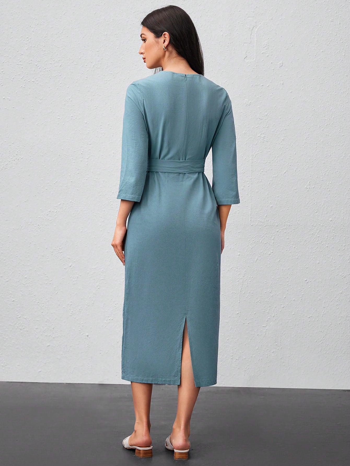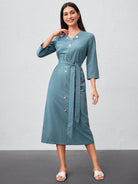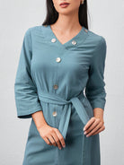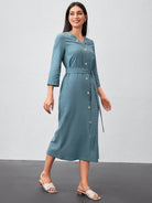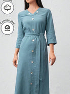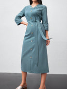 Mulvari Button Detail Waist Cinched Long Sleeve Dress