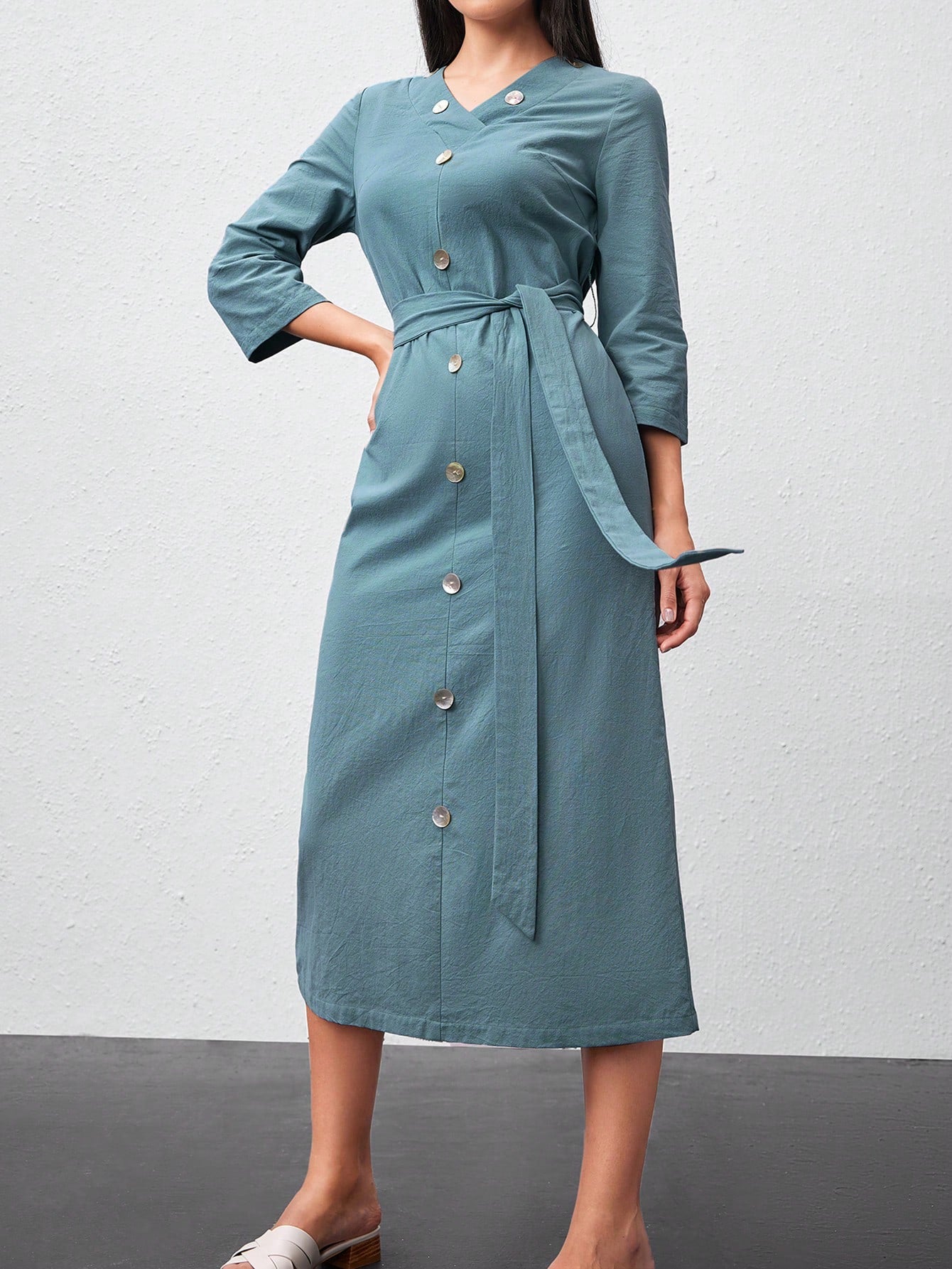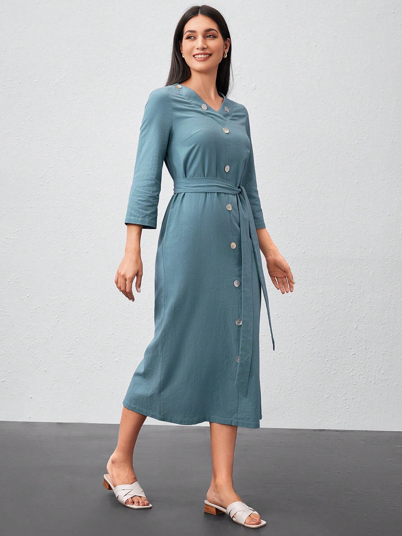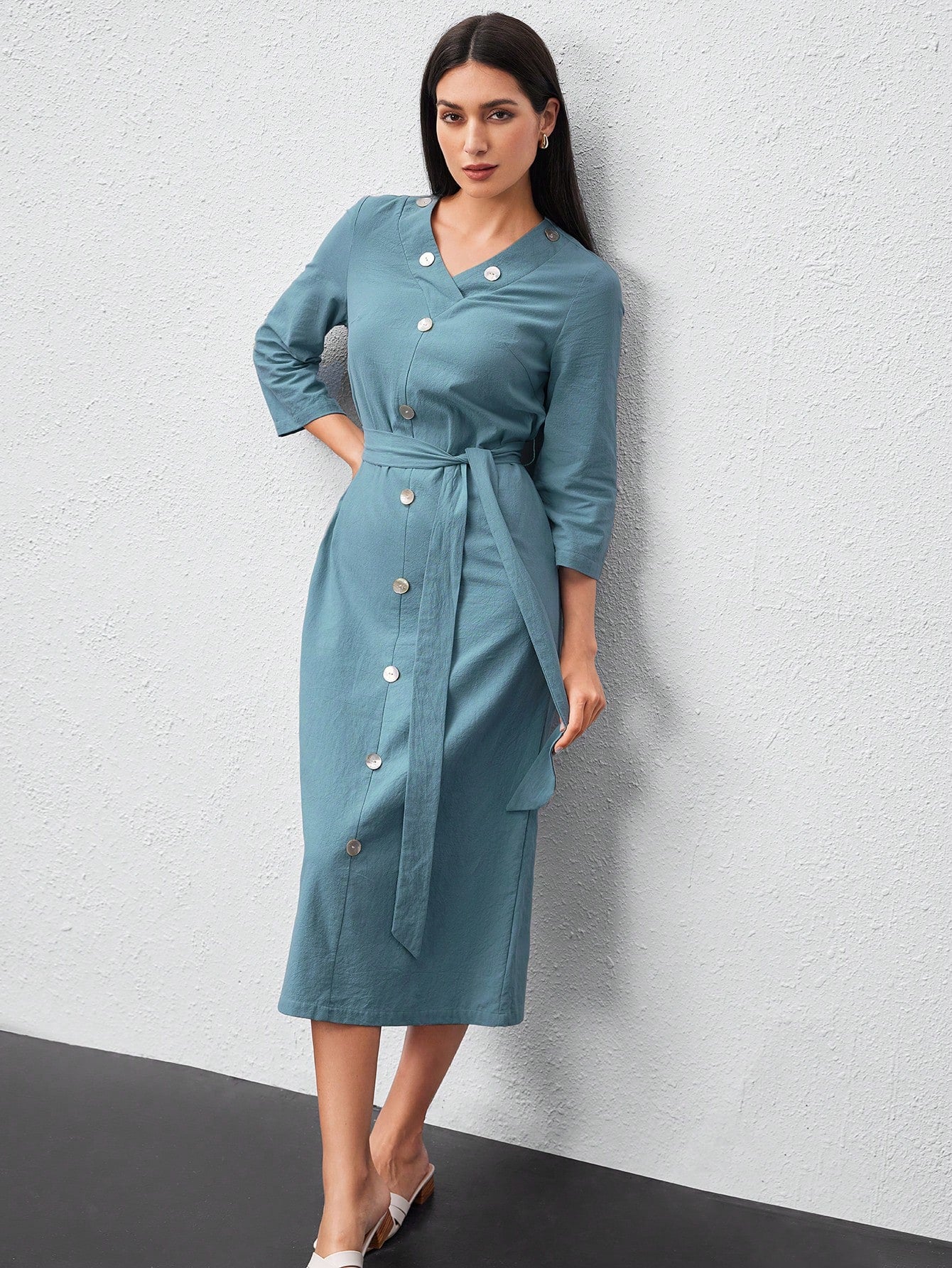 فستان مولفاري بأكمام طويلة وتفاصيل أزرار وحزام خصر