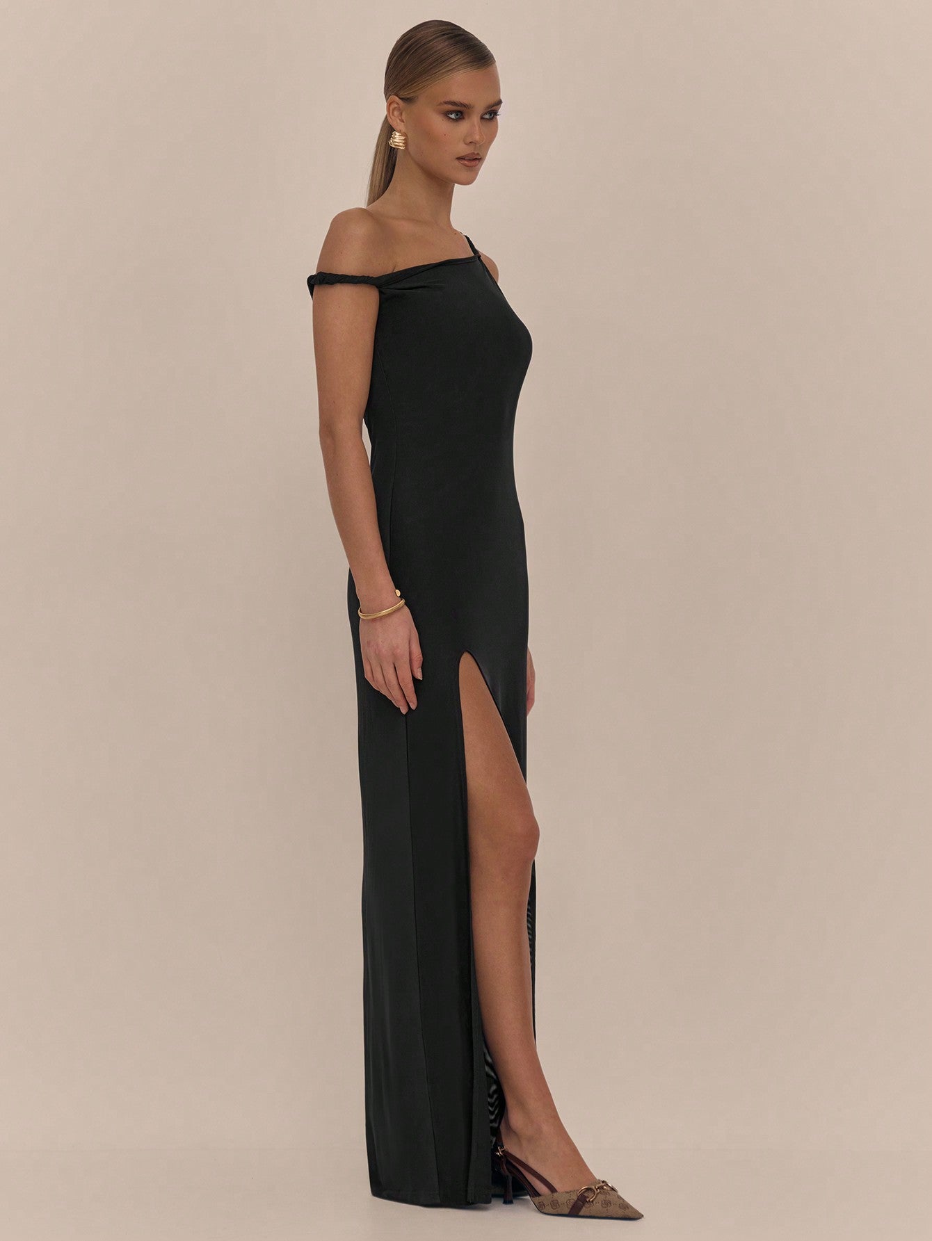 فستان موسيرا ماكسي بفتحة جانبية غير متماثلة عند الكتفين، مناسب لحفلات الزفاف الربيعية، والتخرج، والعطلات الأنيقة في إيبيزا