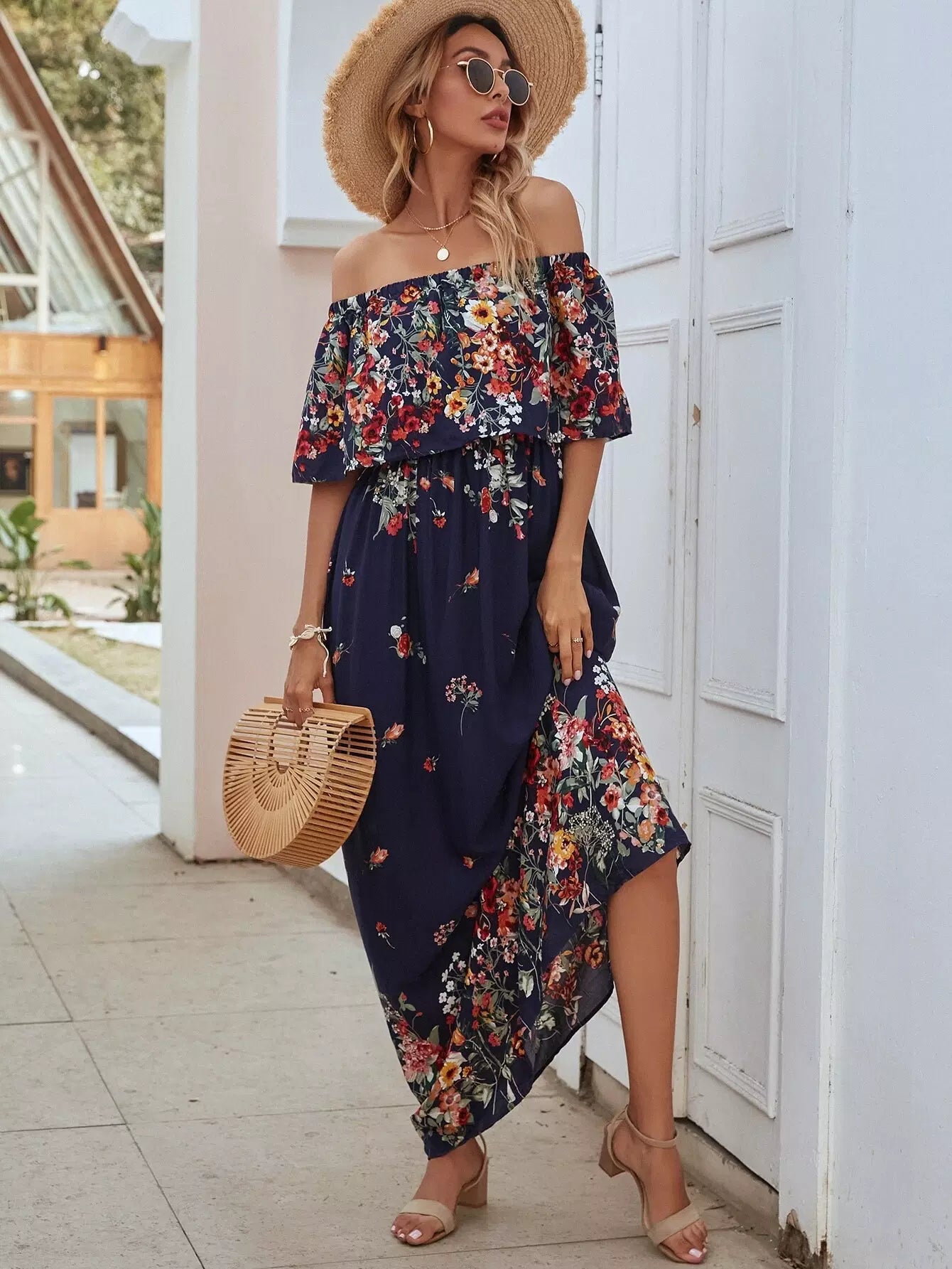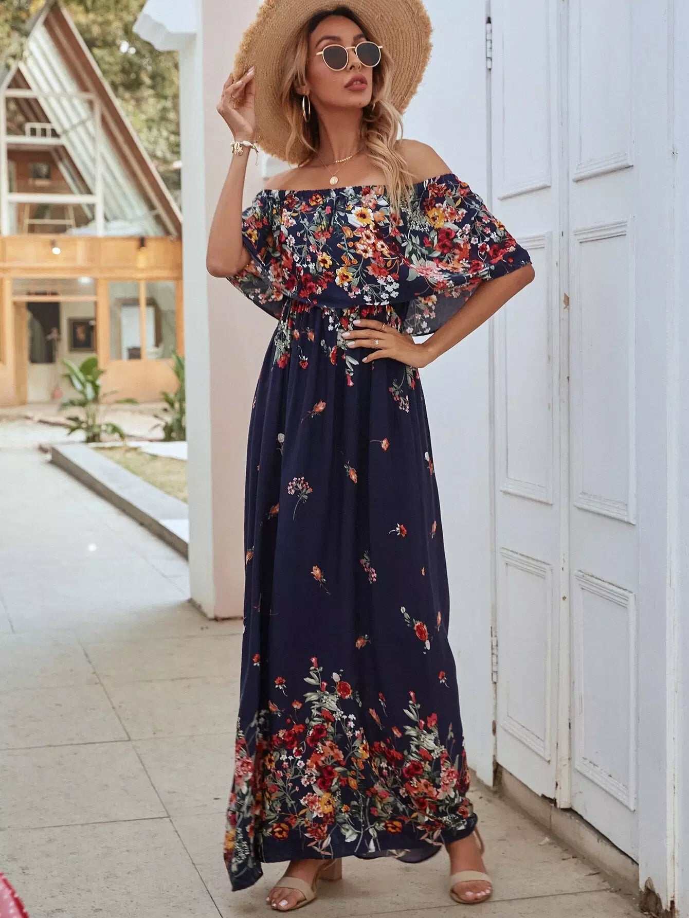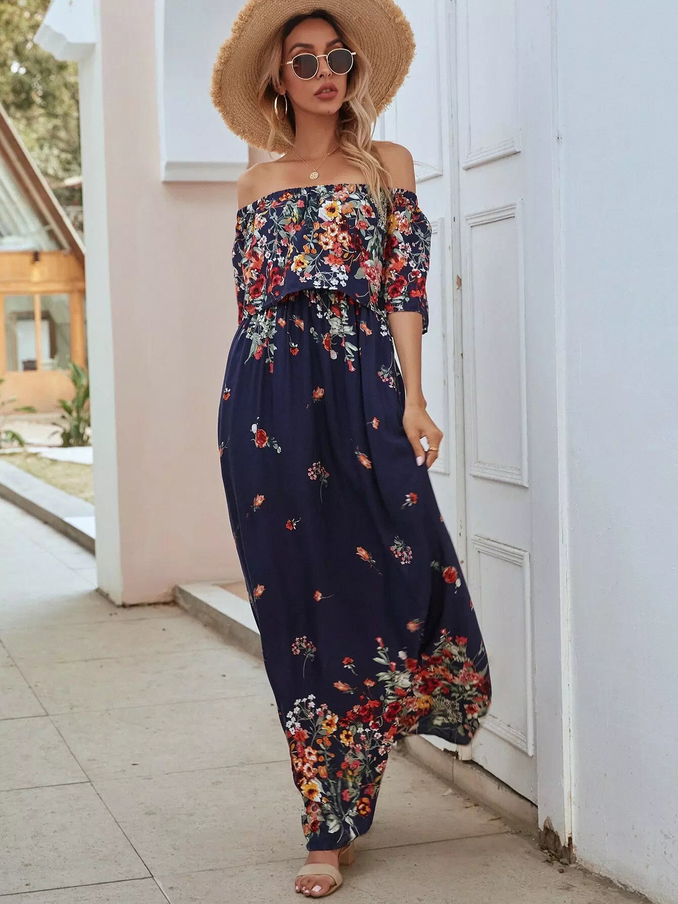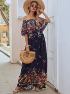 فستان ماكسي مكشوف الأكتاف مزين بالورود