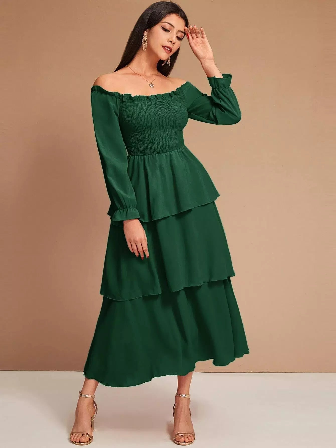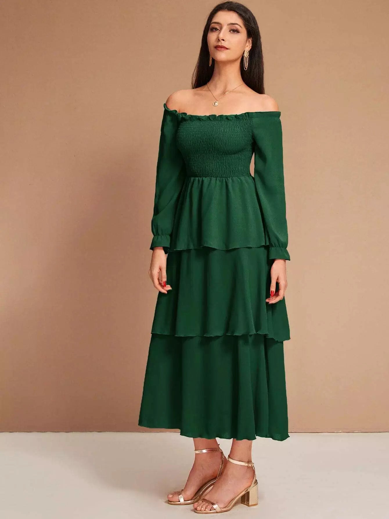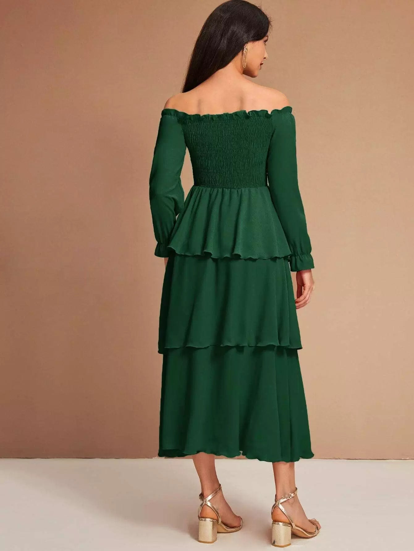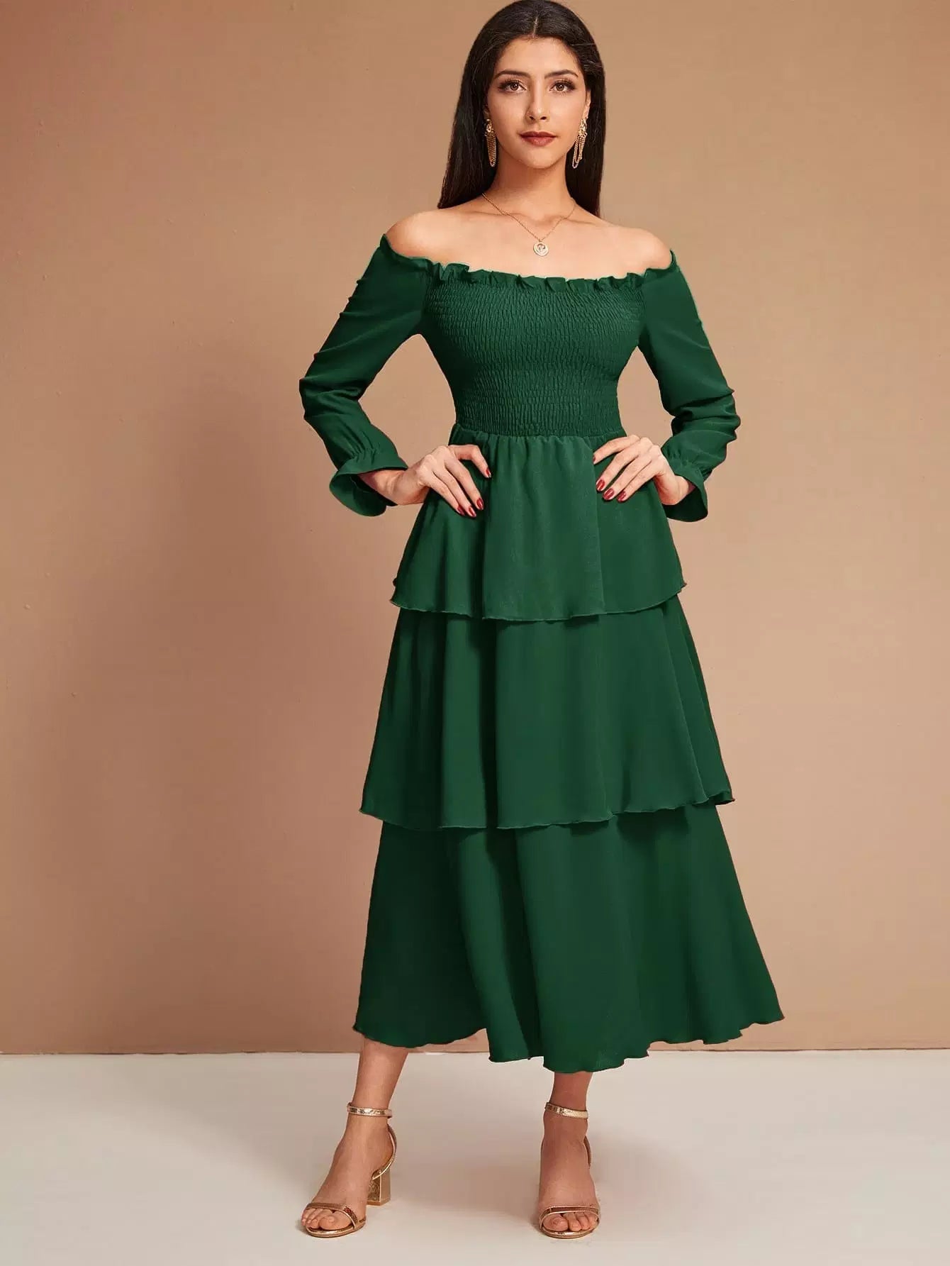 فستان بحواف متعددة الطبقات مكشوف الأكتاف بحافة شيرد