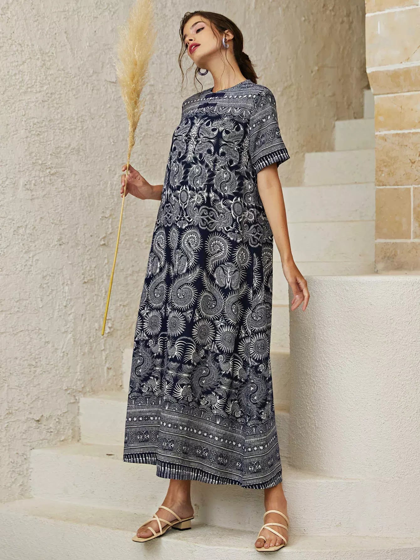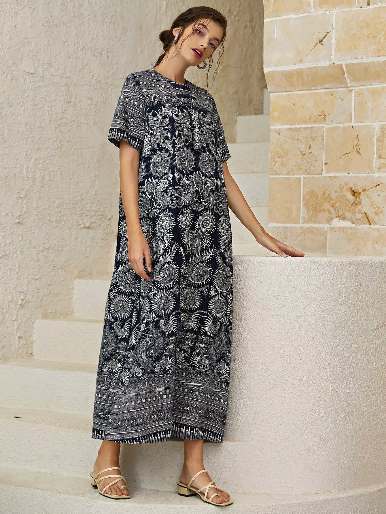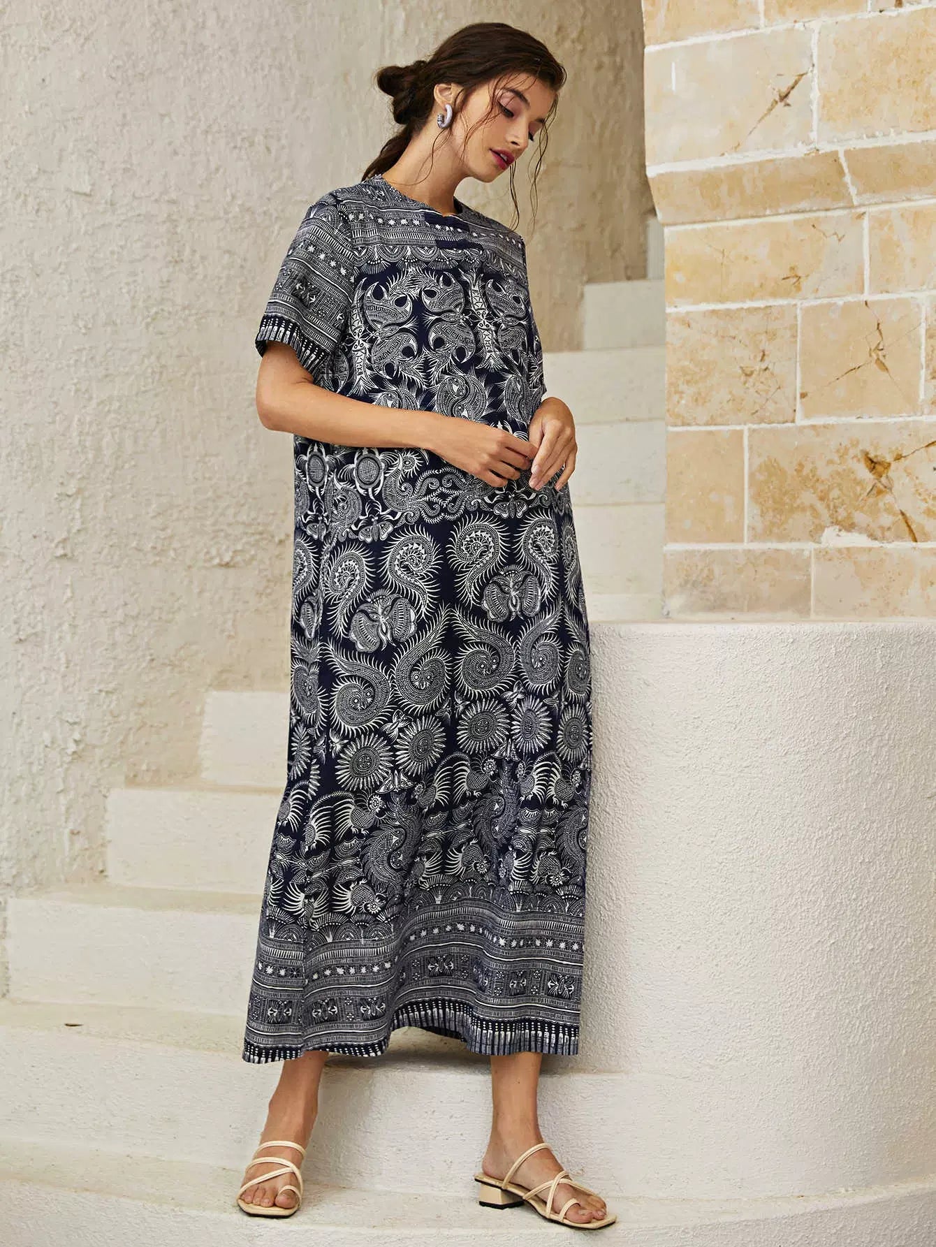 فستان تونيك بياقة دائرية وطبعة بيزلي