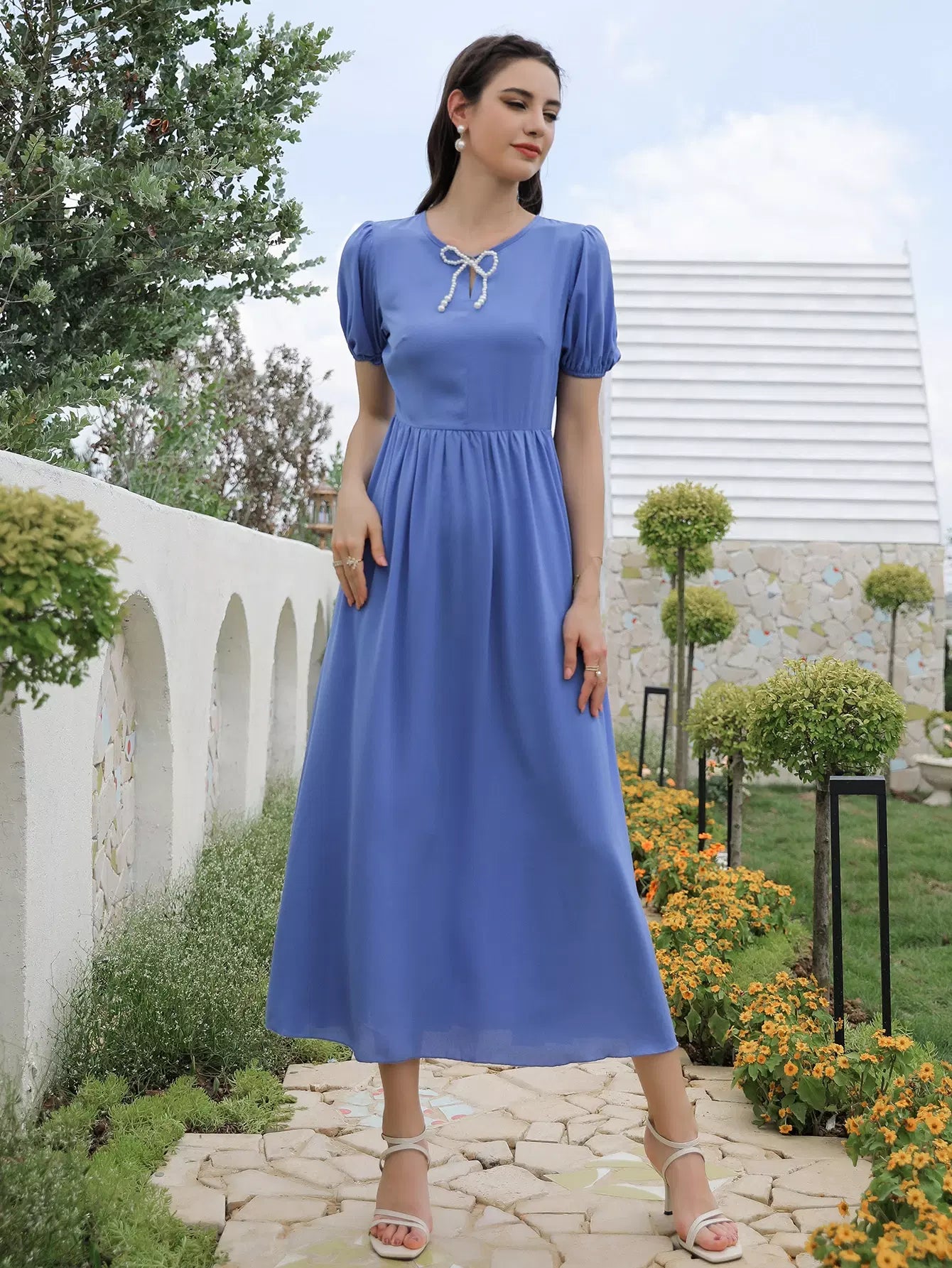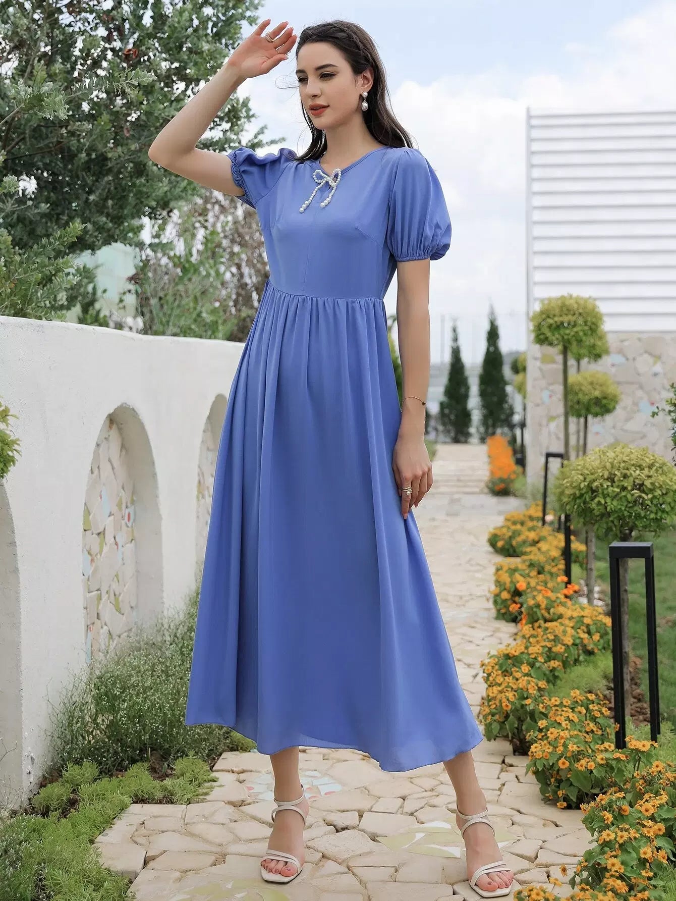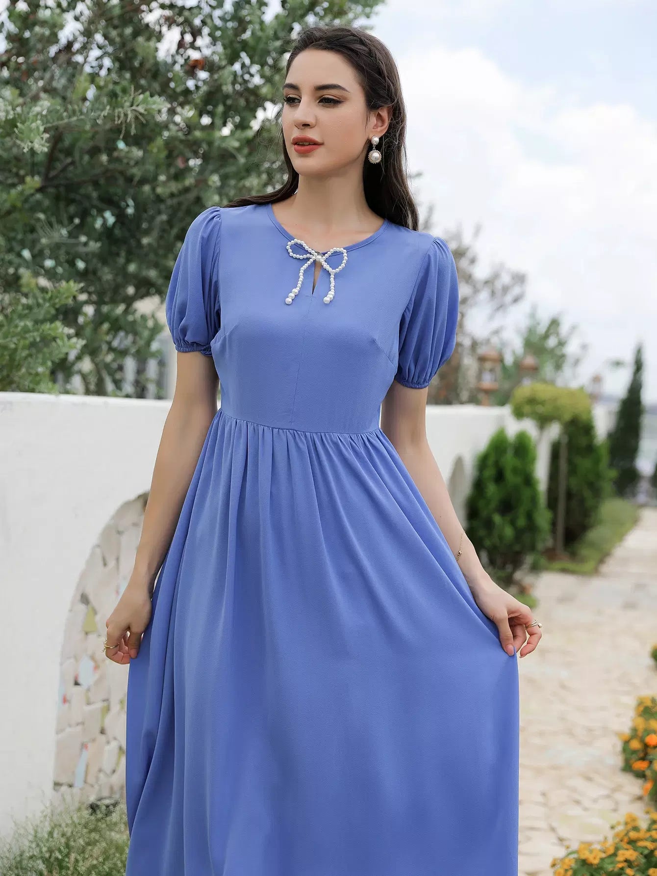 فستان بأكمام منتفخة من اللؤلؤ مطرز بالخرز على شكل حرف A