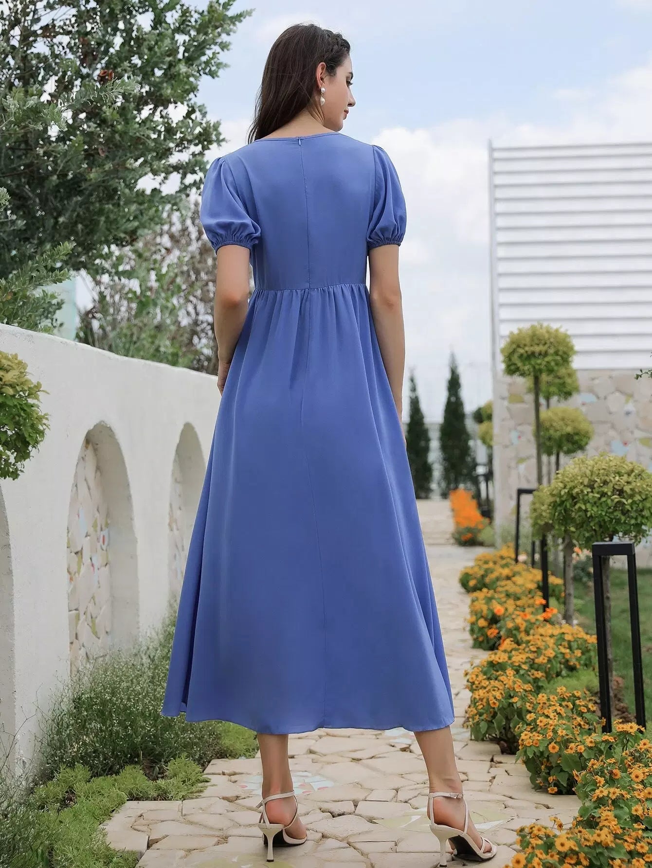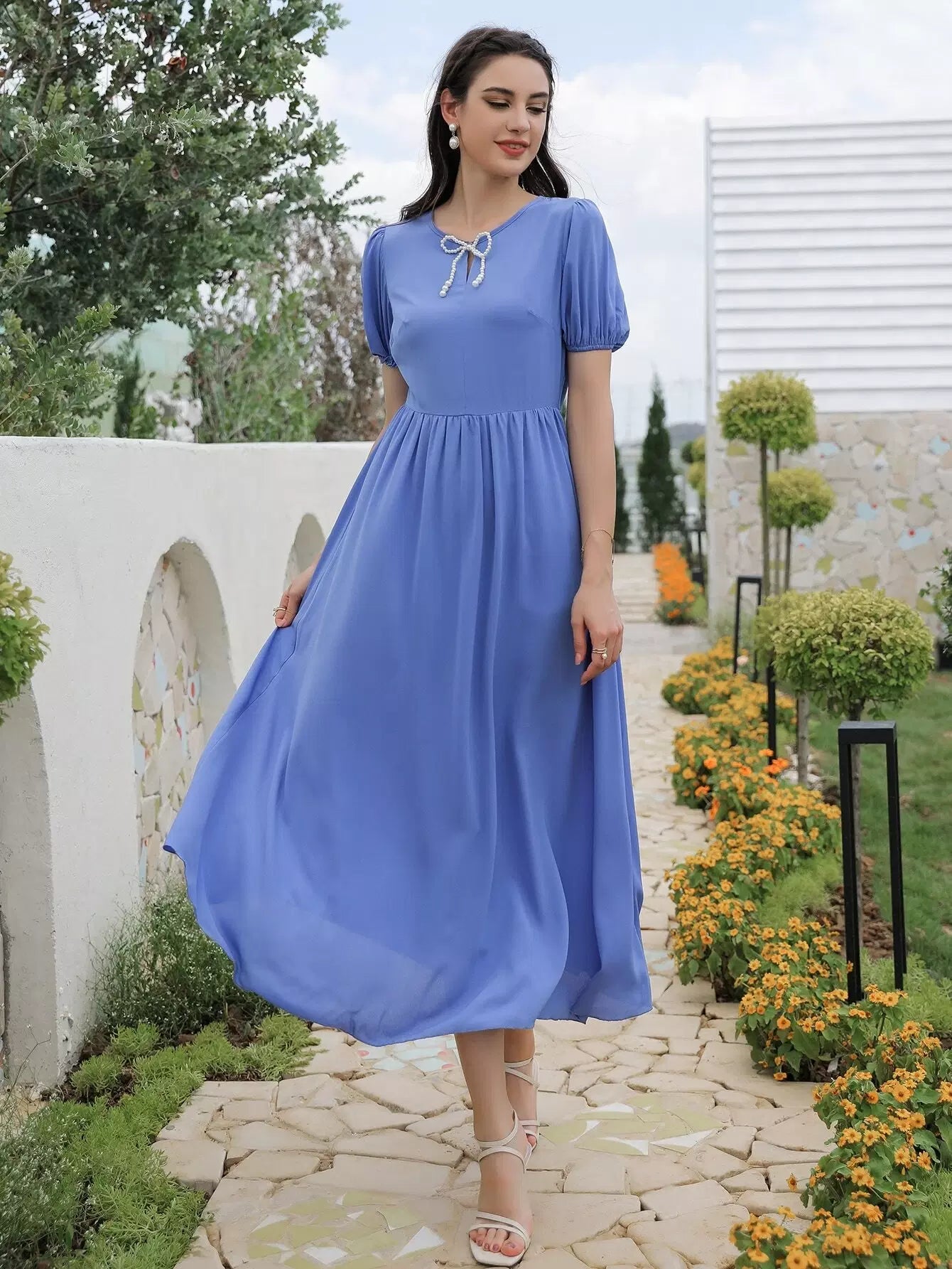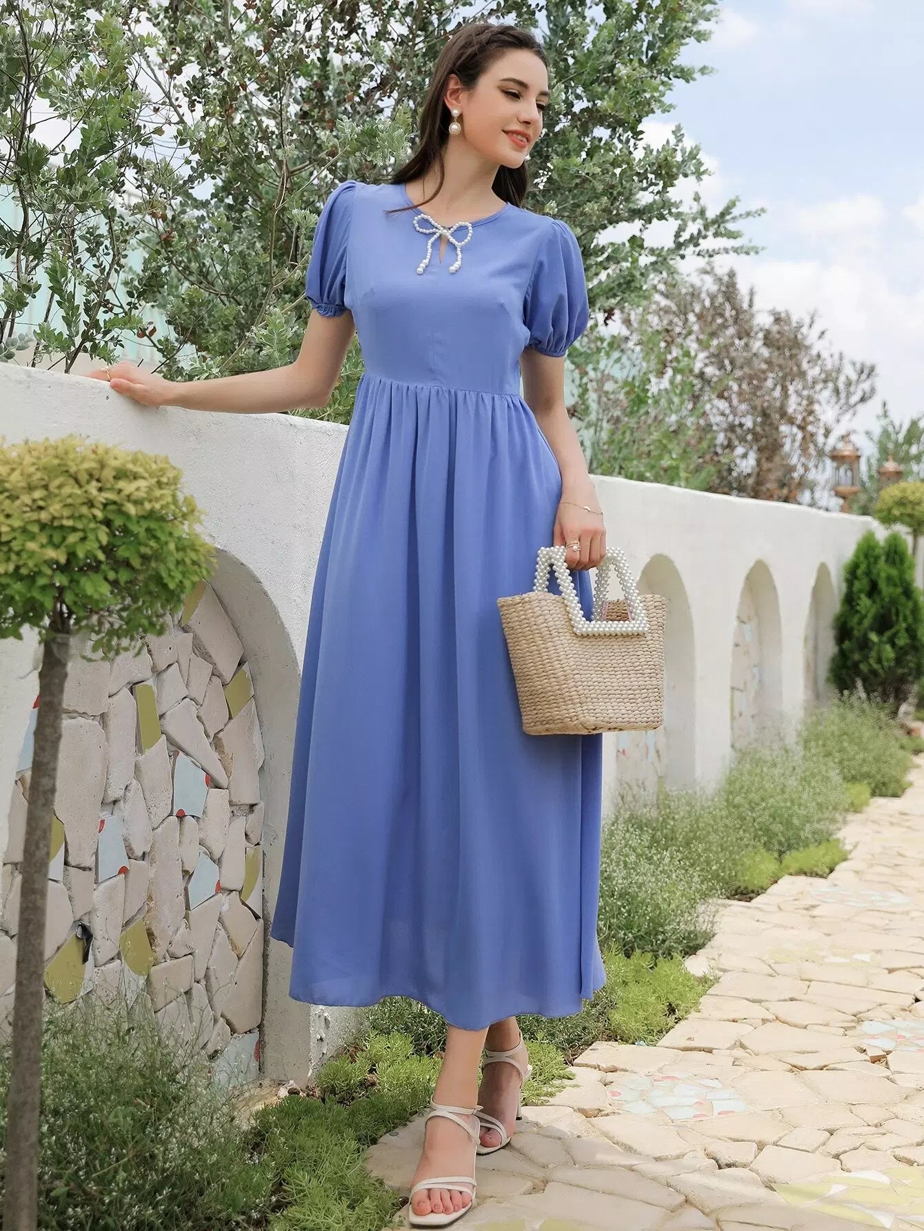 فستان بأكمام منتفخة من اللؤلؤ مطرز بالخرز على شكل حرف A