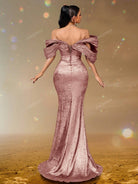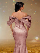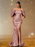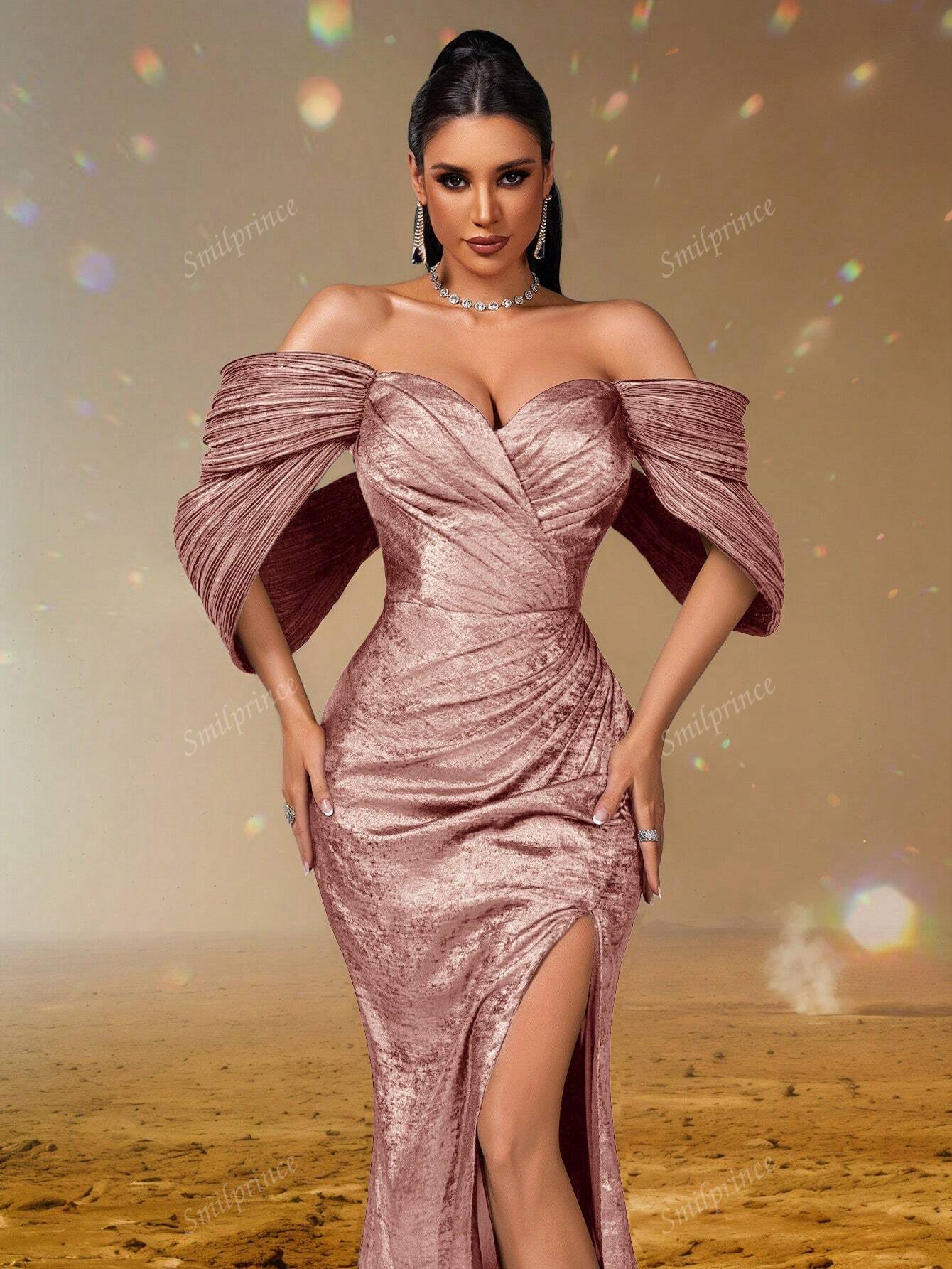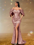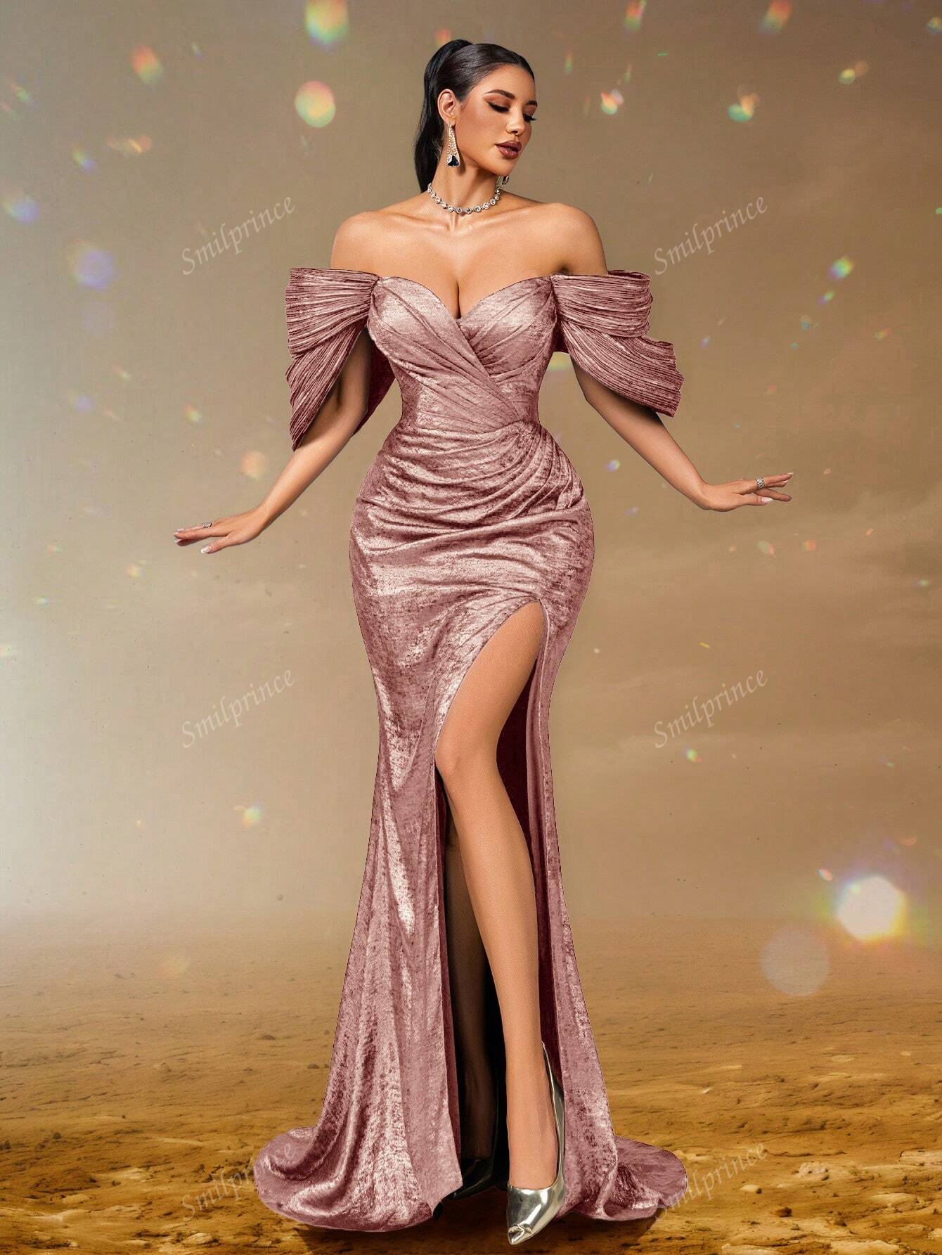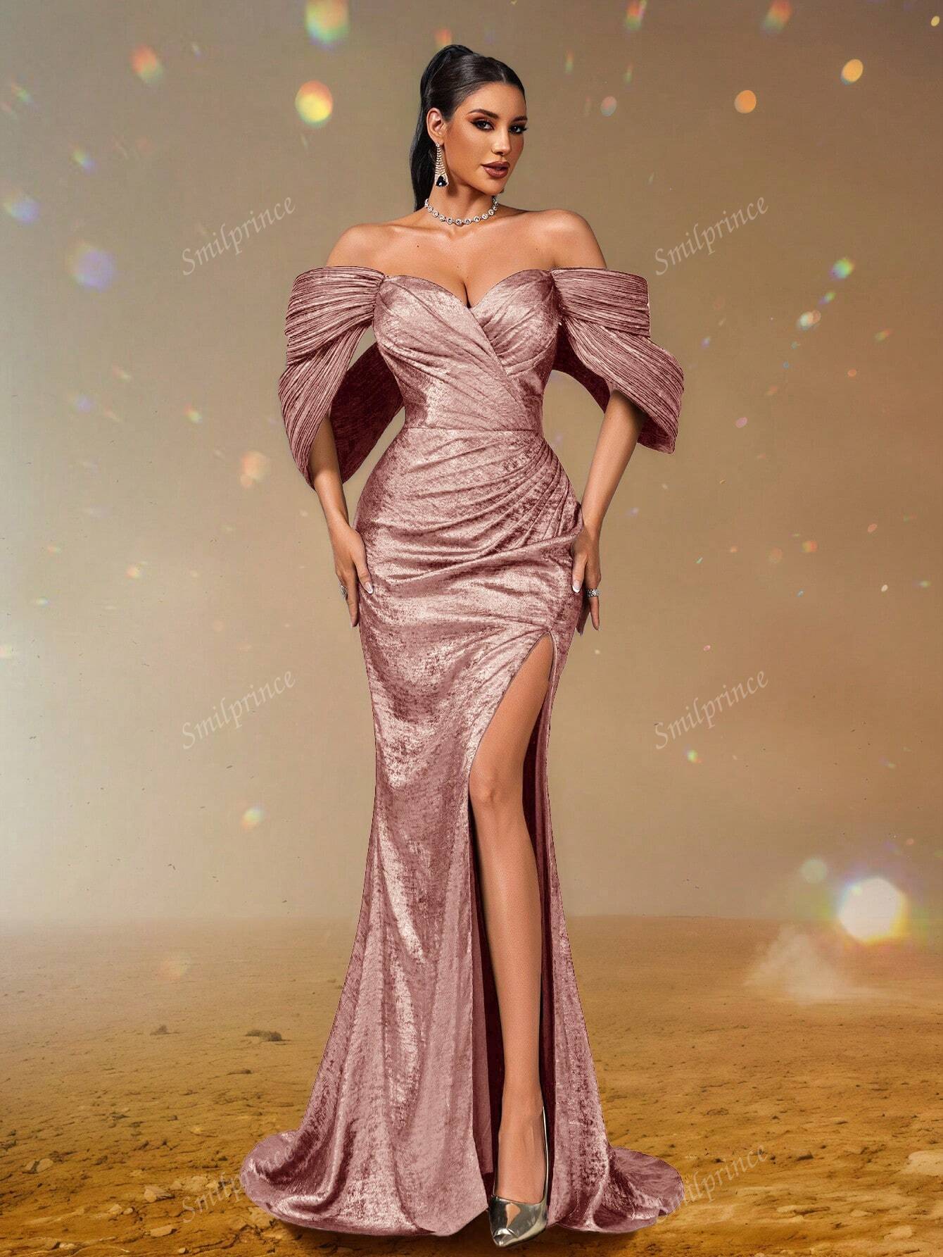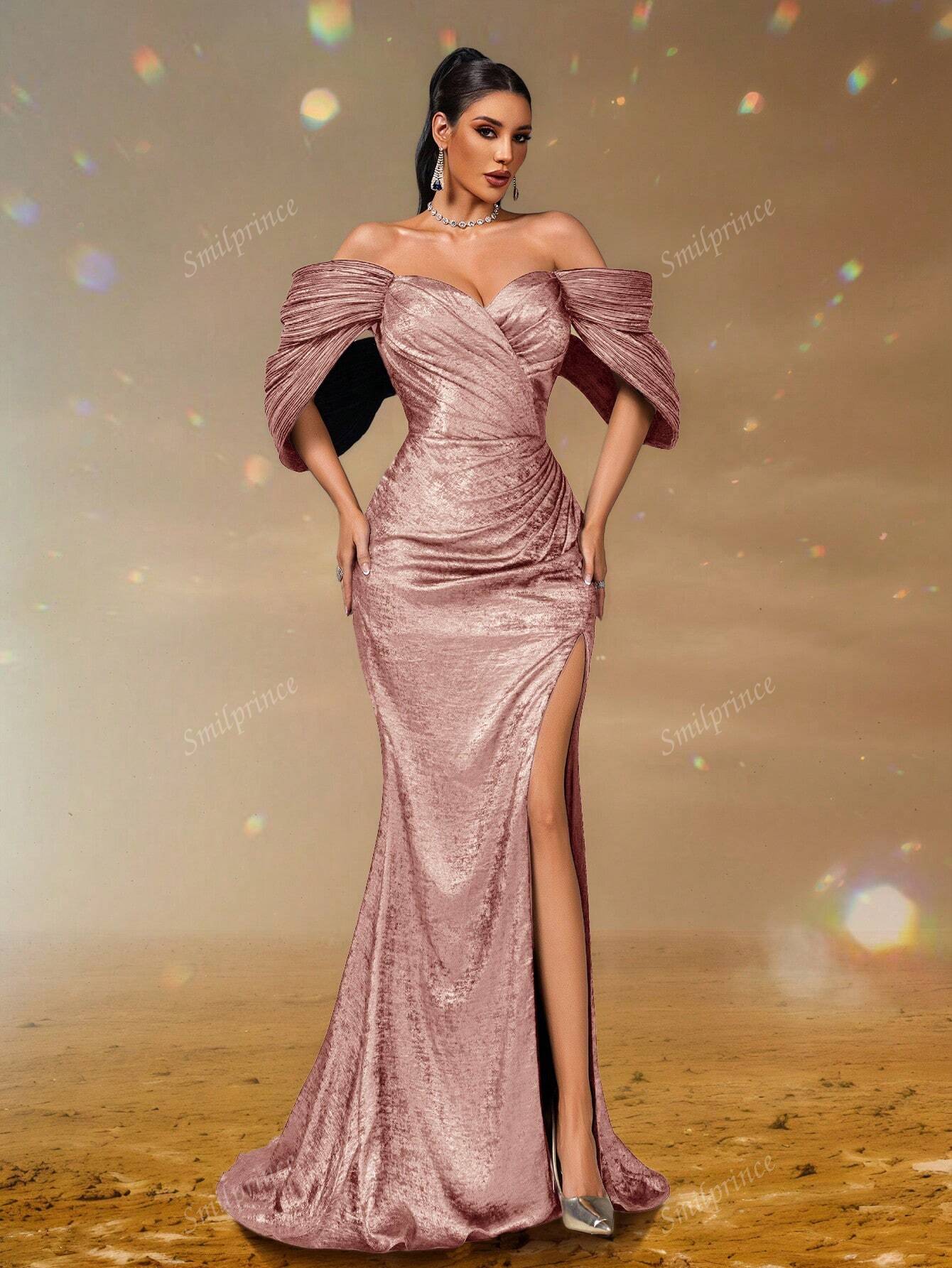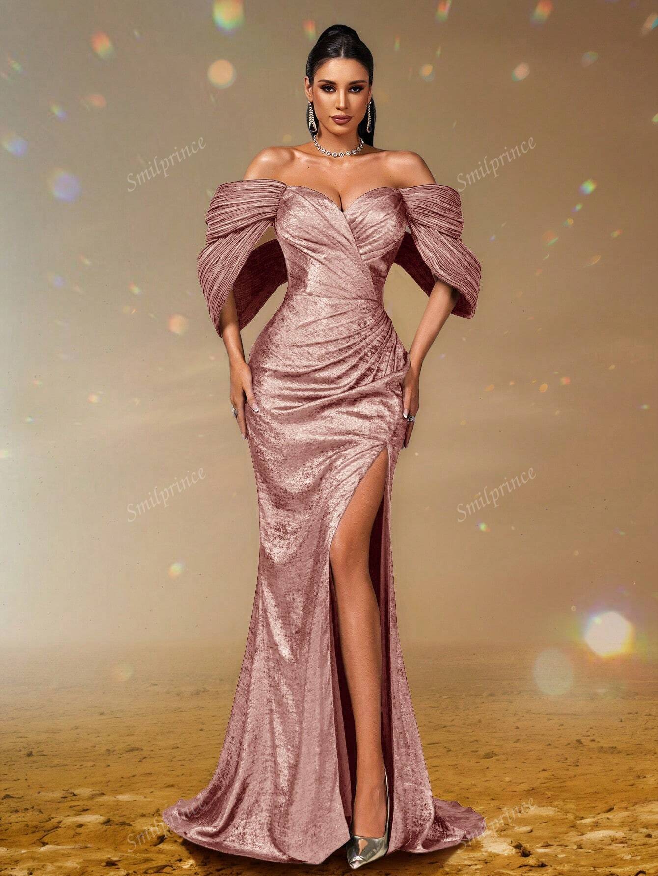 Smilprince Glamorous Pink Off-The-Shoulder Mermaid Gown With Ruched Bodice And High Slit, Formal Evening